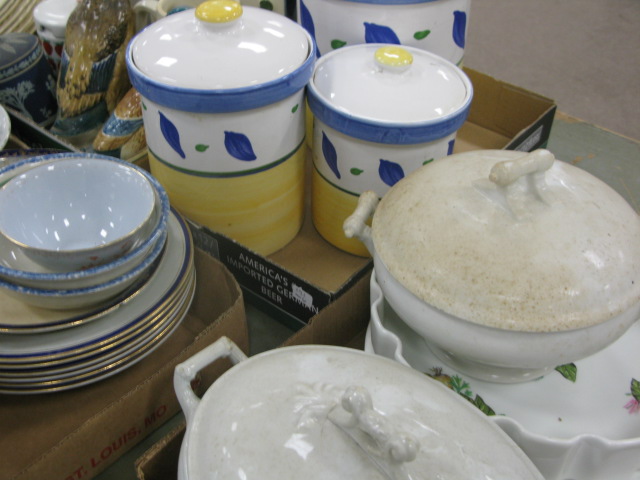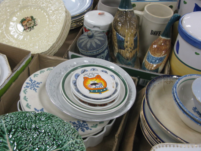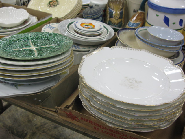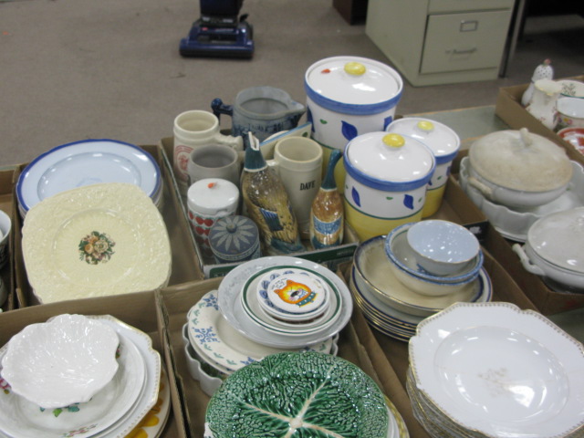 Nine box lots various china and glassware, small groupings of plates, birds figures, Wedgwood, bowls, dishes, canister set