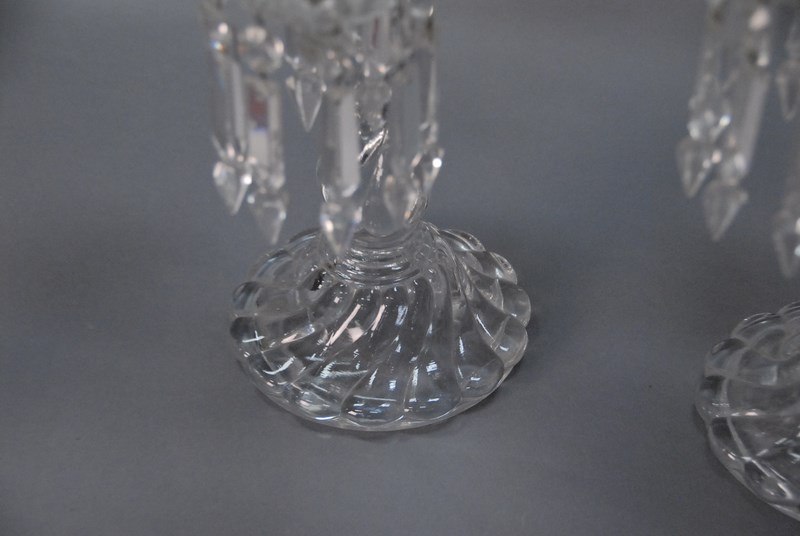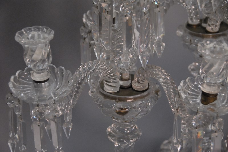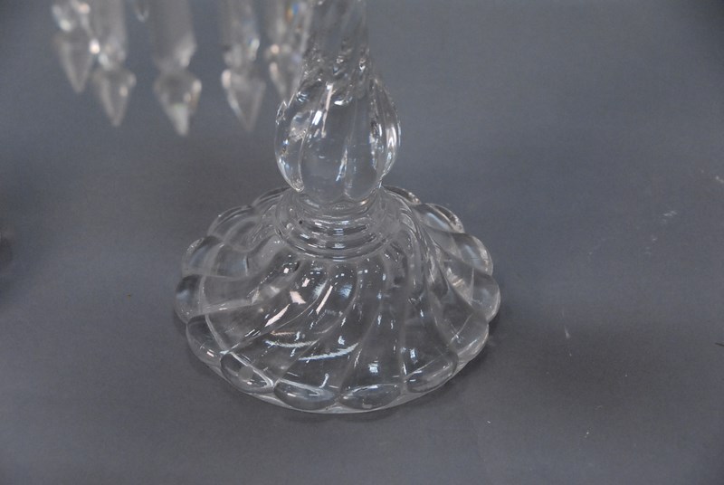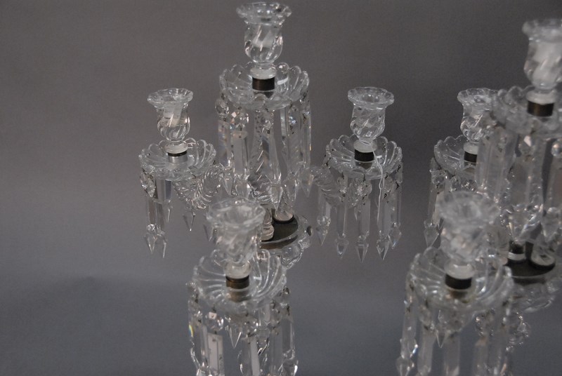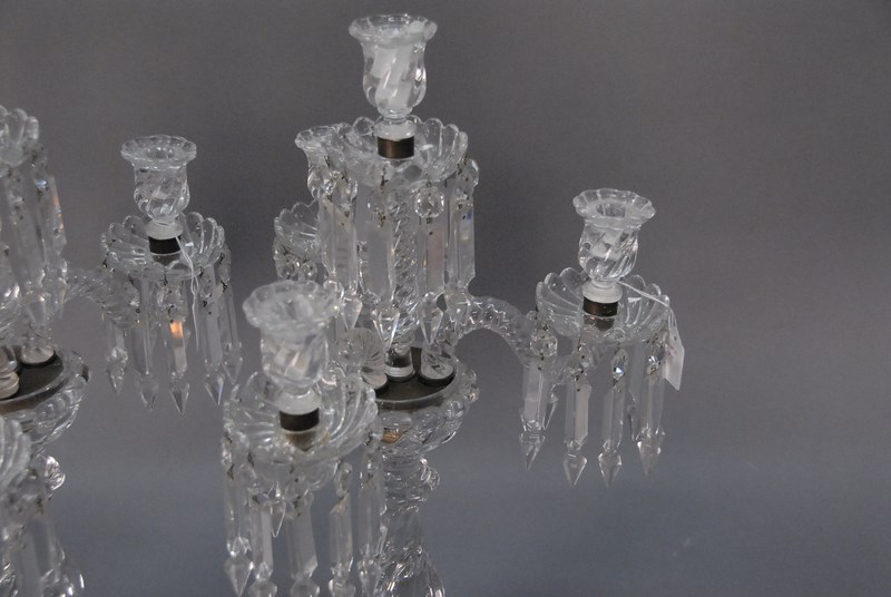 Lot 136: Pair of Baccarat crystal four light candelabra with twisted stems one bobach with large chip. ht. 22in.