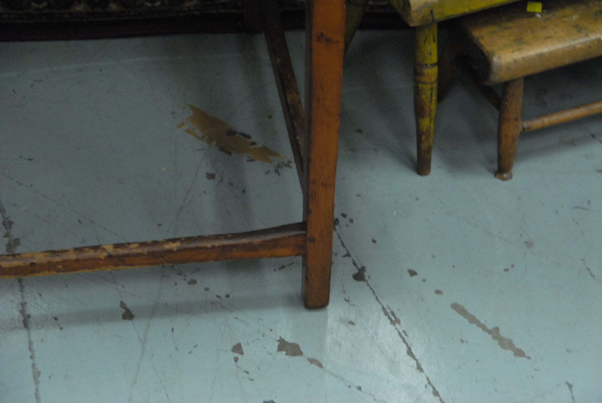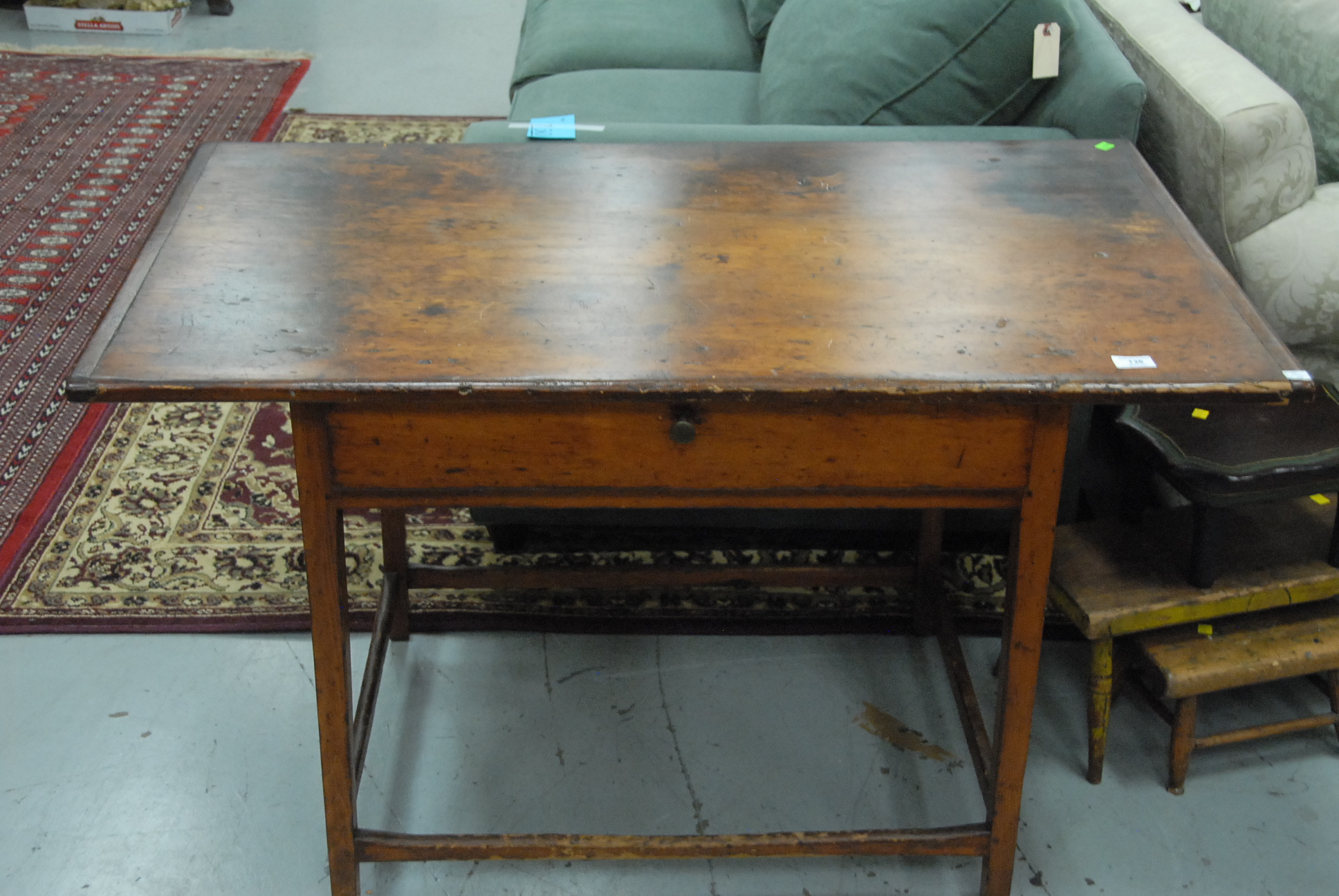 Lot 136: Primitive pine one drawer table with bread board top and stretcher base, ht. 28in. lg. 46in. dp. 28in.