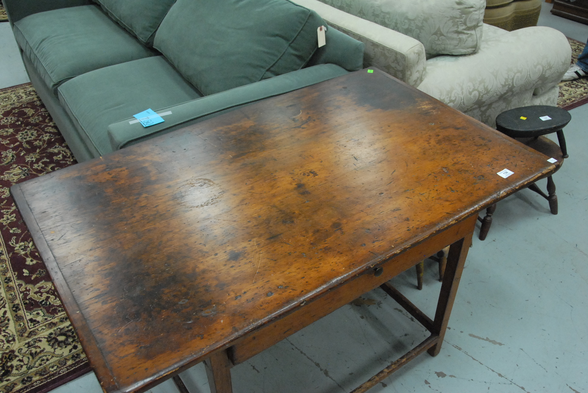 Primitive pine one drawer table with bread board top and stretcher base, ht. 28in. lg. 46in. dp. 28in.
