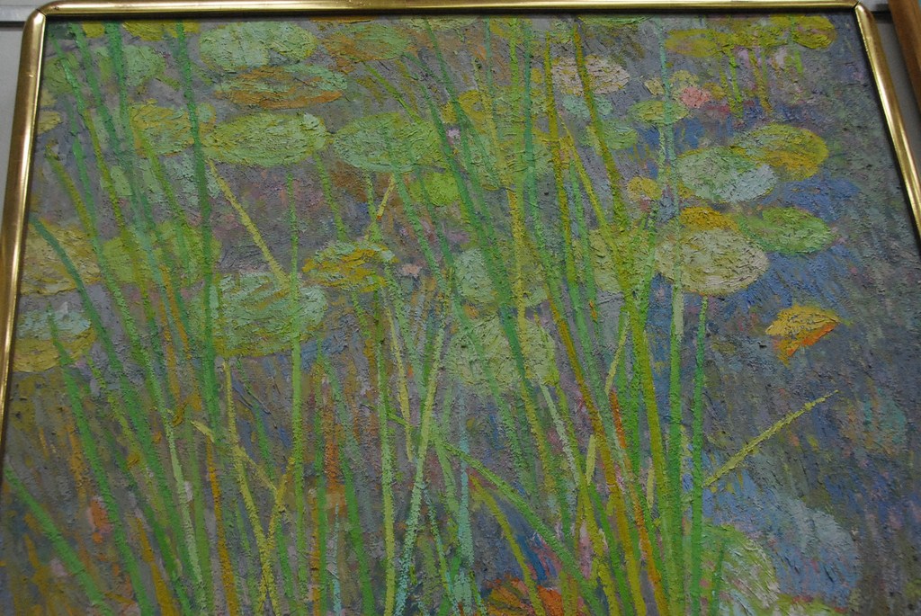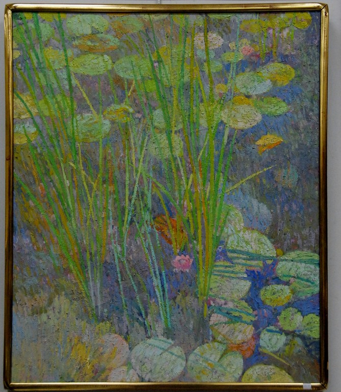 Lot 136: Sam Barber American b.1943 LILY PADS ON POND’S EDGE oil on board signed lower right S Barber 83 48 x 40