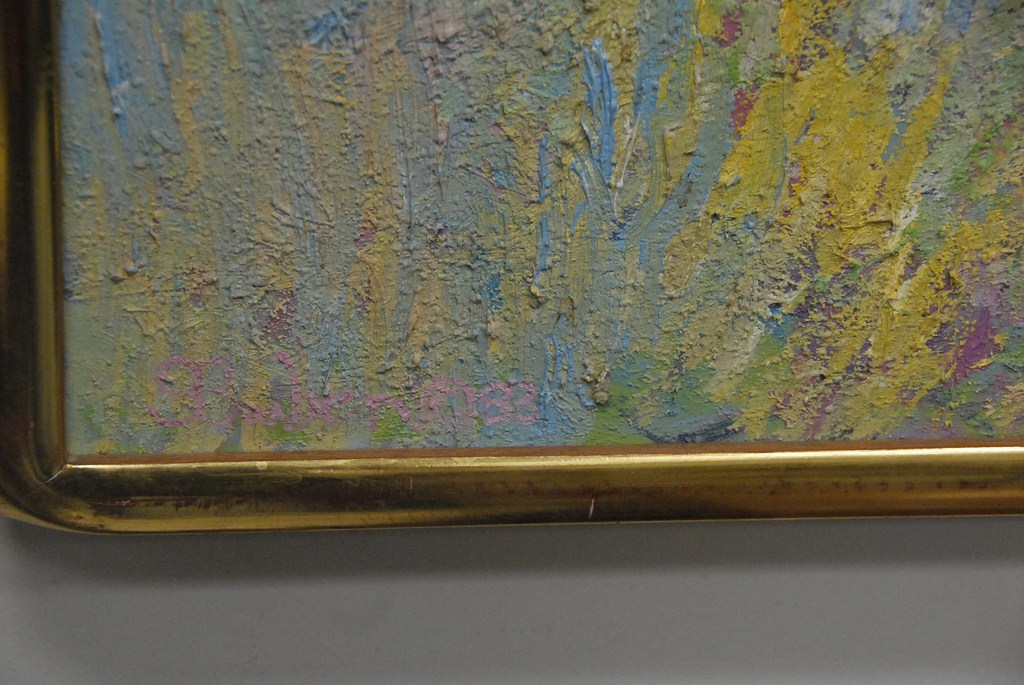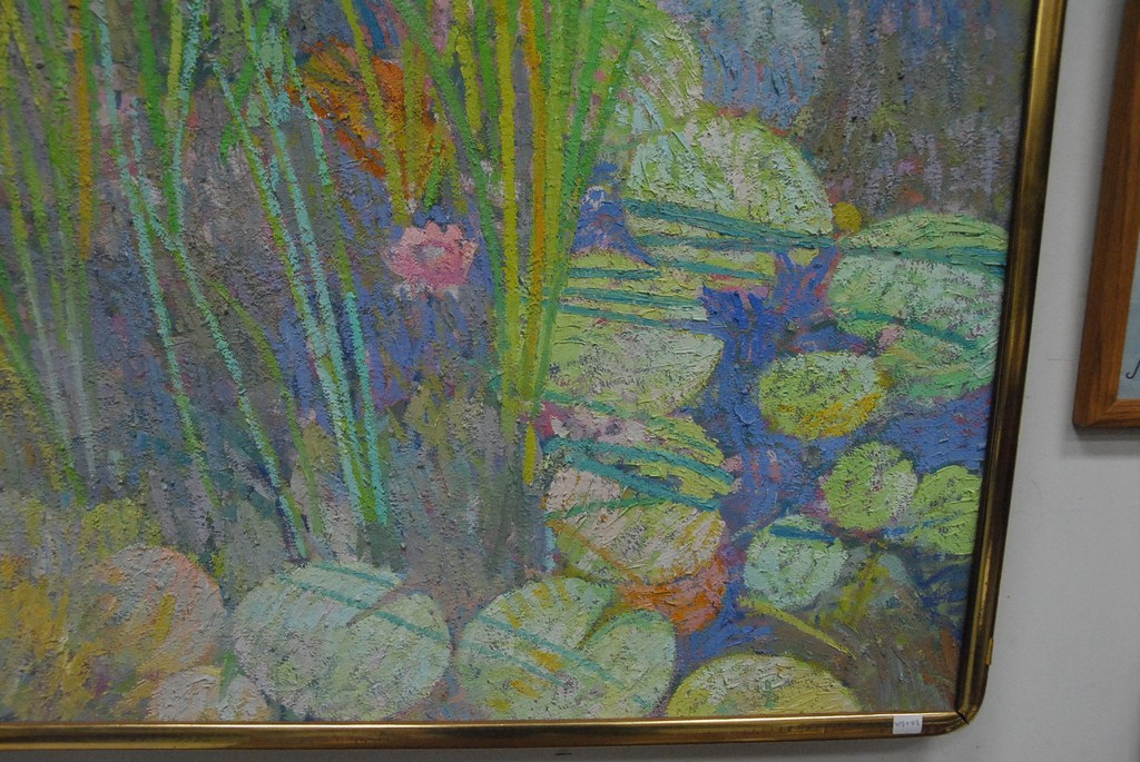 Sam Barber American b.1943 LILY PADS ON POND’S EDGE oil on board signed lower right S Barber 83 48 x 40