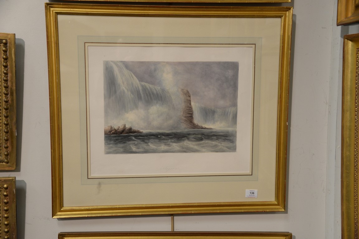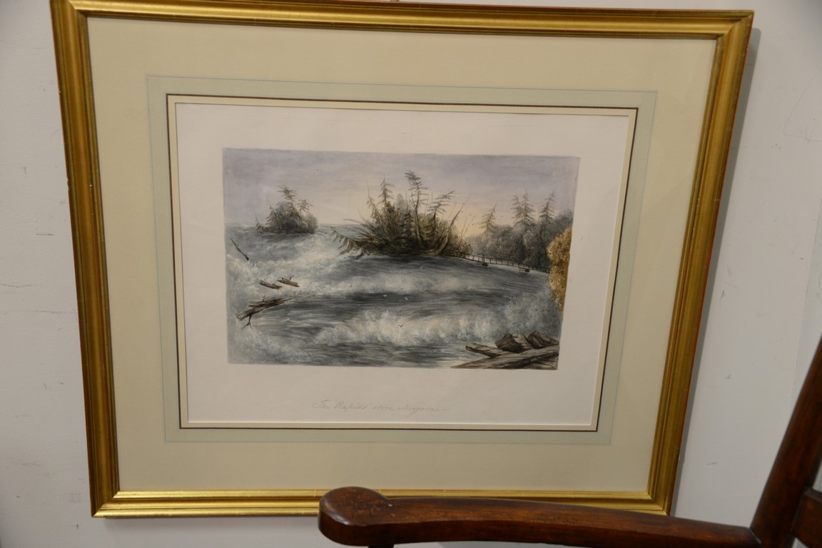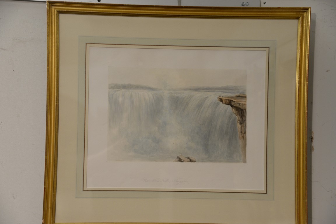 Lot 136: Set of three unsigned watercolor on paper, Niagara, Horseshoe Falls Niagara, and The Rapids above Niagara, sight size 15 1/2 x 19 1…