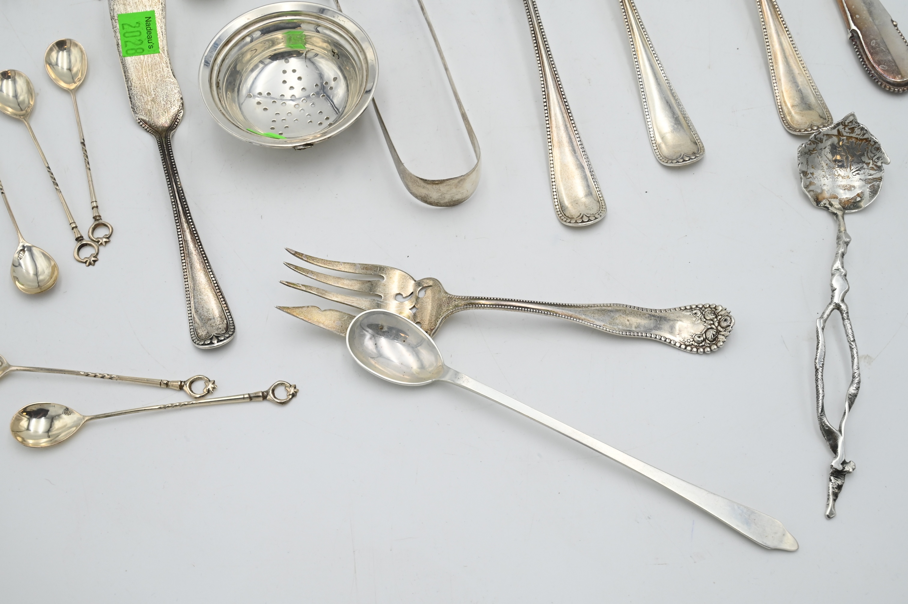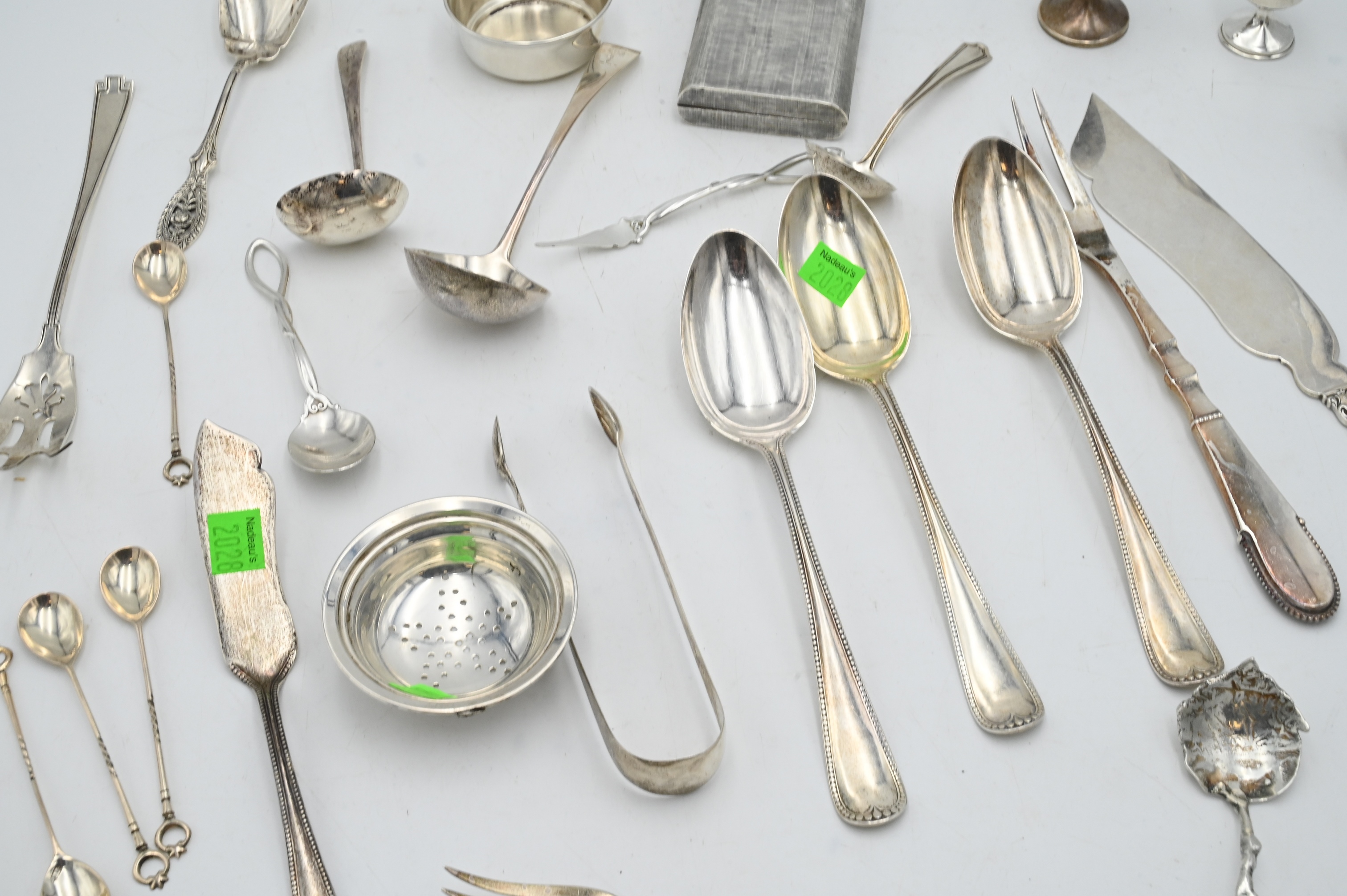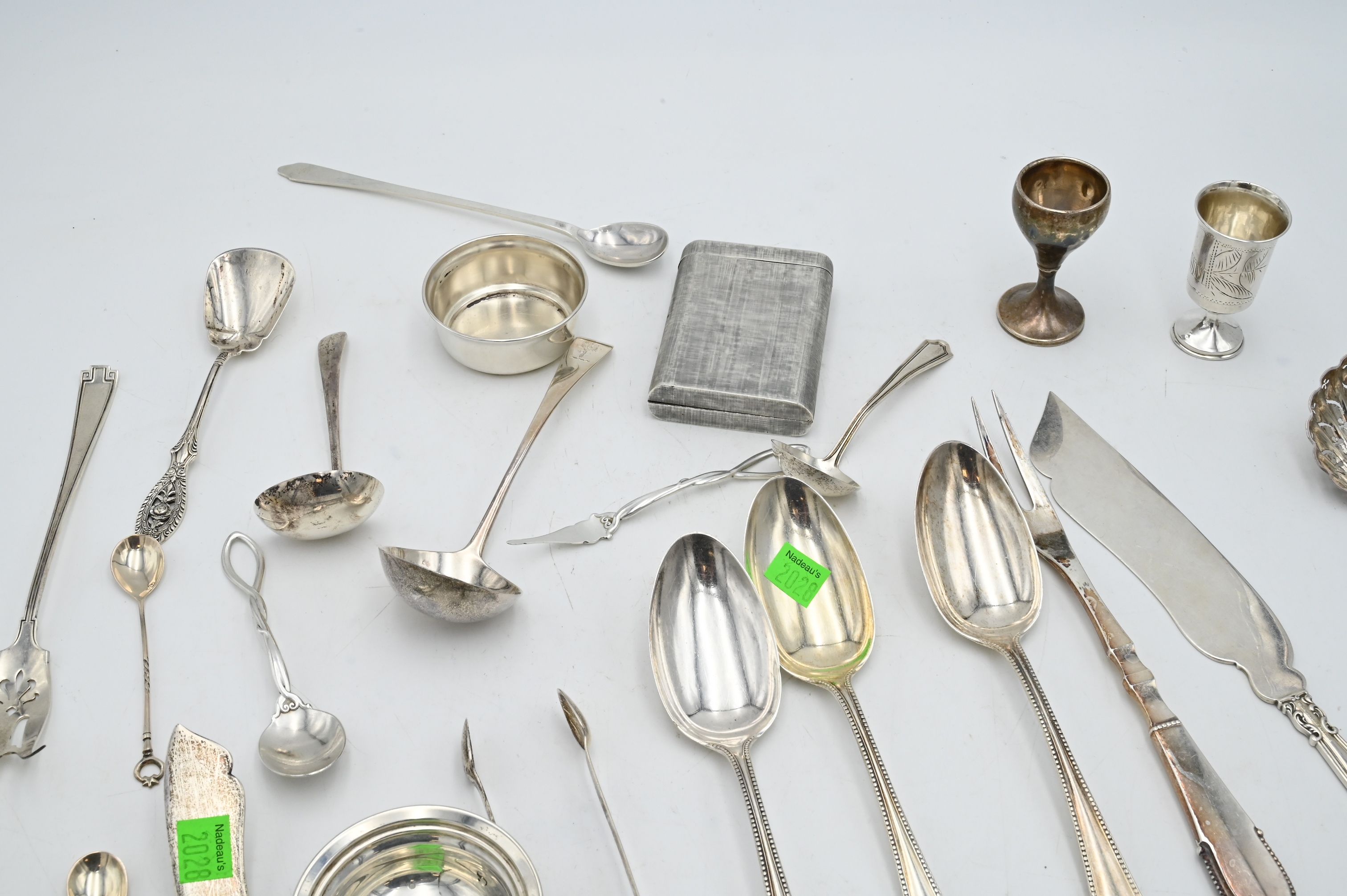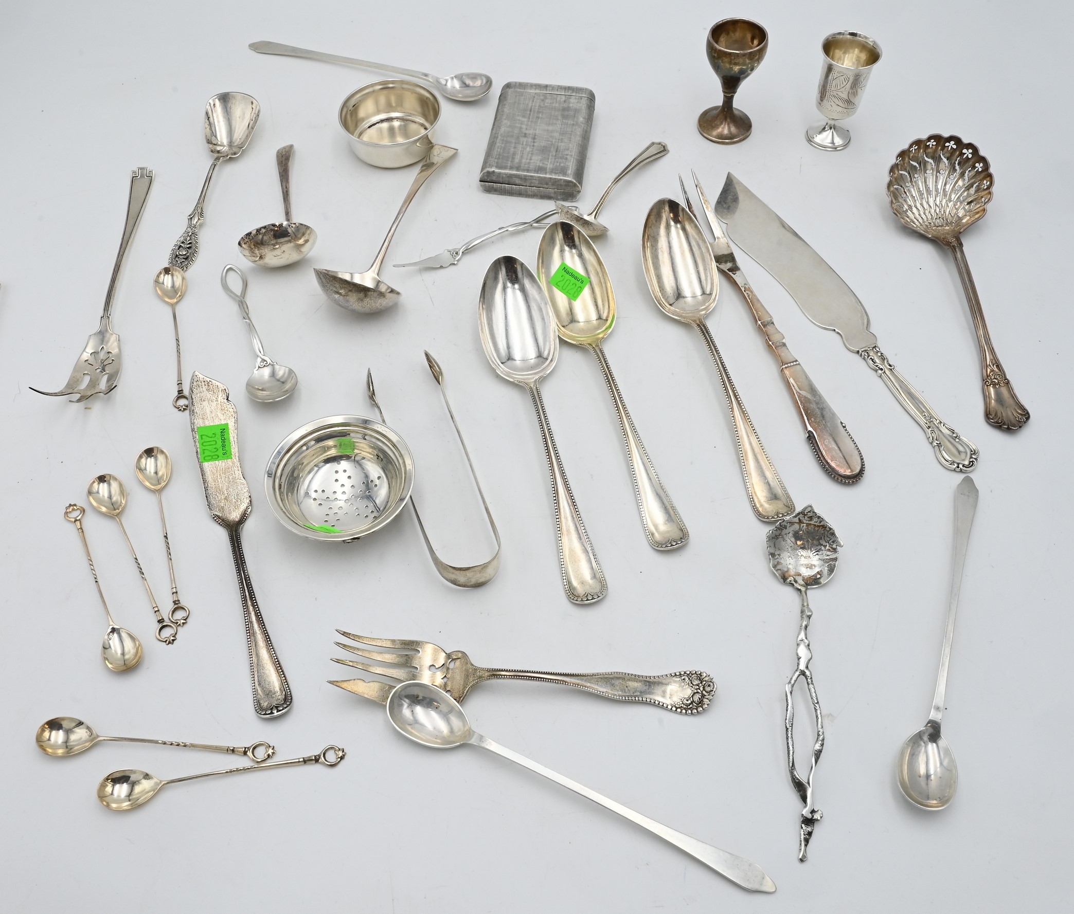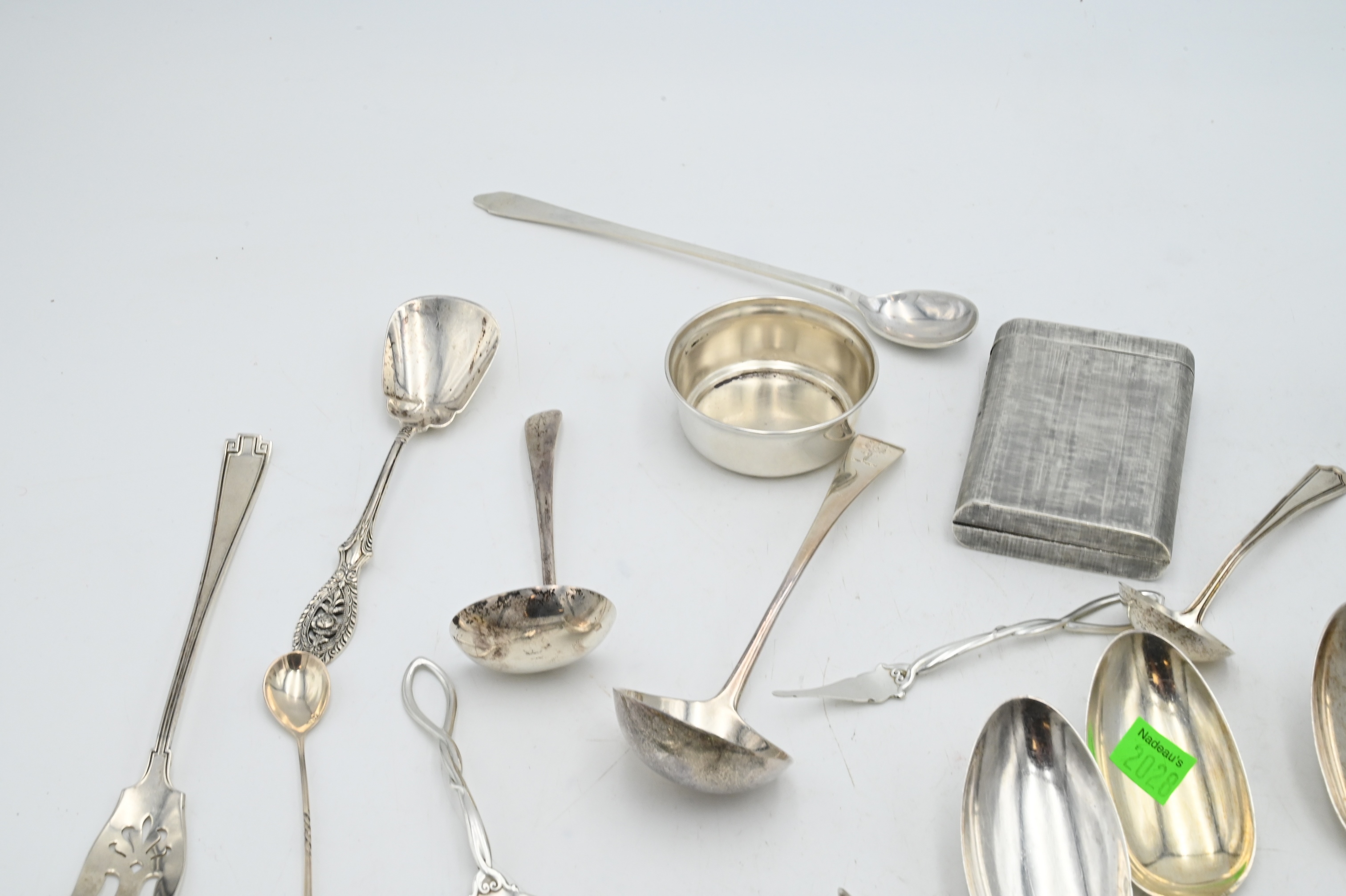 Silver Lot, to include three Tiffany spoons, cigarette case, serving spoons, etc… 34.5 t.oz, Provenance: Julius H Jacobson II a Fifth Avenue Estate.