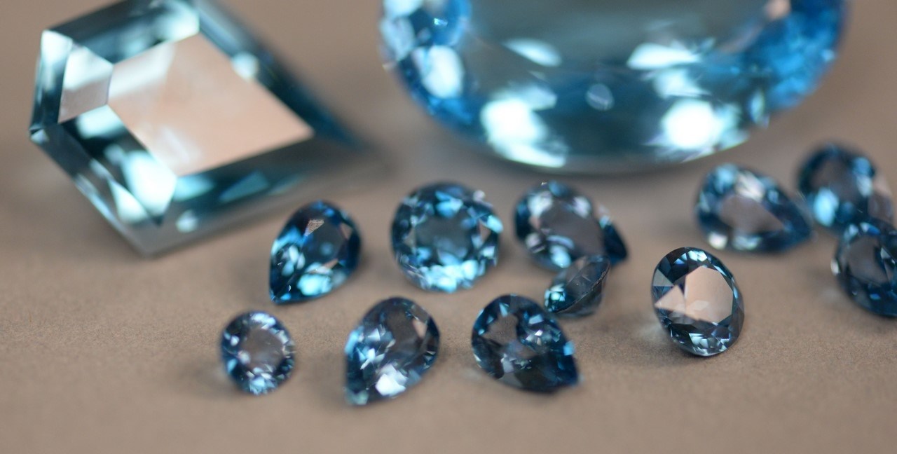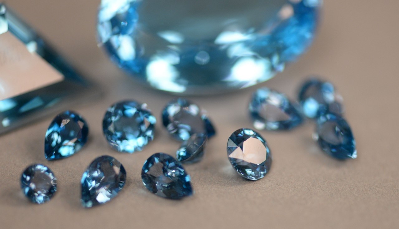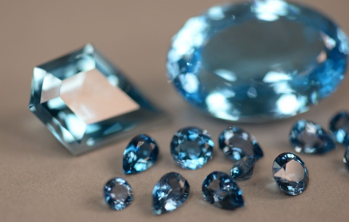 Thirteen loose blue stones including large trapezoid, oval aquamarine color, and eleven medium blue stones.