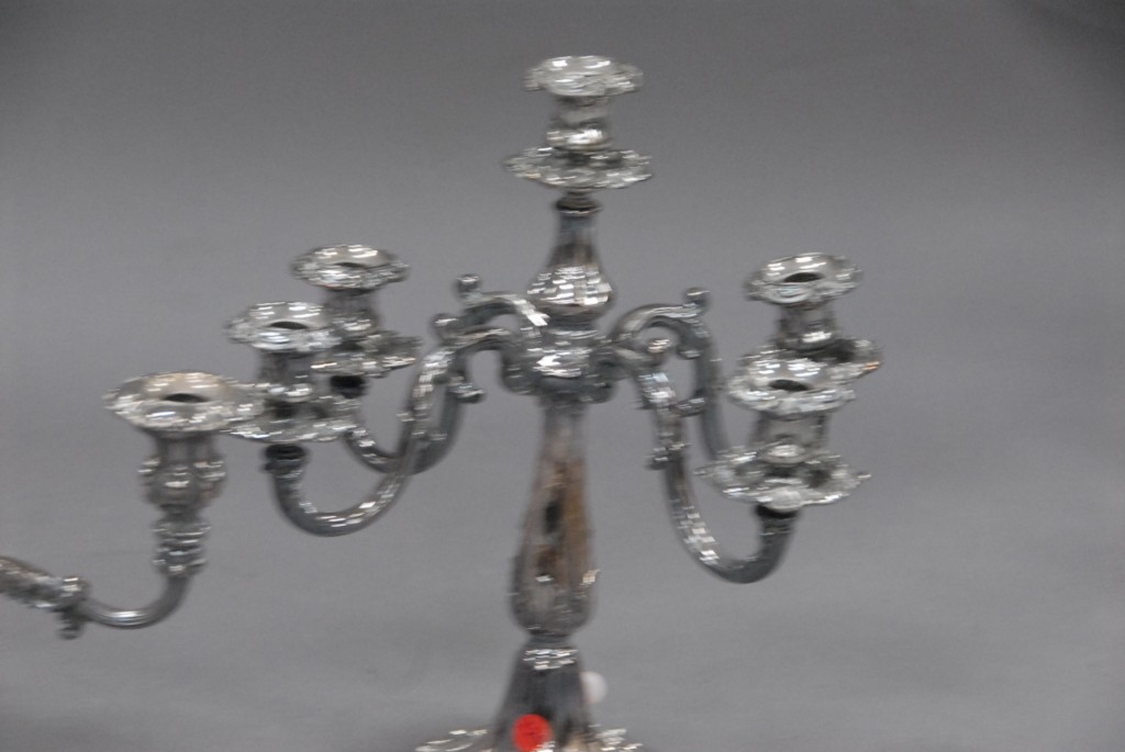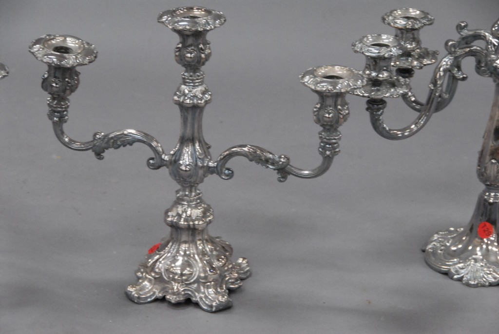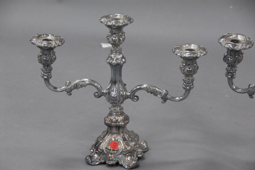 Three piece lot of silverplate two 3 lite candelabra and a 5 lite candelabra one arm as is.