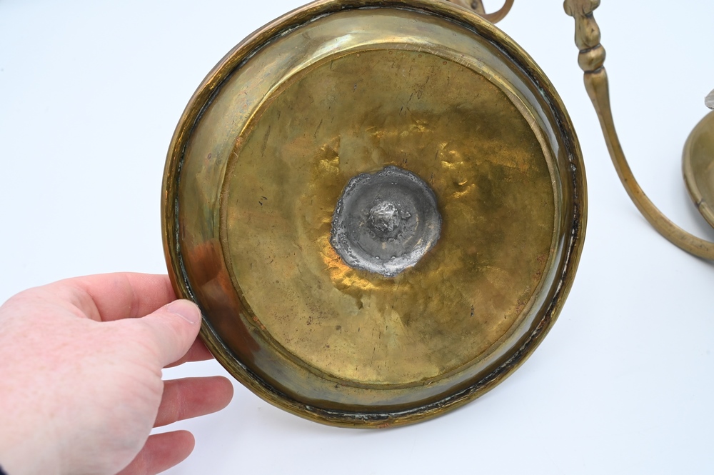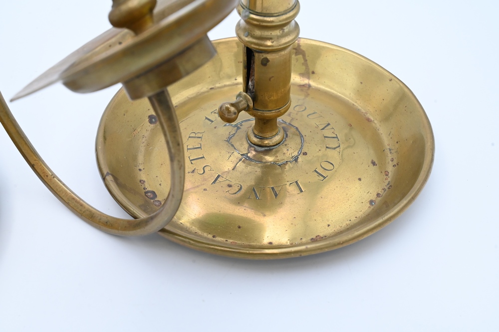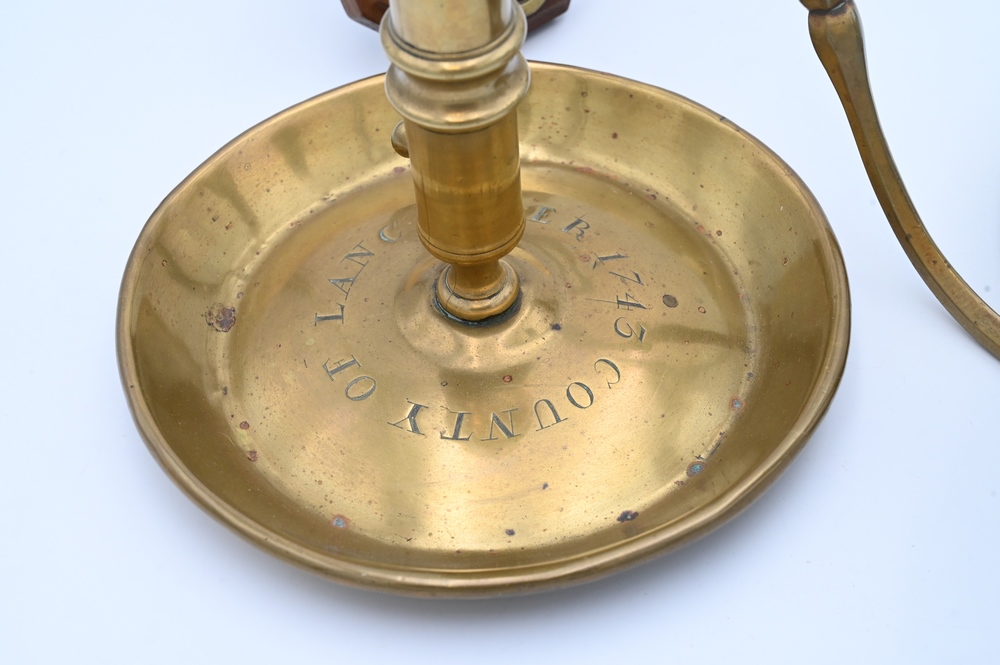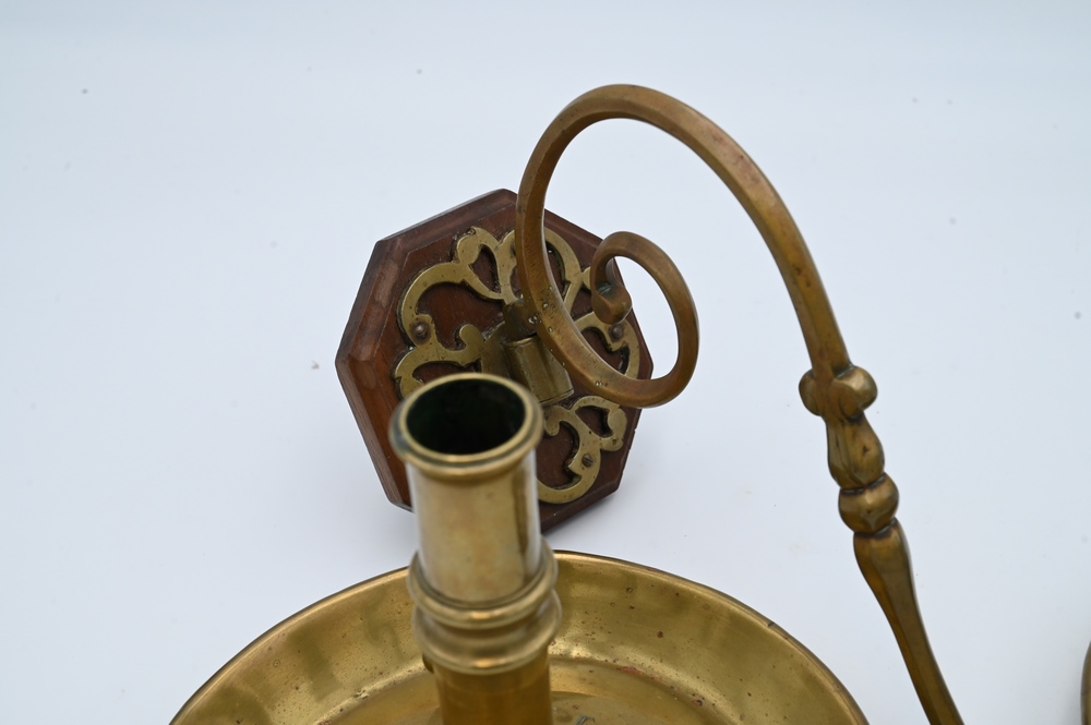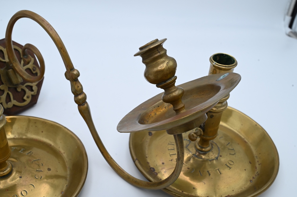 Lot 136: Three Piece Lot, to include a pair of push-up candlesticks marked County of Lancaster, 1743, height 6 inches; along with a single arm sconce.