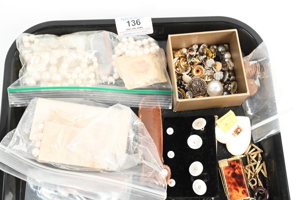 Lot 136: Tray Lot of Miscellaneous Jewelry Items, to include Cartier sterling cufflinks (as is), sterling pins, pearls, cigar tip with gold r…