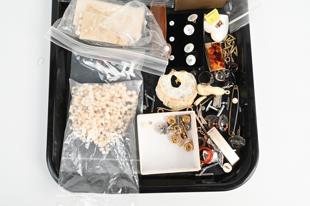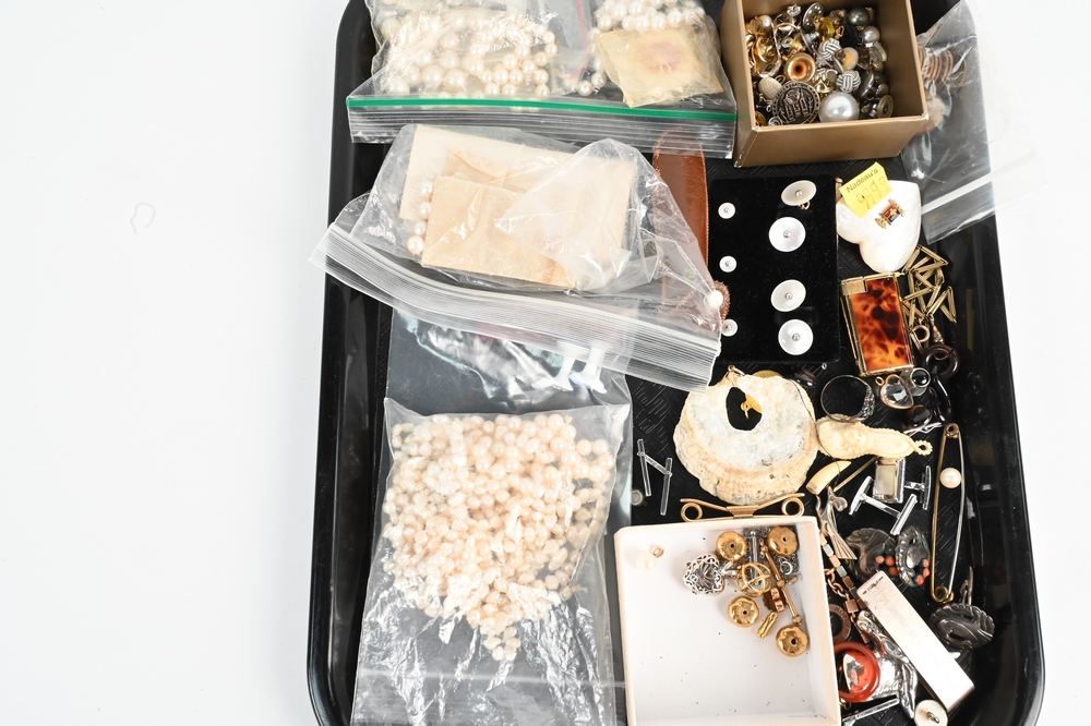 Tray Lot of Miscellaneous Jewelry Items, to include Cartier sterling cufflinks (as is), sterling pins, pearls, cigar tip with gold ring, miscellaneous silver, gold, and metal earring backs, clips, etc.