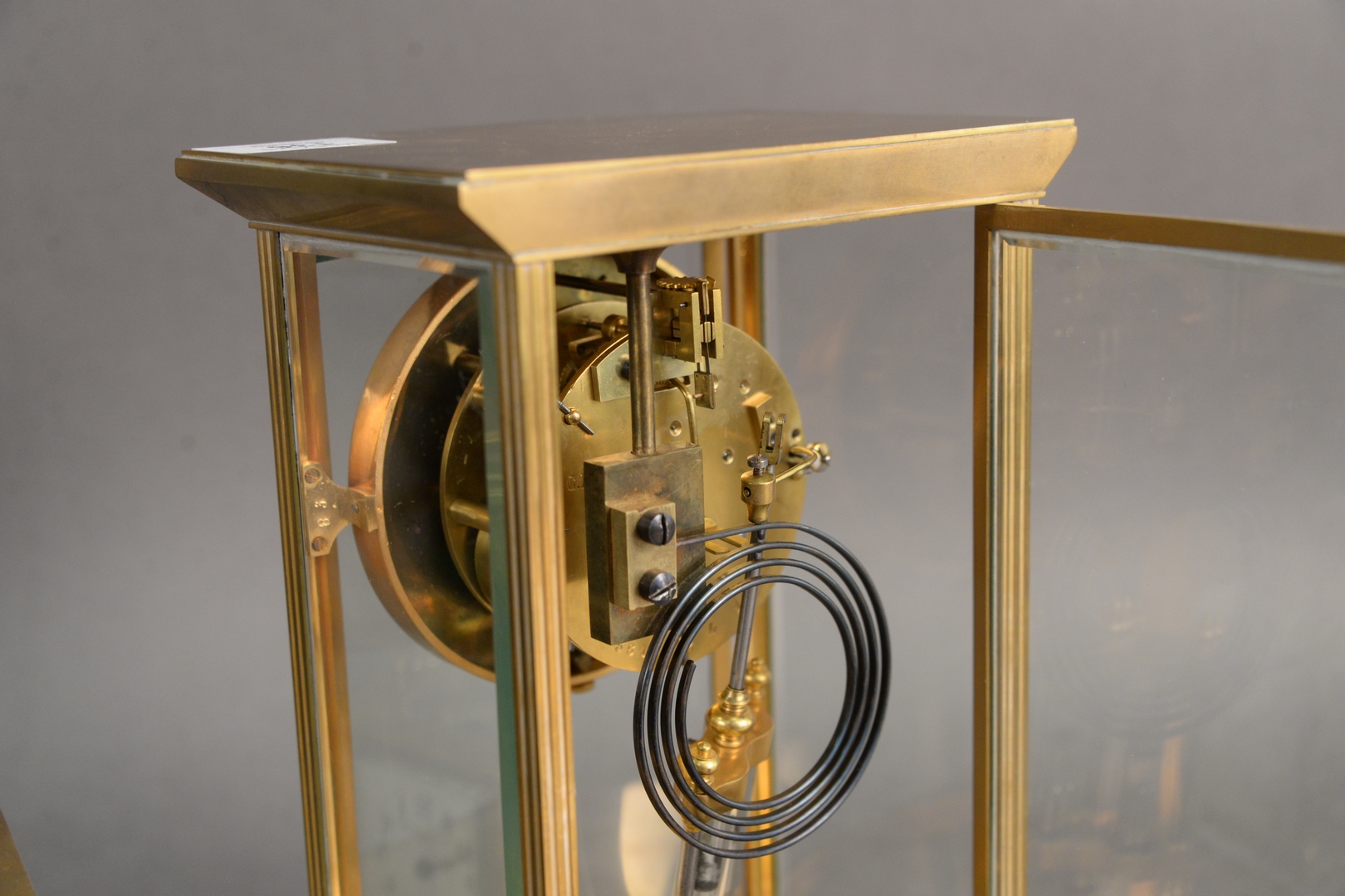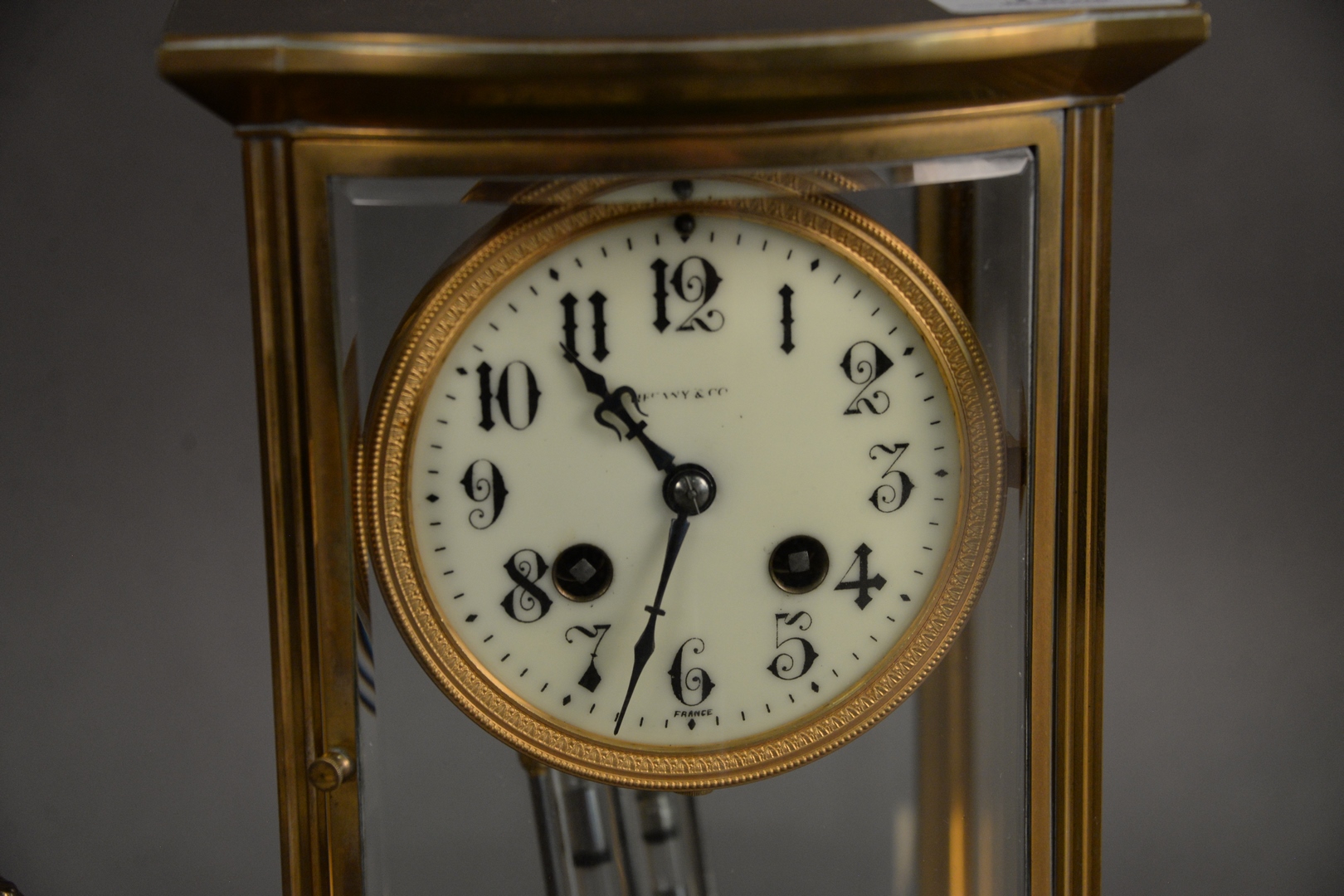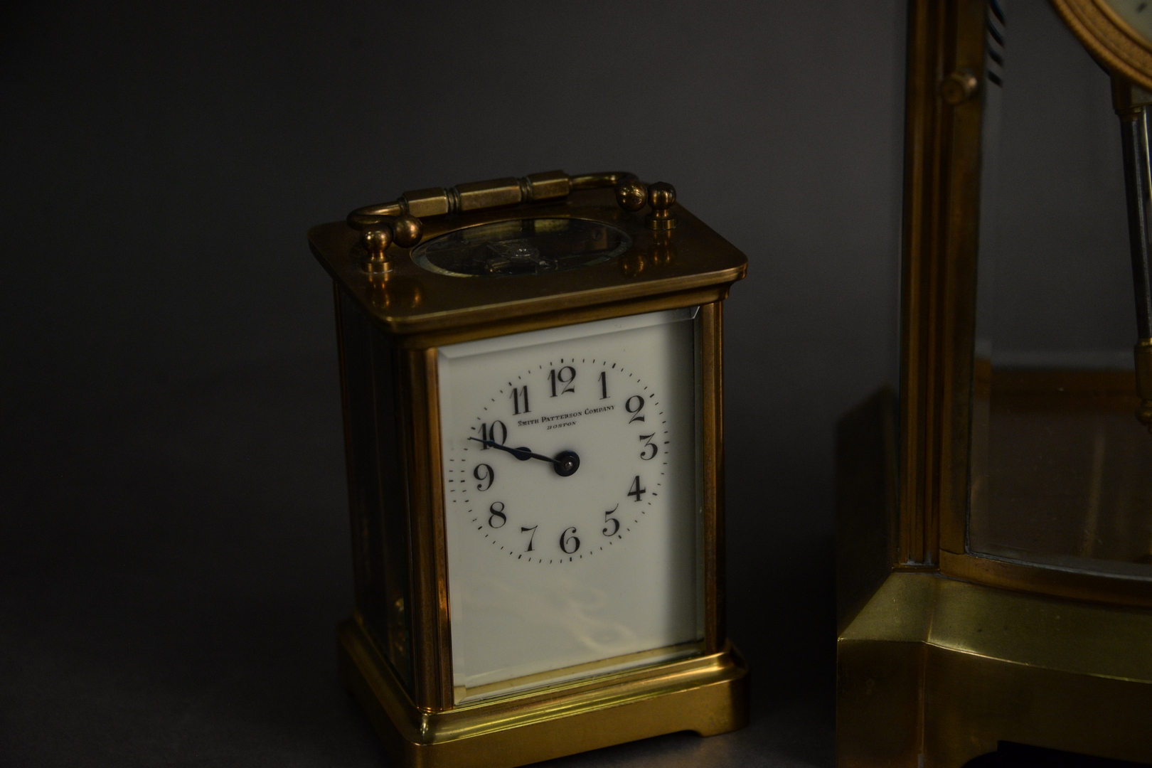 Lot 136: Two Brass and Glass Tiffany Regulator Clocks, along with Smith & Patterson, Company, Boston carriage clock, height 10 1/2 inches, width 6 1/2 inches, depth 4 inches.