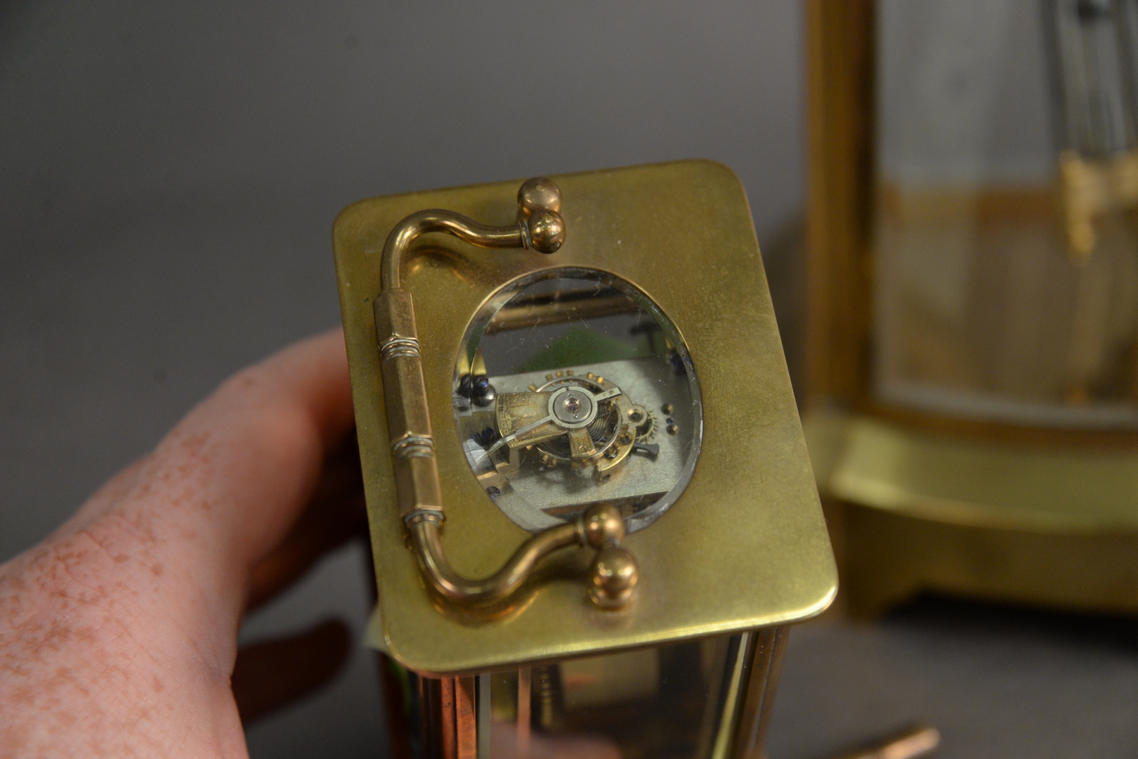 Two Brass and Glass Tiffany Regulator Clocks, along with Smith & Patterson, Company, Boston carriage clock, height 10 1/2 inches, width 6 1/2 inches, depth 4 inches.