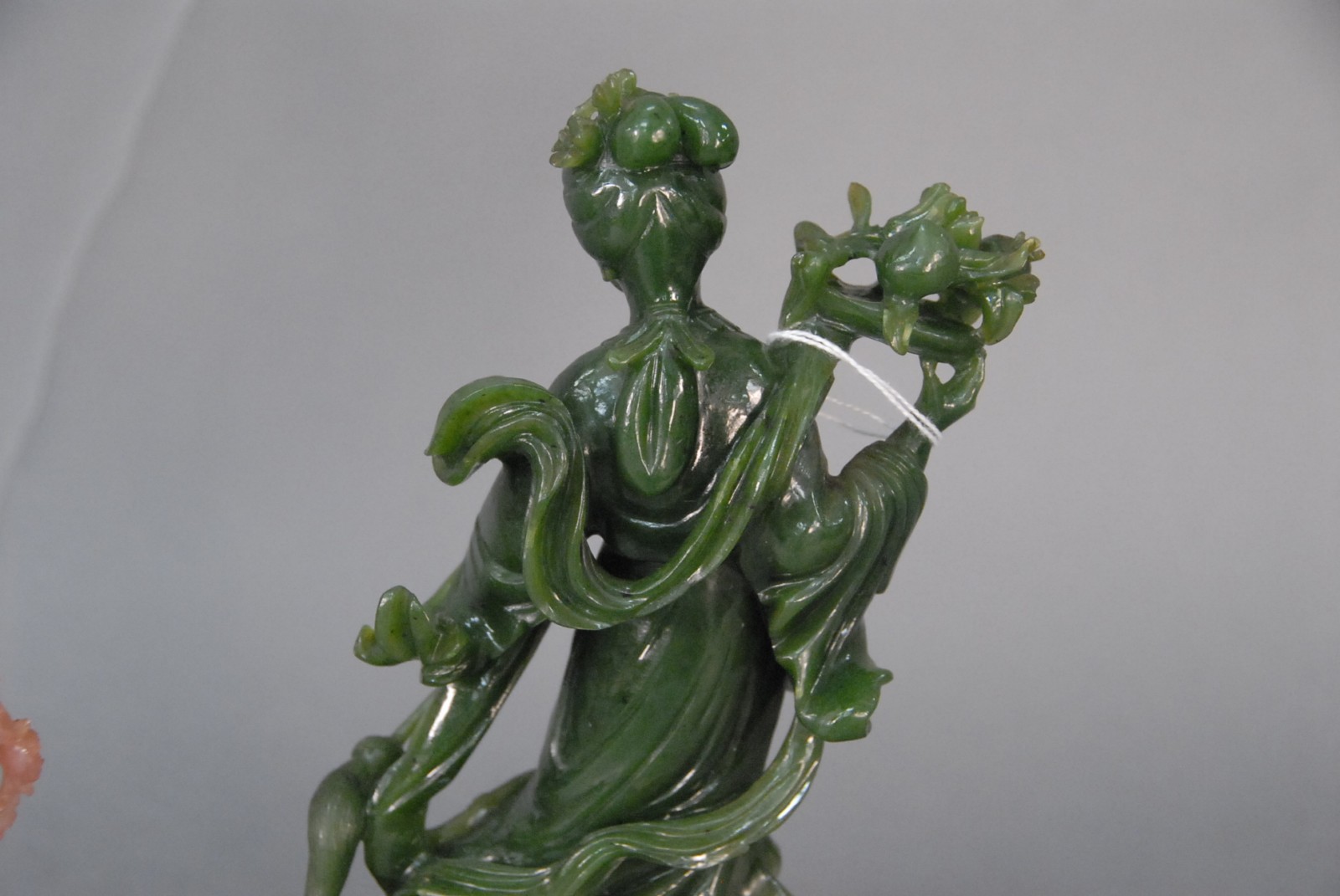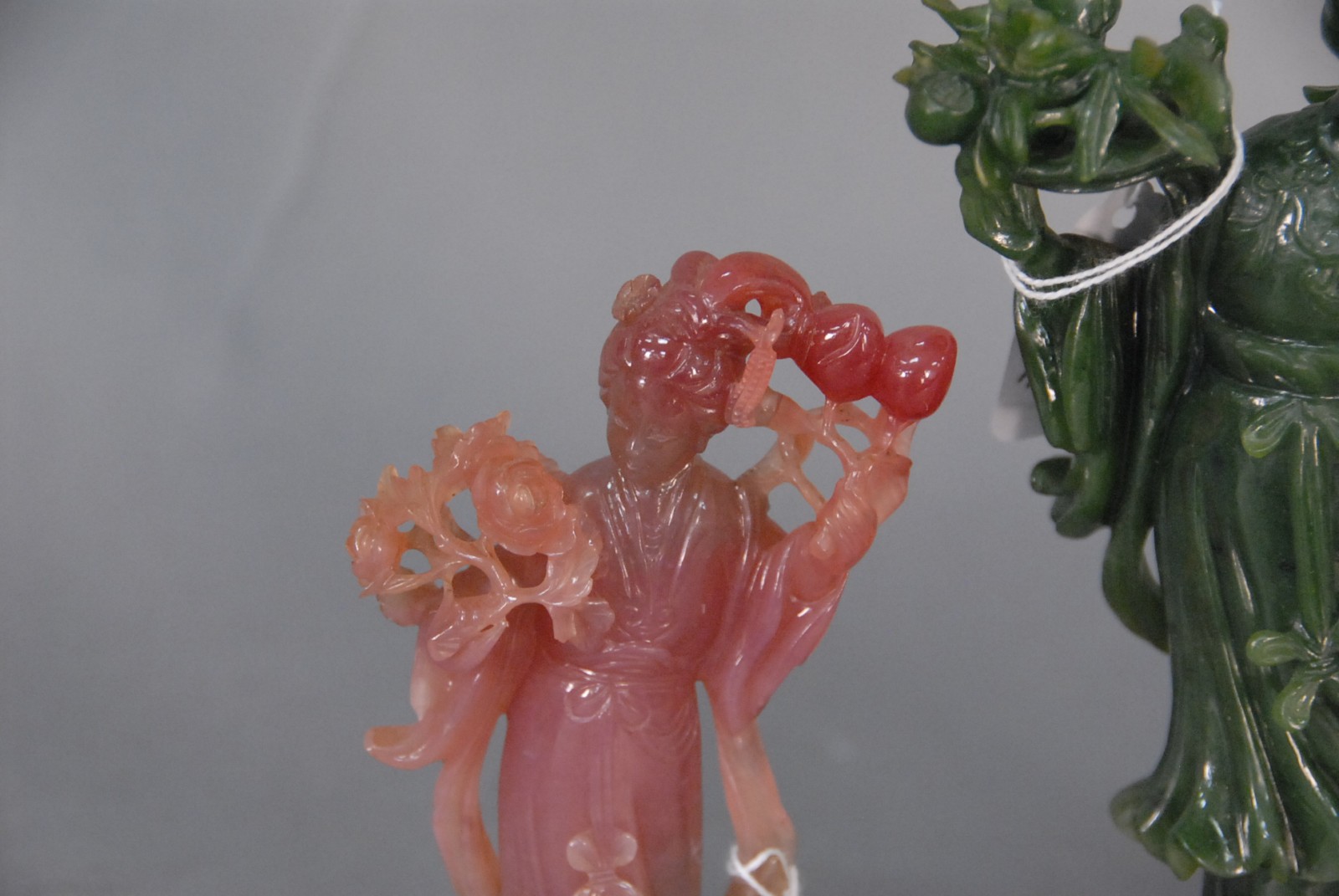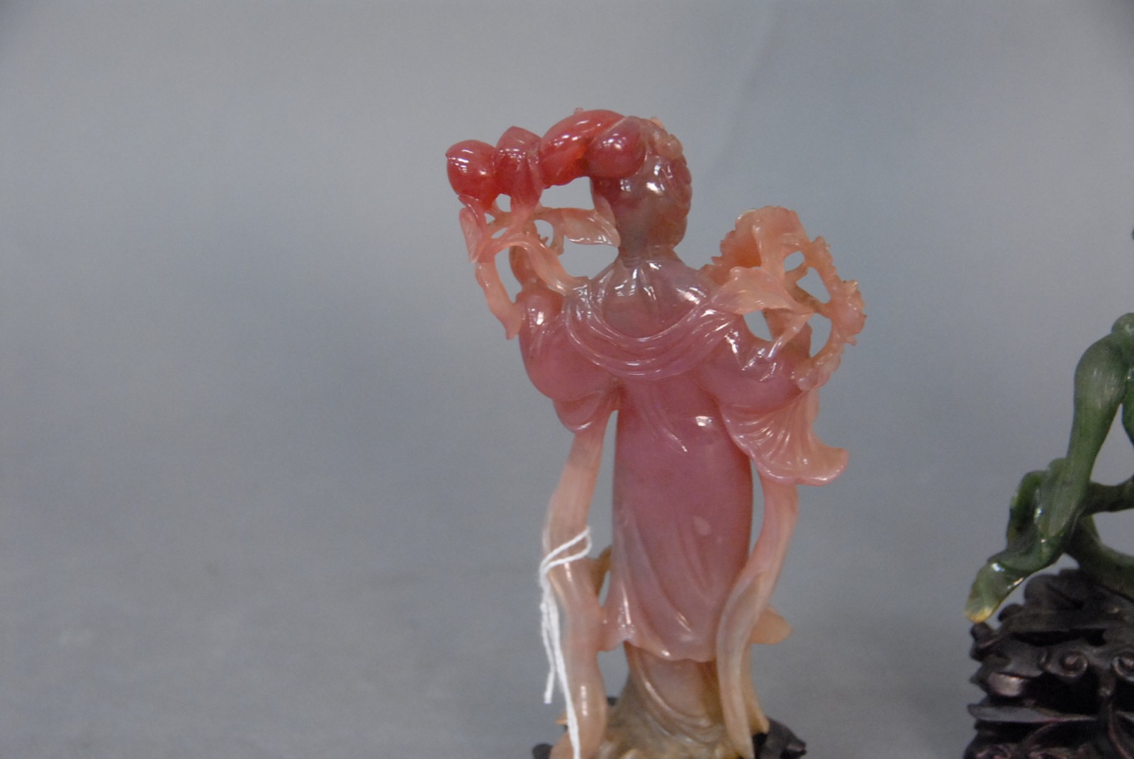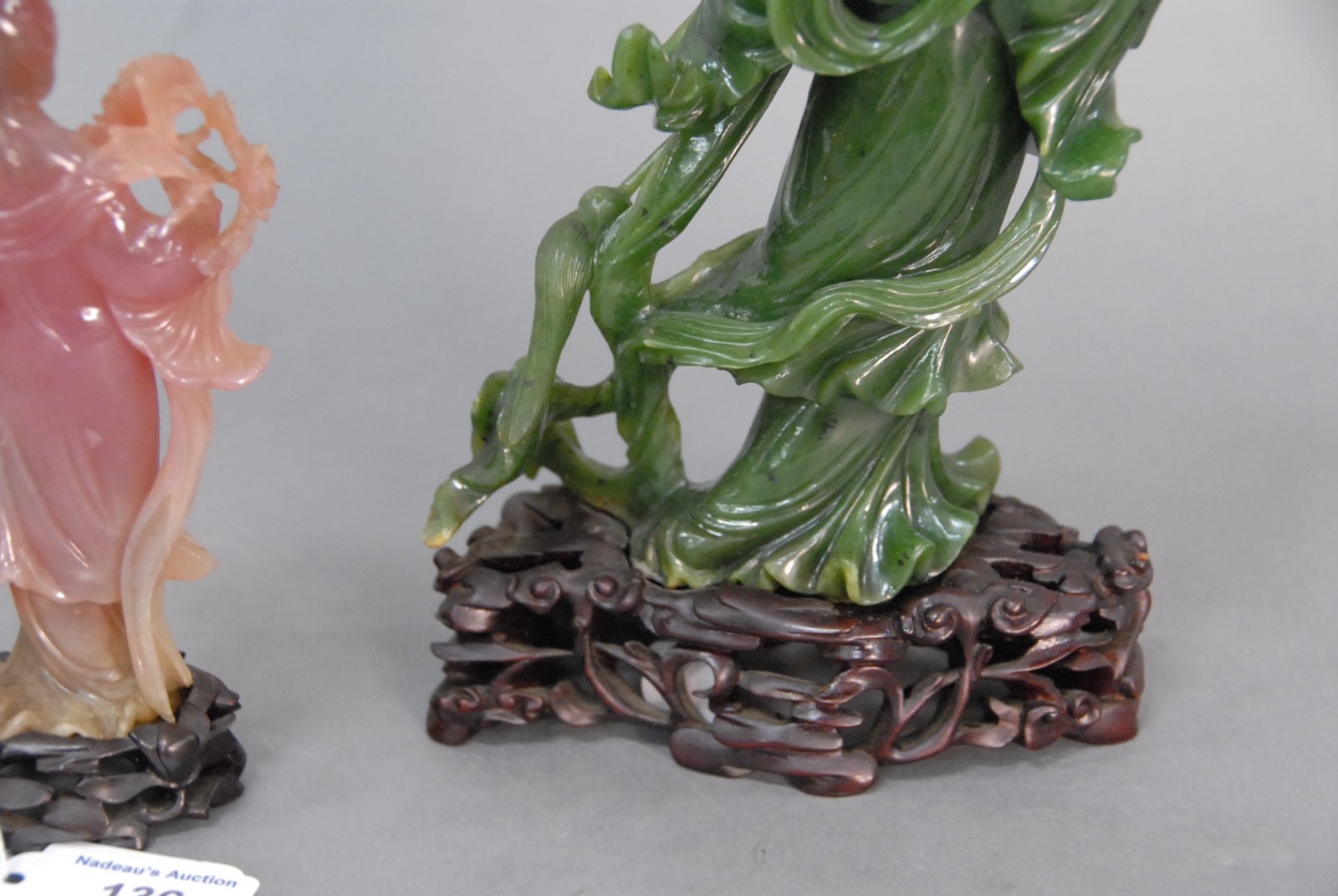 Two Chinese hardstone Quan Yin, one green jade and the other pink, with wood bases, 20th century.