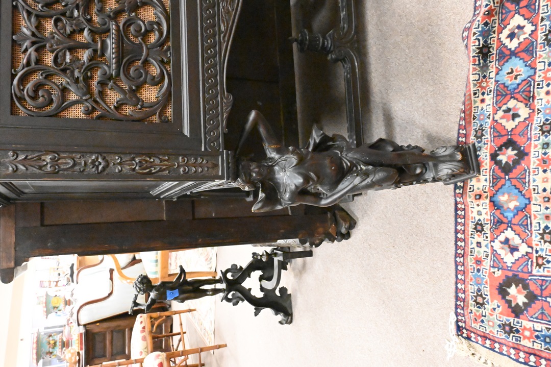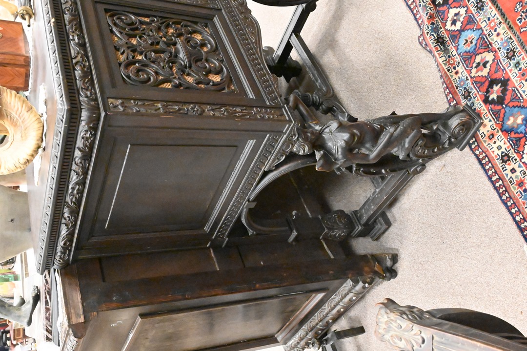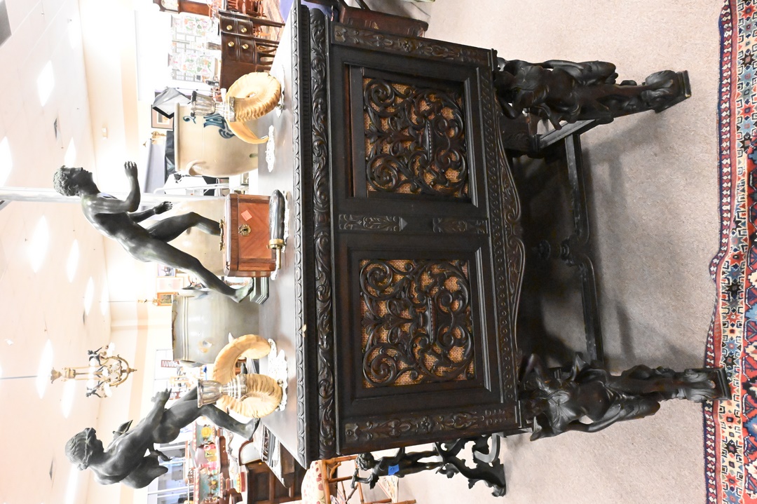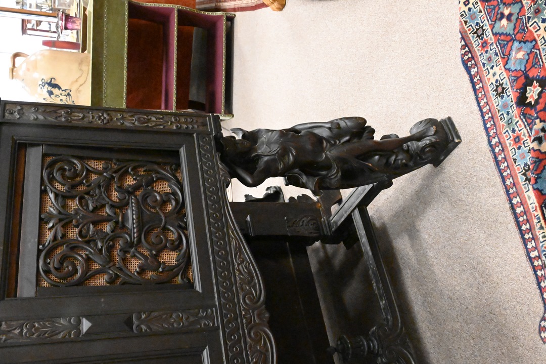 Victor Talking Machine/Record Player, in elaborate carved cabinet, having carved full bodied female supports, currently in working condition, (inside as is), height 44 inches, top 32 1/2″ x 23″.