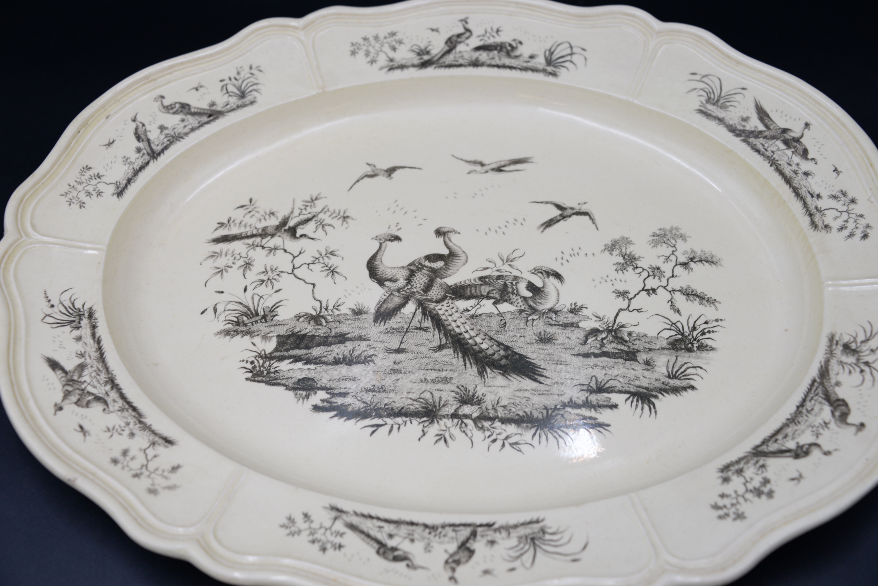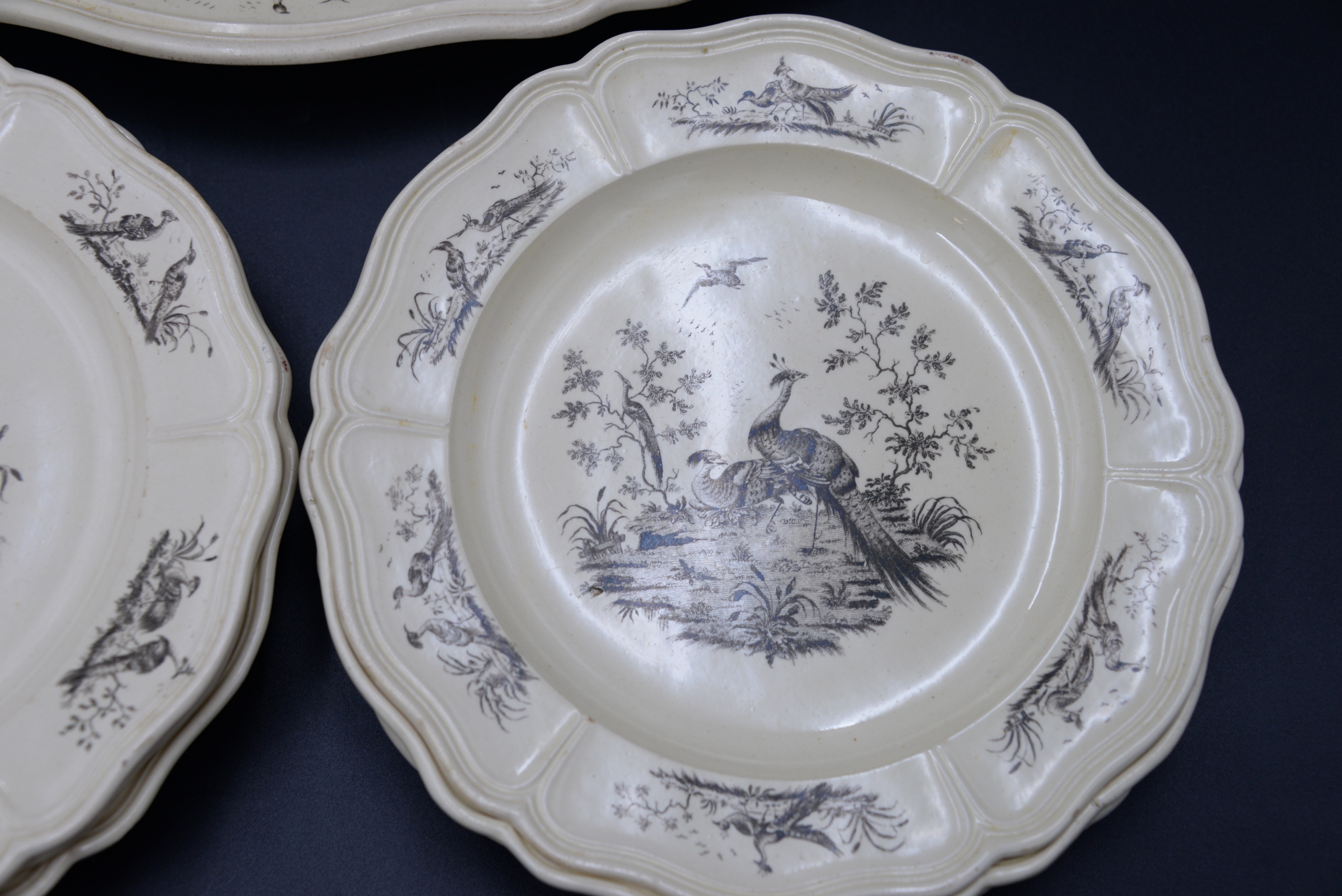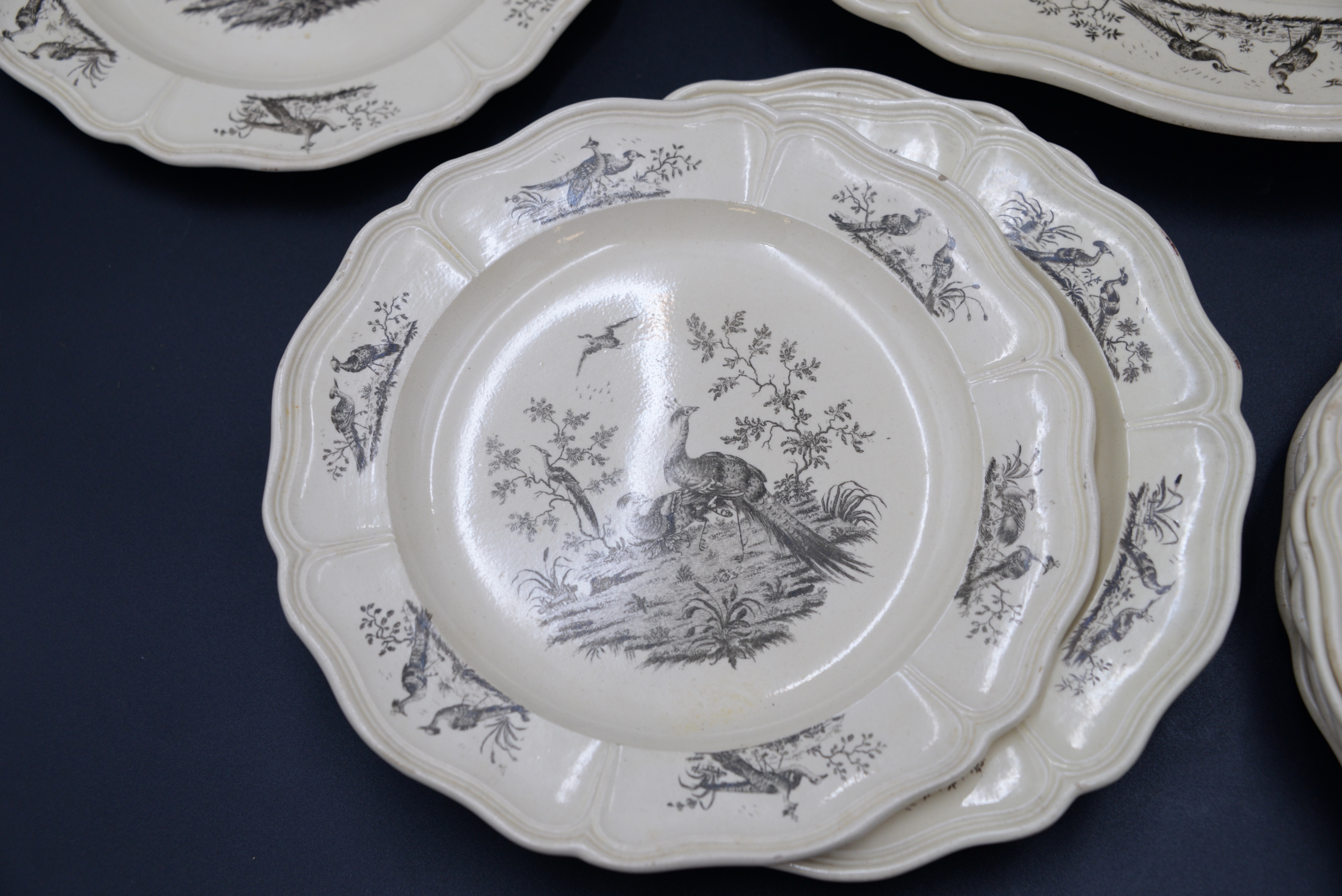 11 Piece Set of Transfer Decorated Creamware Plates and a Matching Oval Platter, having scalloped edge and printed with exotic birds with an exotic bird in the center, diameter of plates 9 1/4 inches, length of platter 18 1/2 inches.