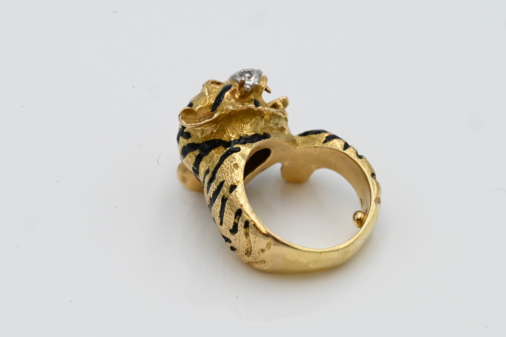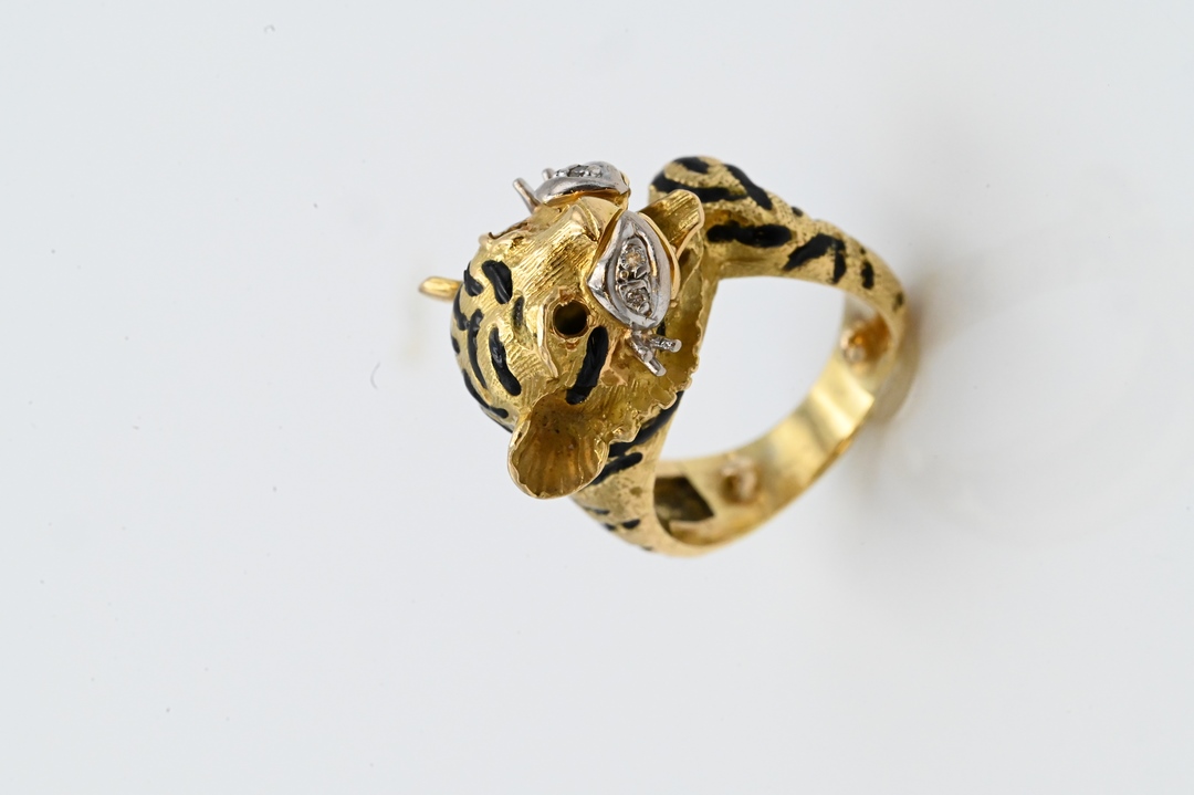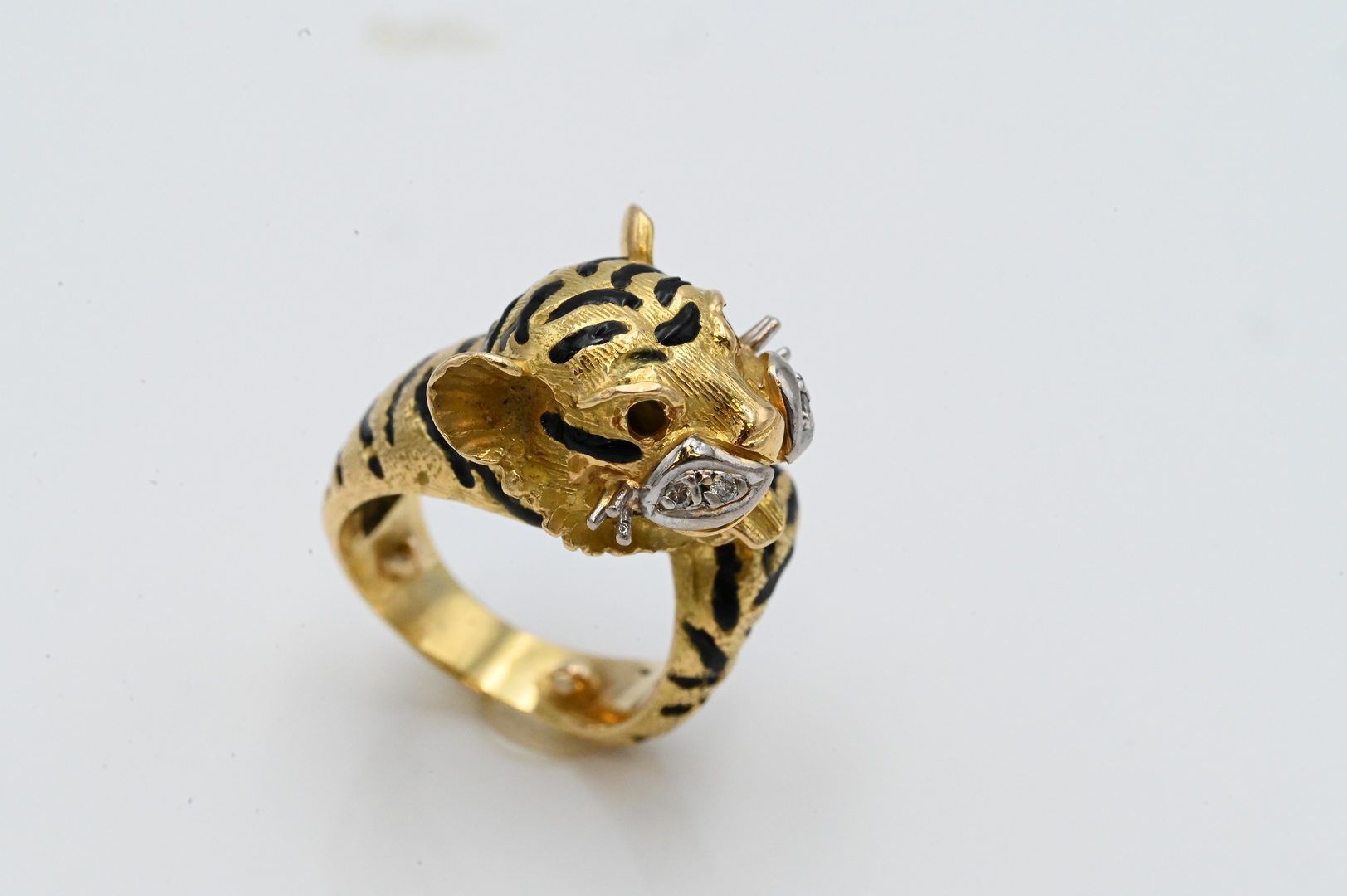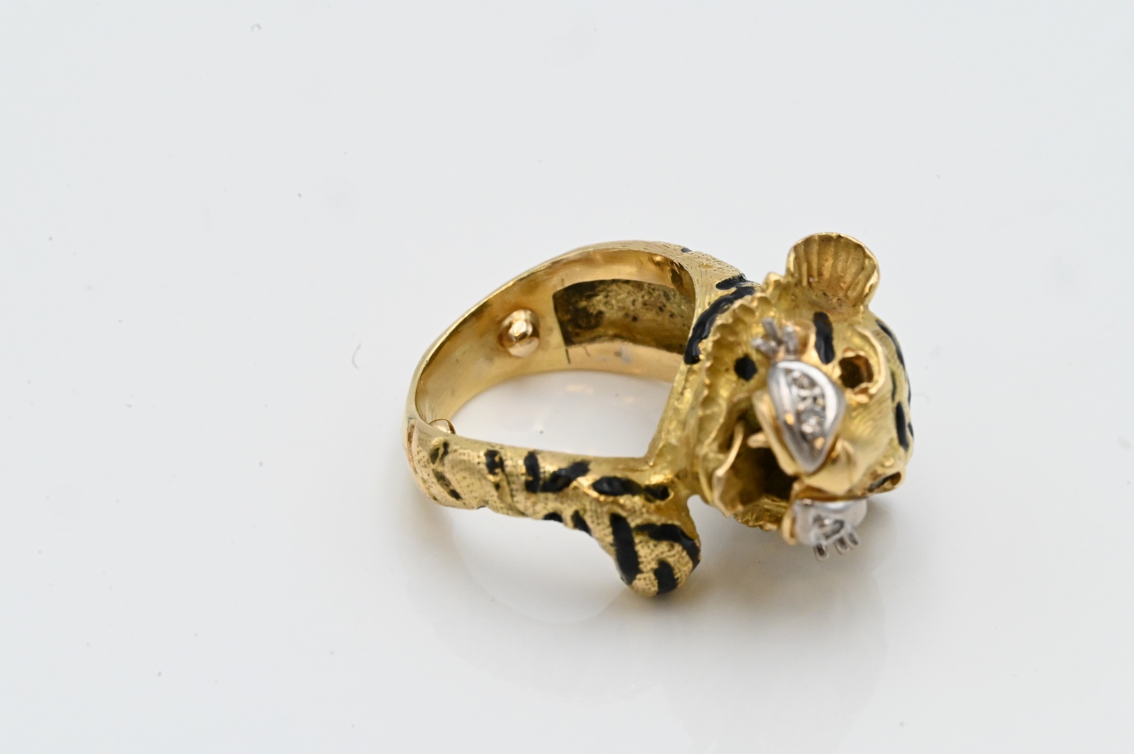 18 Karat Yellow Gold Ring having tiger head along with small diamonds size 4 – 4 1/2, 13.5 grams Condition: minor chips to enamel, missing stone in one eye