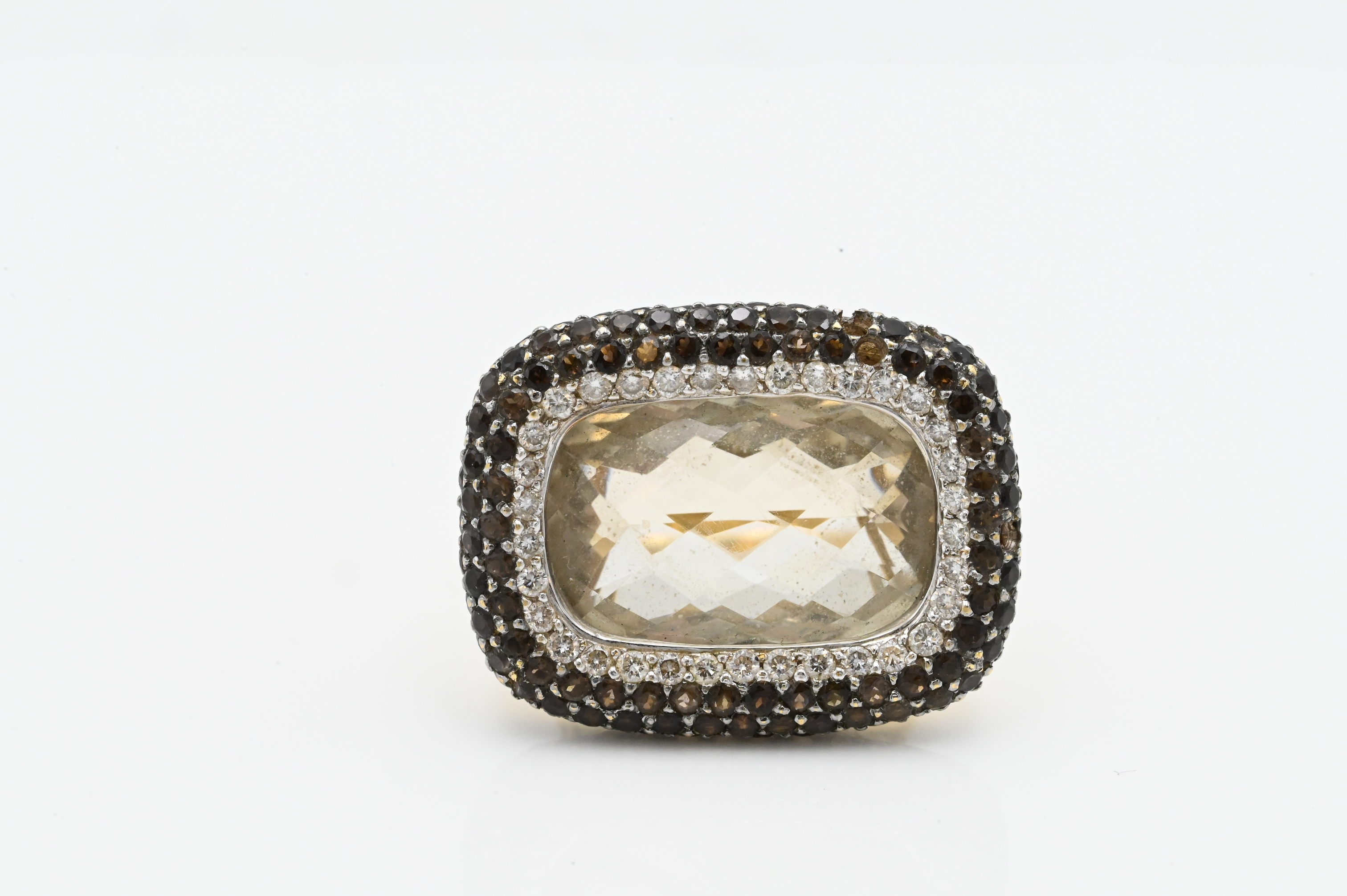 set with large light yellow stone surrounded by two bands of champagne diamonds and one band of white diamonds