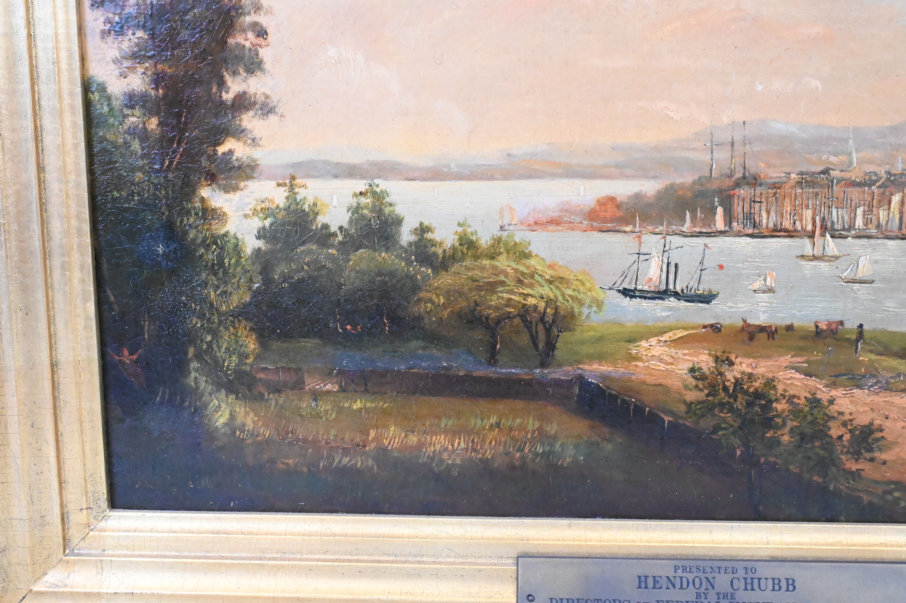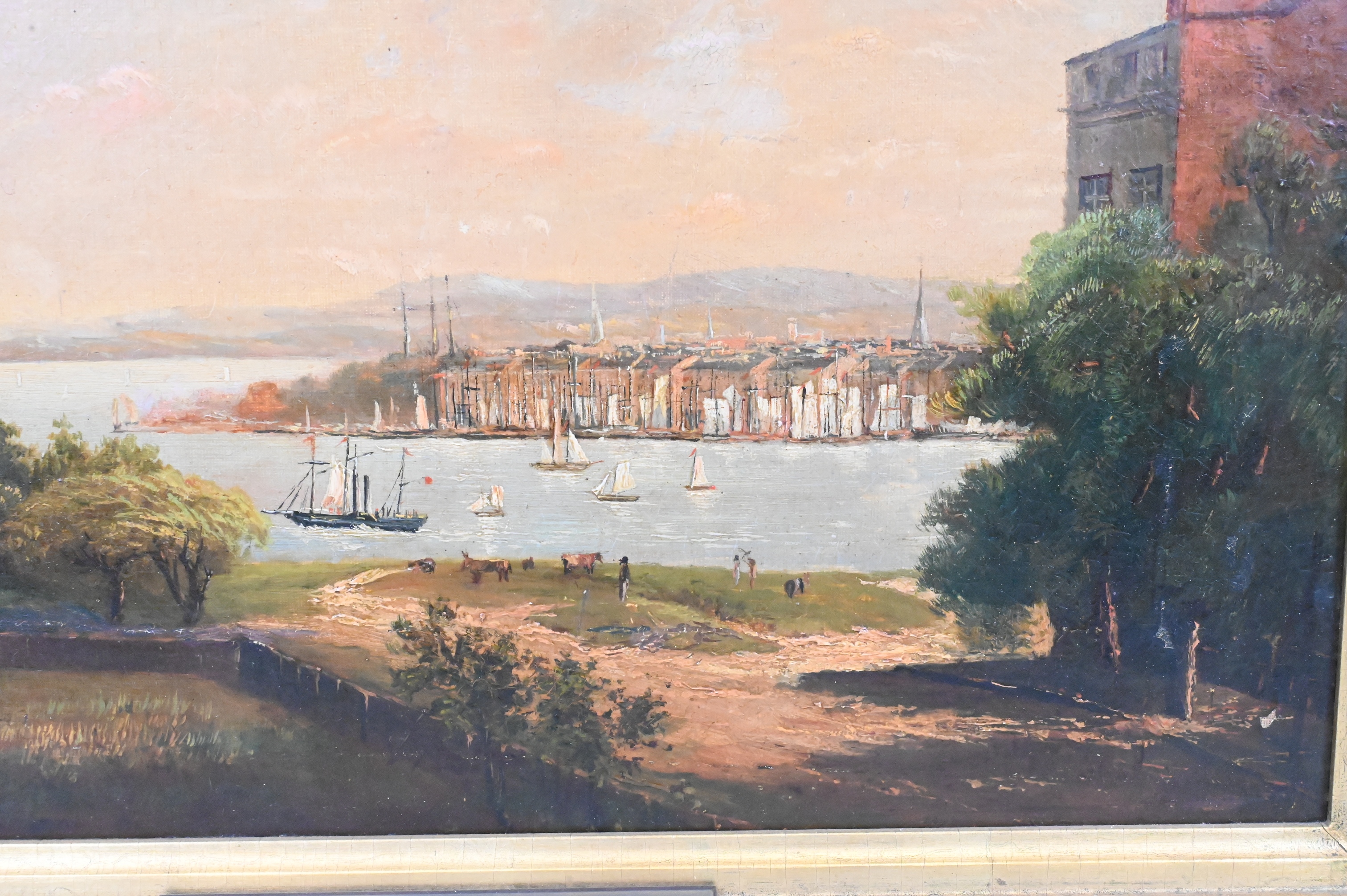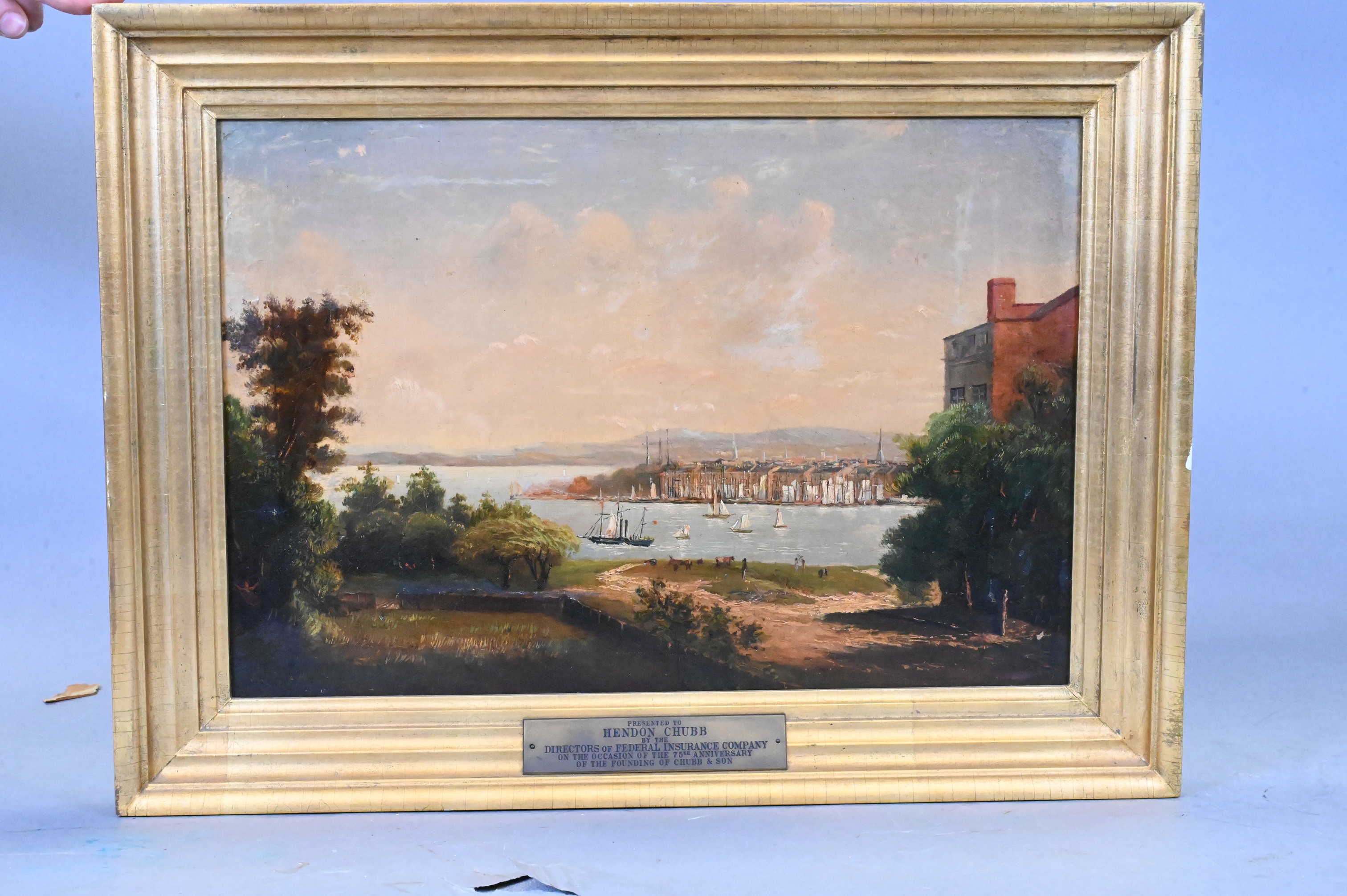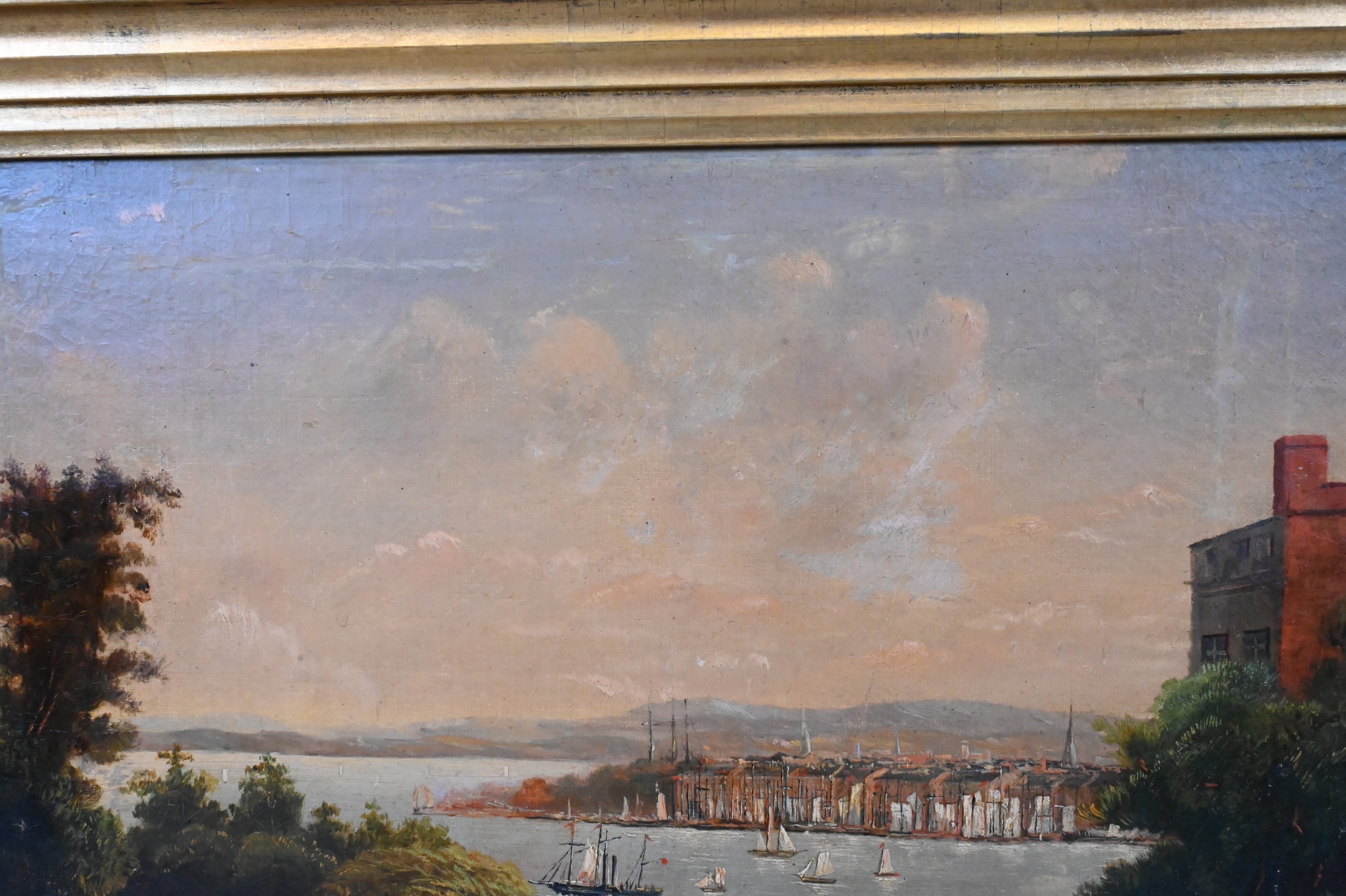 A finely painted view of lower Manhattan as seen from Brooklyn Heights, depicting sailboats and early shipping activity along the East River with the New York skyline in the distance.
