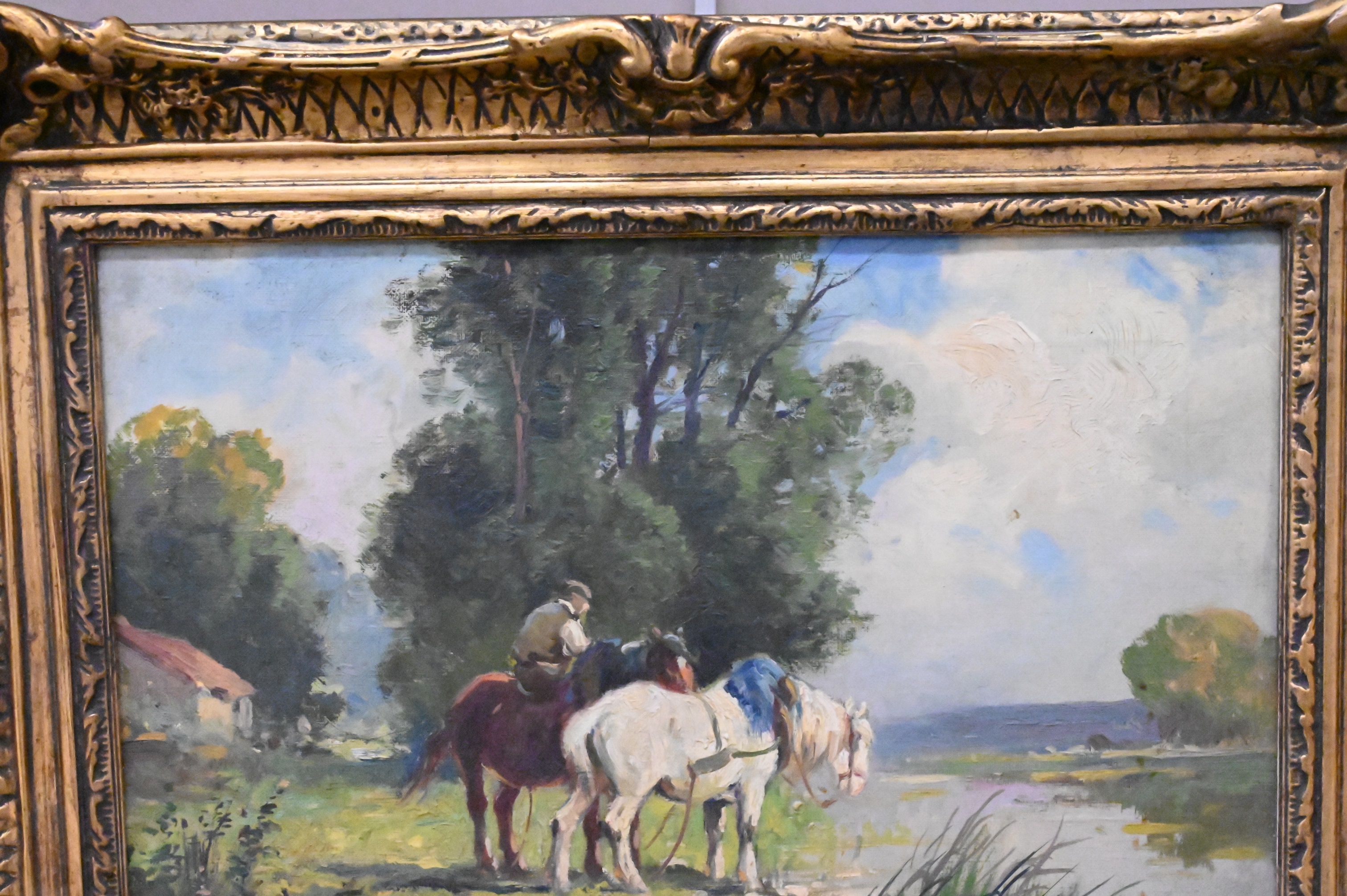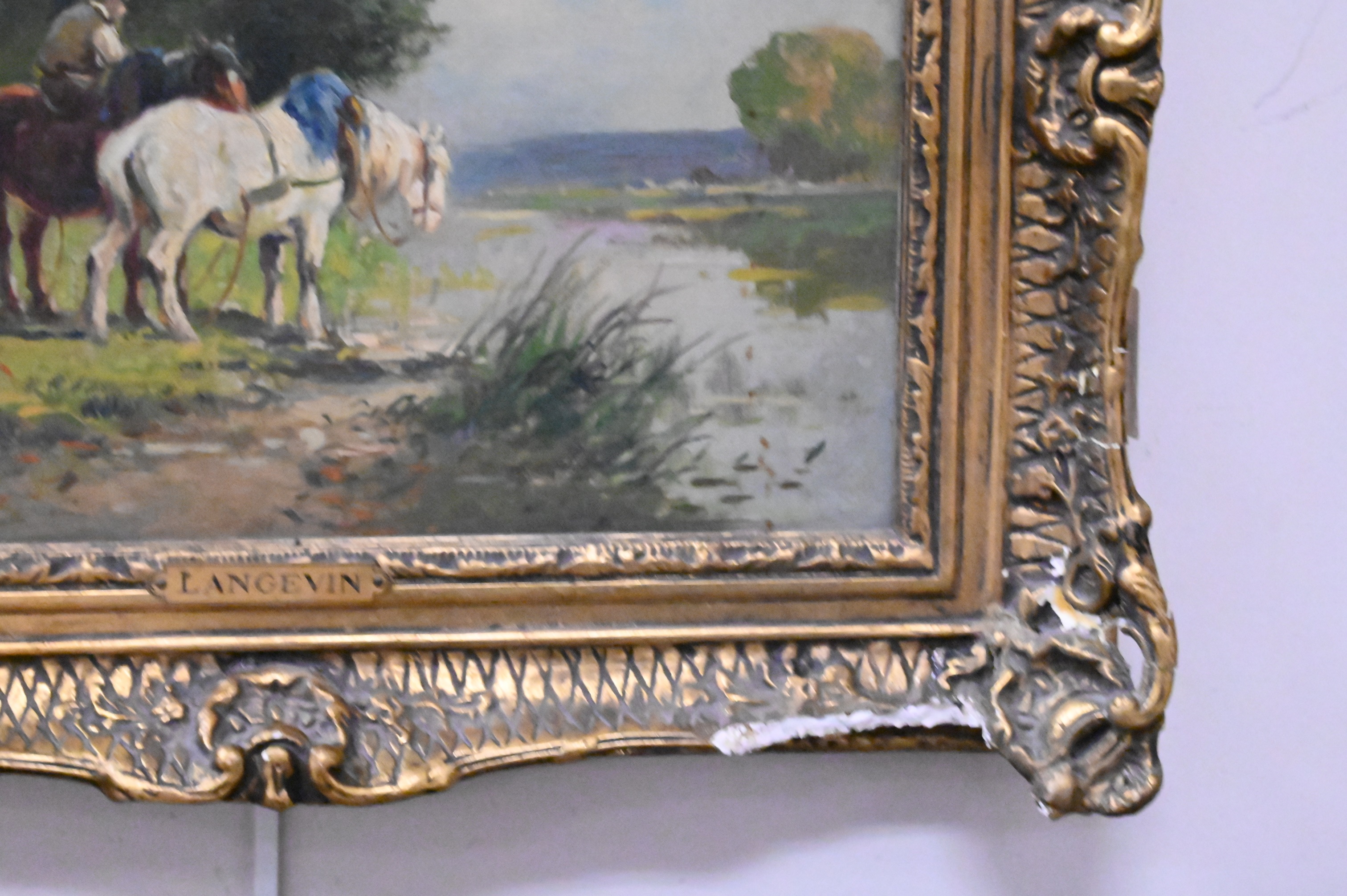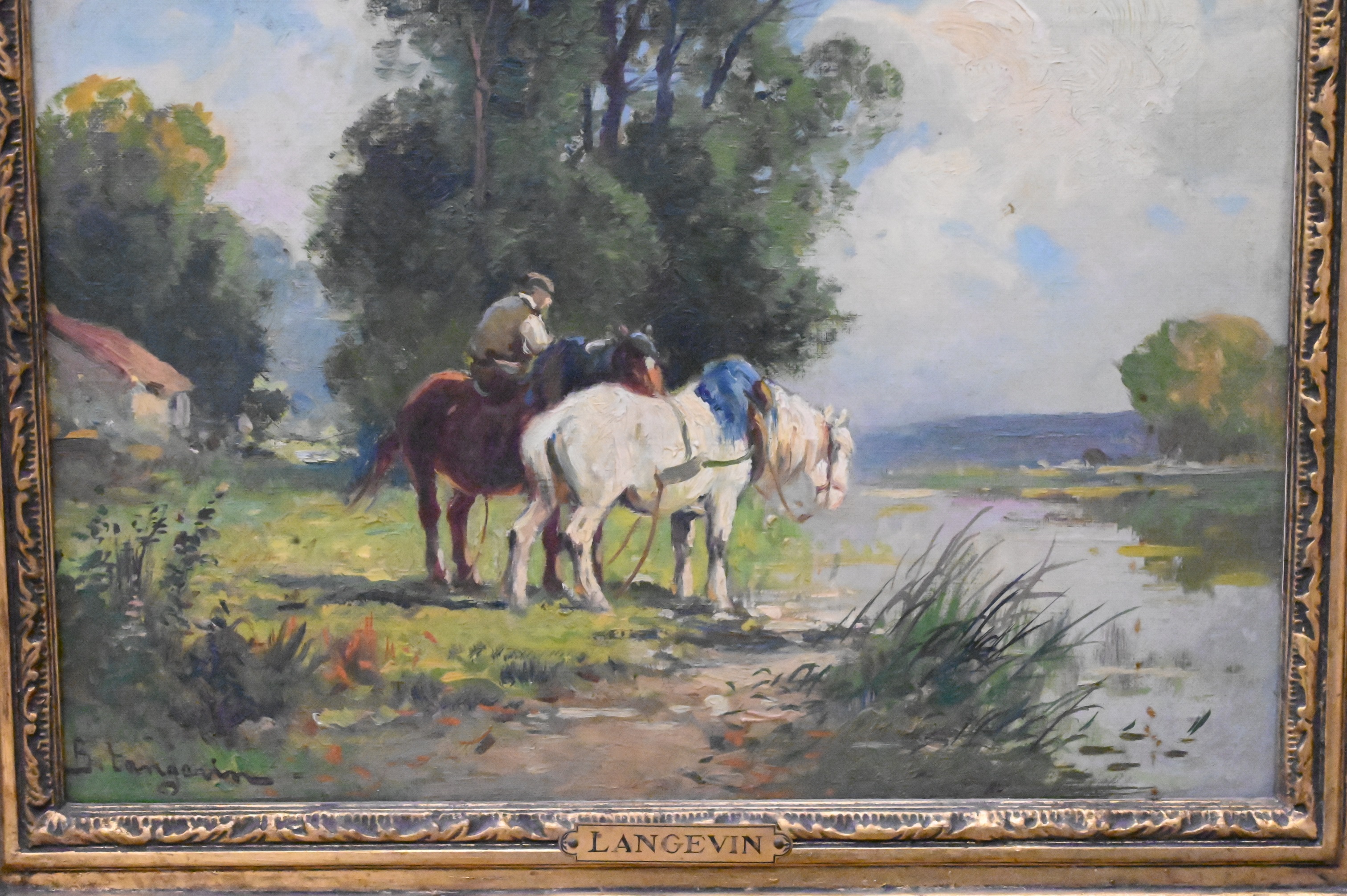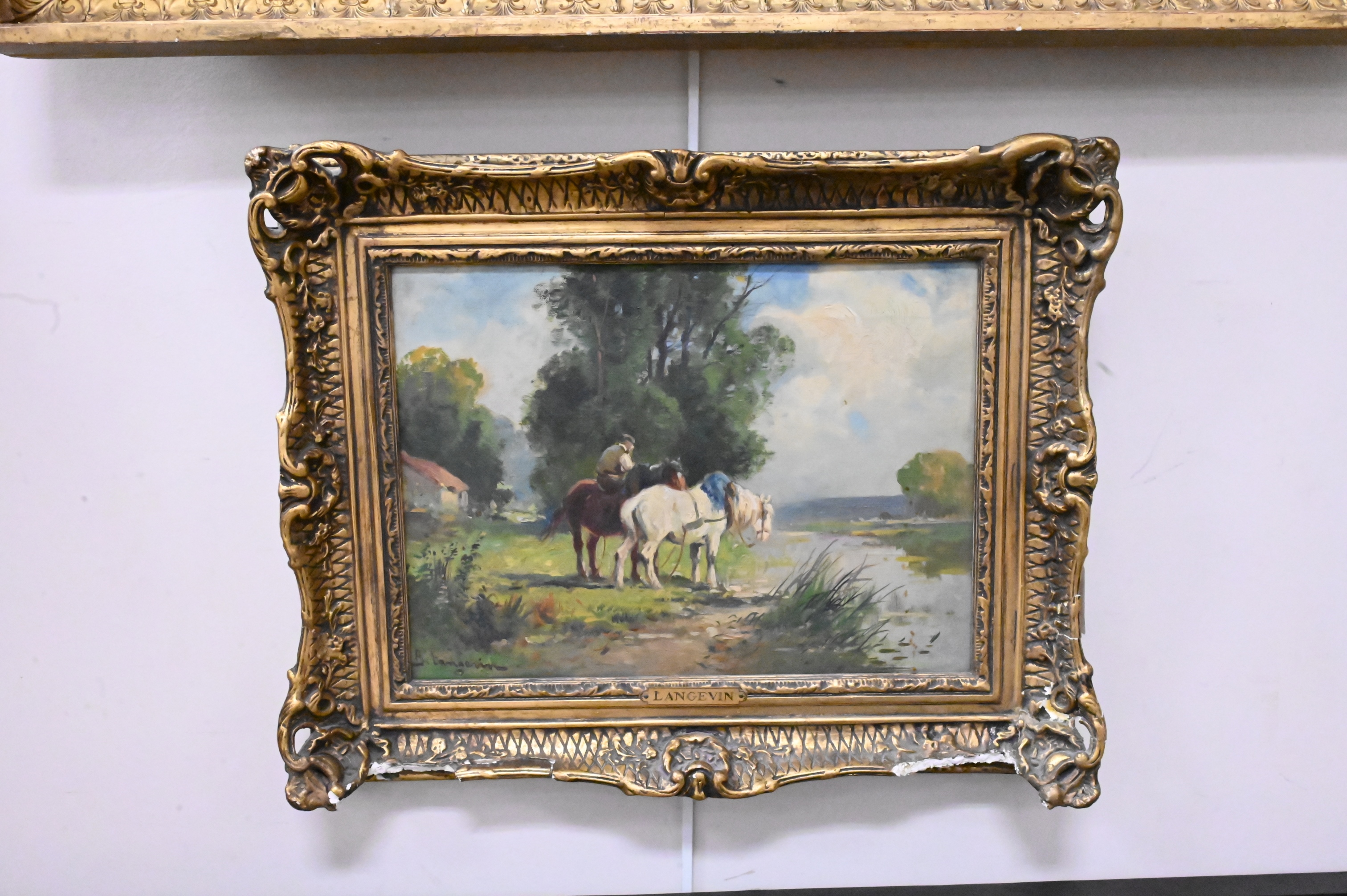 Brigitte Langevin (French, early 1900’s), horse rider by a pond, oil on canvas, signed lower left “B. Langevin”, not dated, 9 3/4″ x 13 1/4″, William Haines Picture Framing label on back.