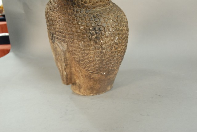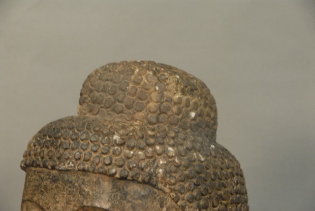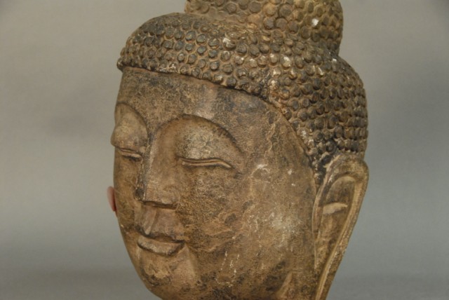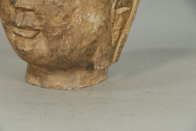Carved stone Buddha head with tight. curls and long pendent earlobes