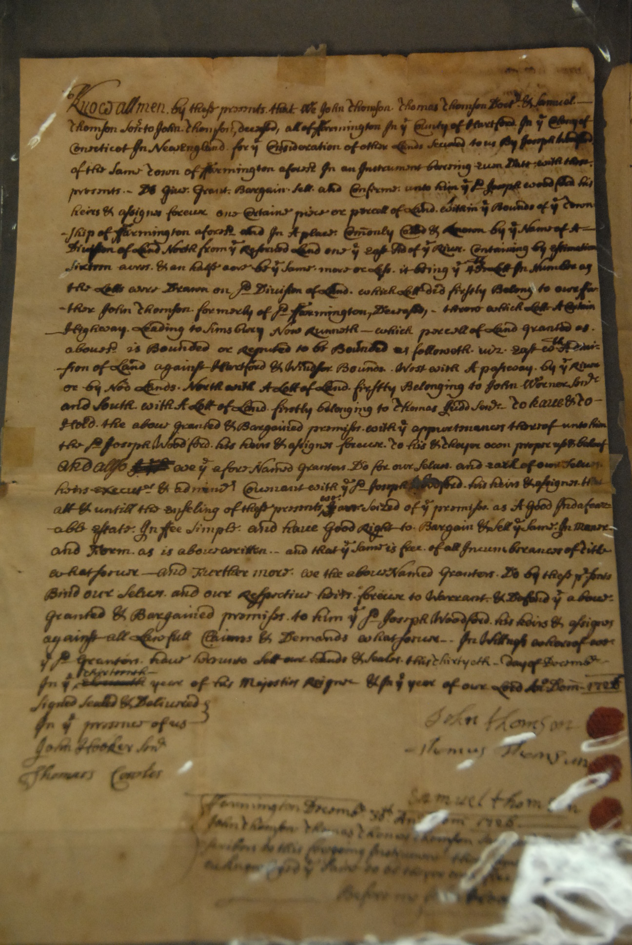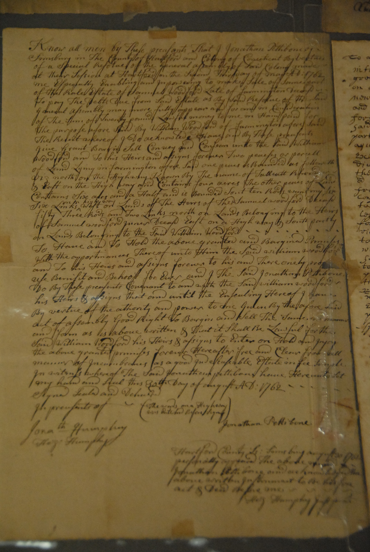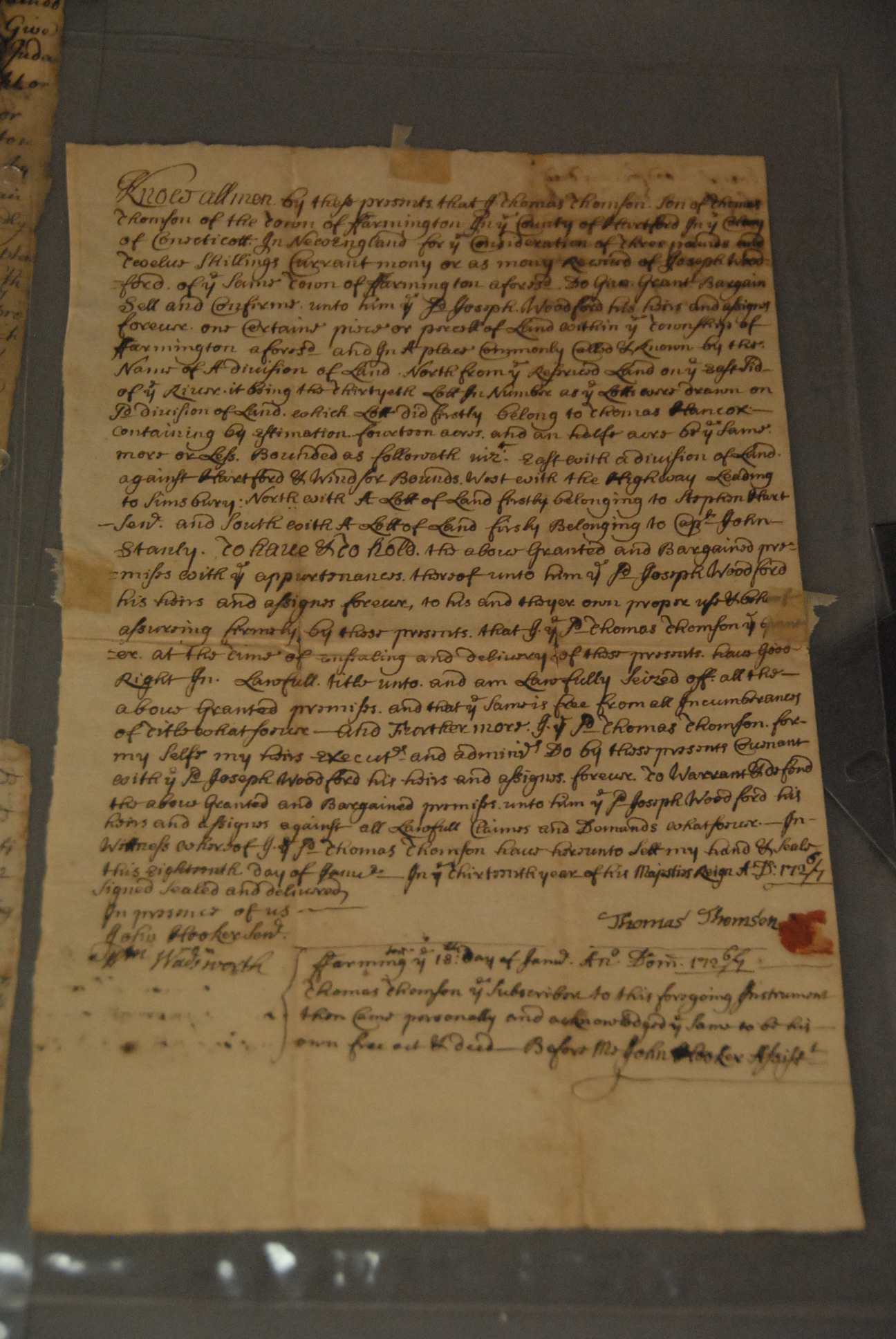 Eleven Farmington Valley deeds, 1711-1786 including Thomas Wadsworth, Thomas Thomson, John Hooker, Jonathan Humphrey, Thomas Hart Justice, Nathan Benjamin, Sam Fitch, John Woodford.