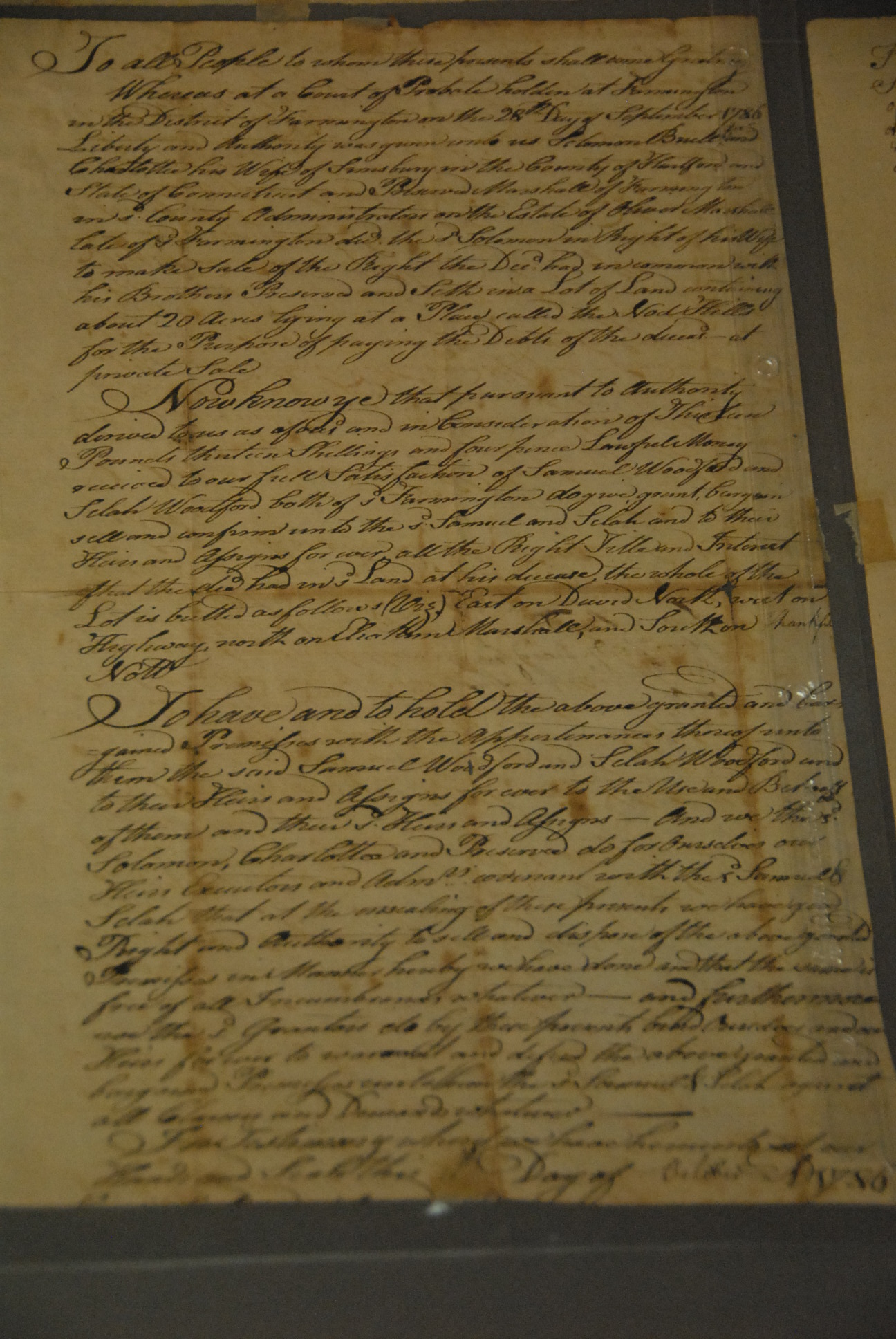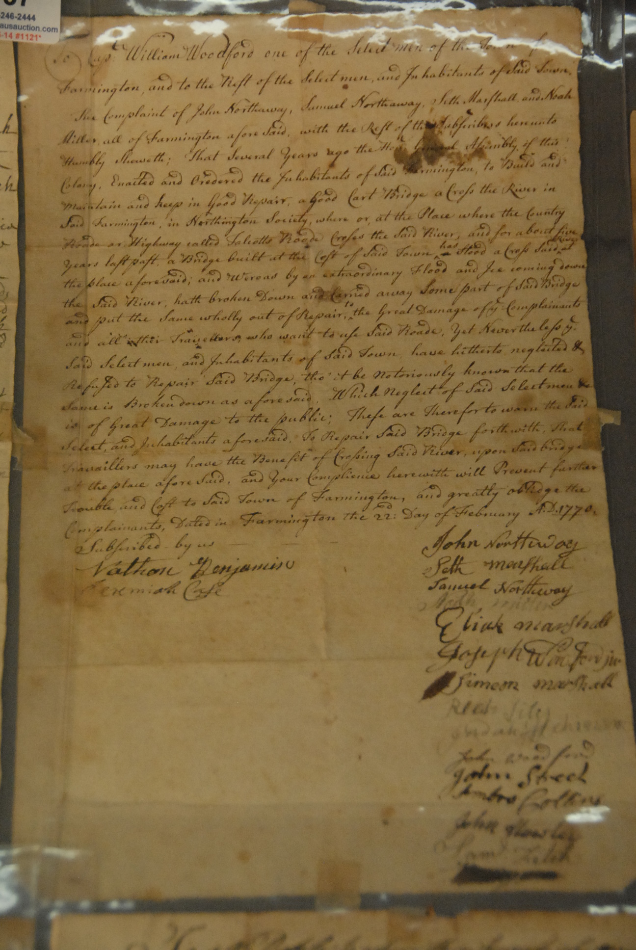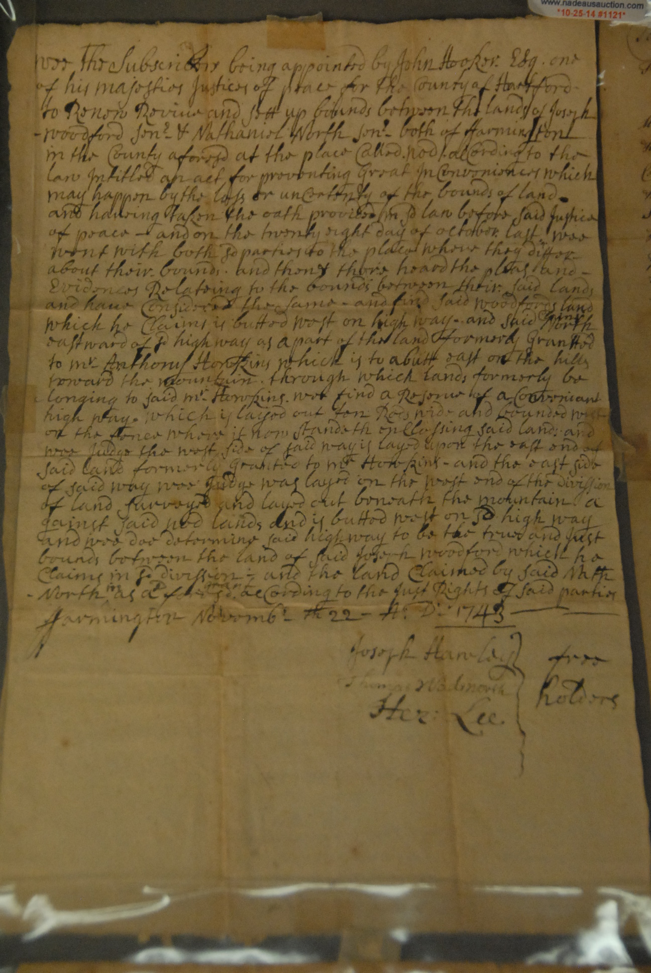 Lot 137: Eleven Farmington Valley deeds, 1711-1786 including Thomas Wadsworth, Thomas Thomson, John Hooker, Jonathan Humphrey, Thomas Hart Justice, Nathan Benjamin, Sam Fitch, John Woodford.