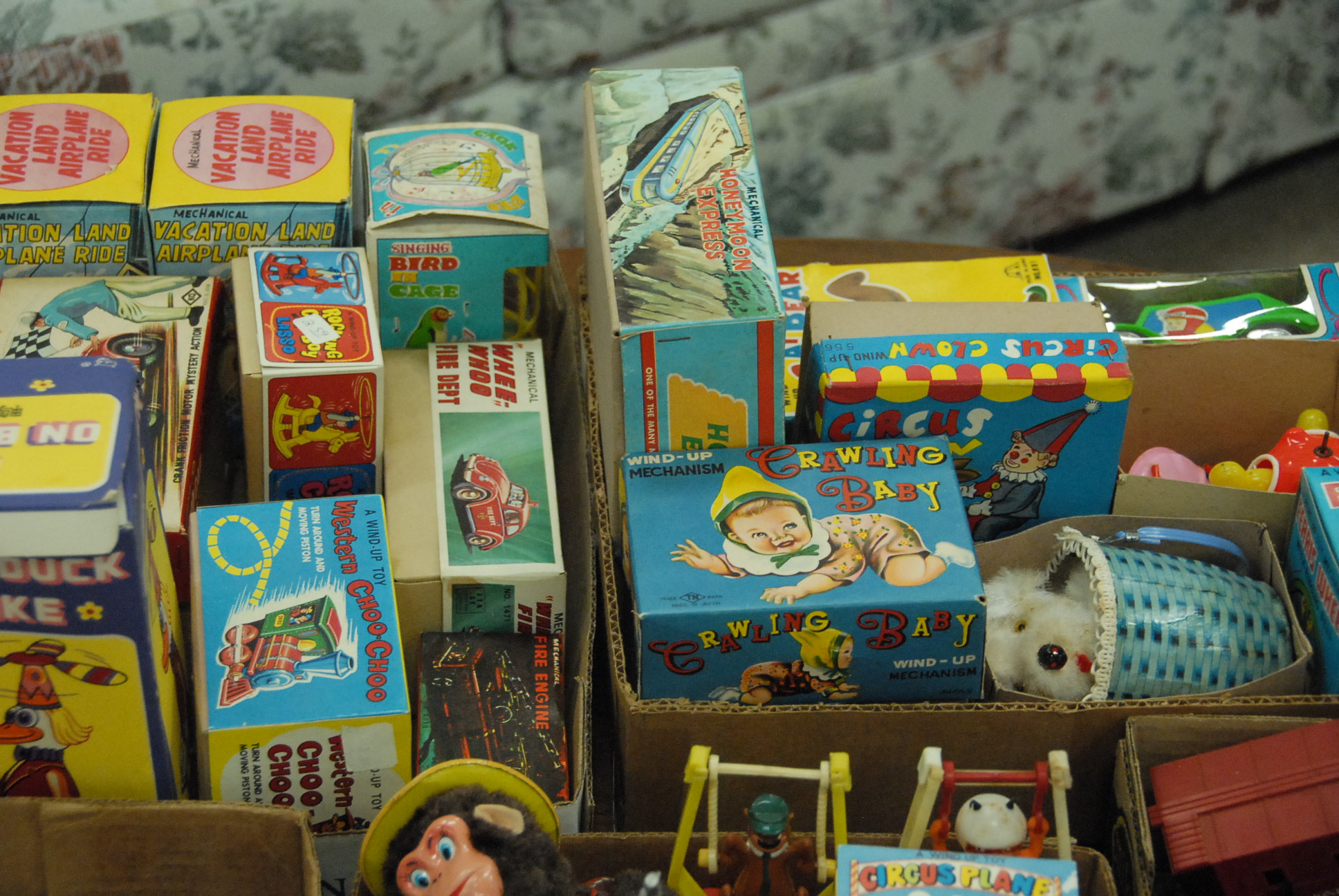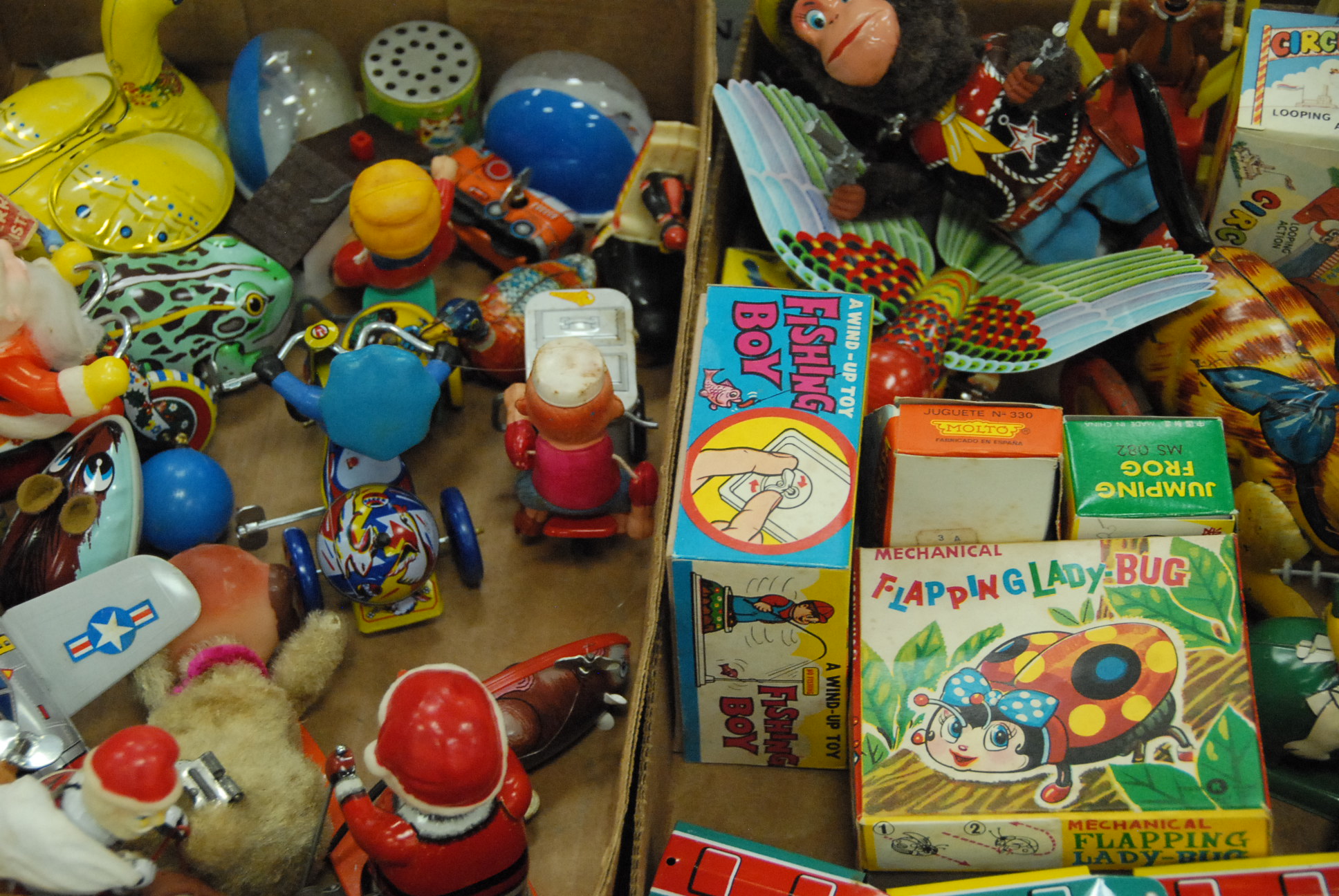 Four box lots of toys including wind up toys, Marx, many with boxes and a Lionel Train.