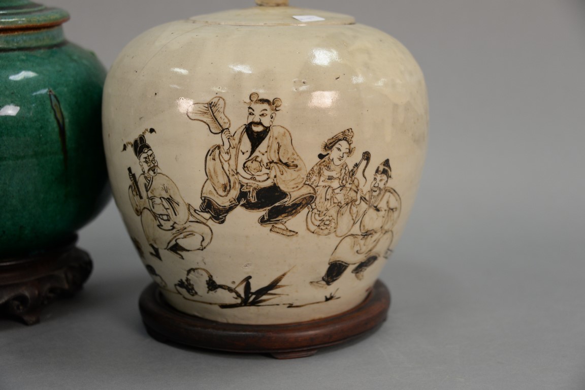 Four piece lot to include a pair of Chinese covered jars both as isps, a green glaze jar, and a plaque. plaque: 12 x 12.