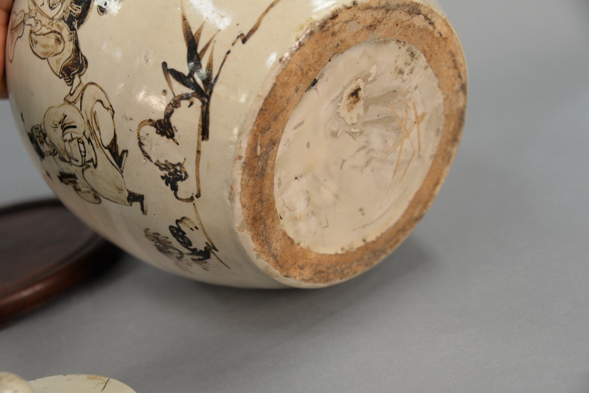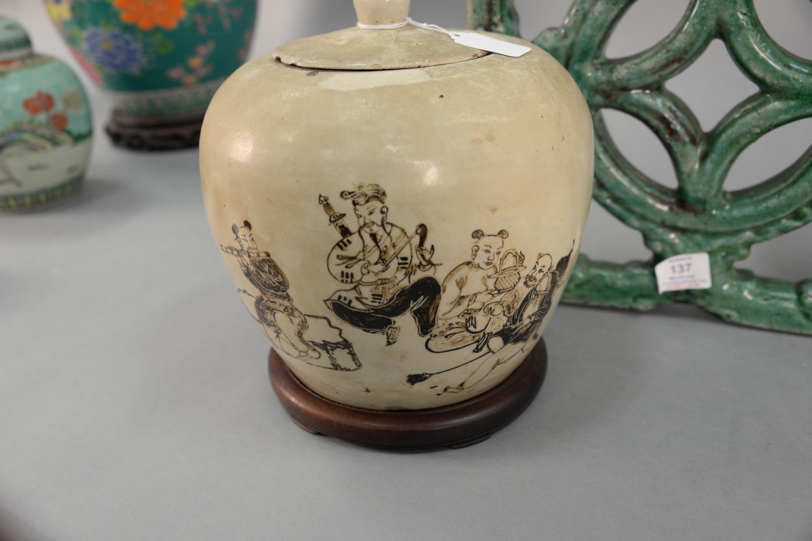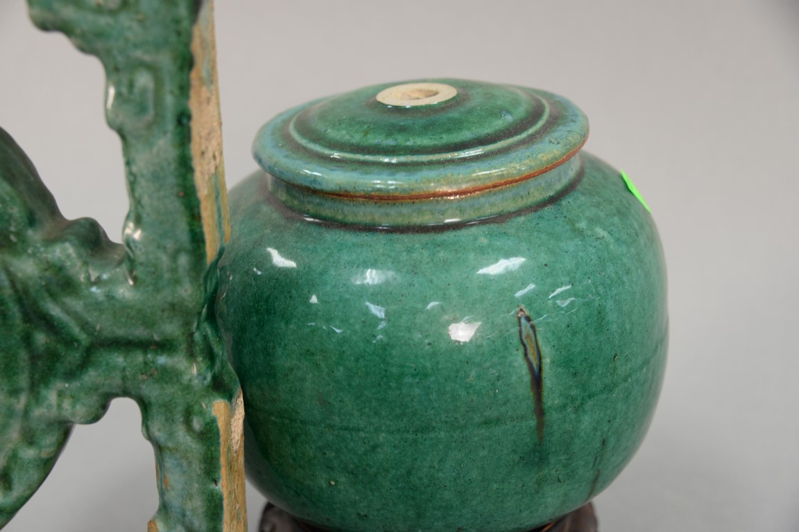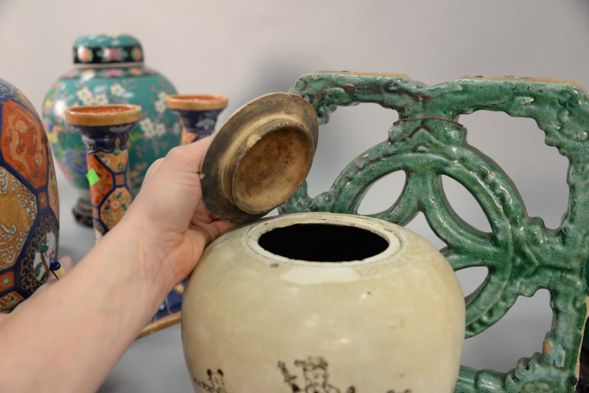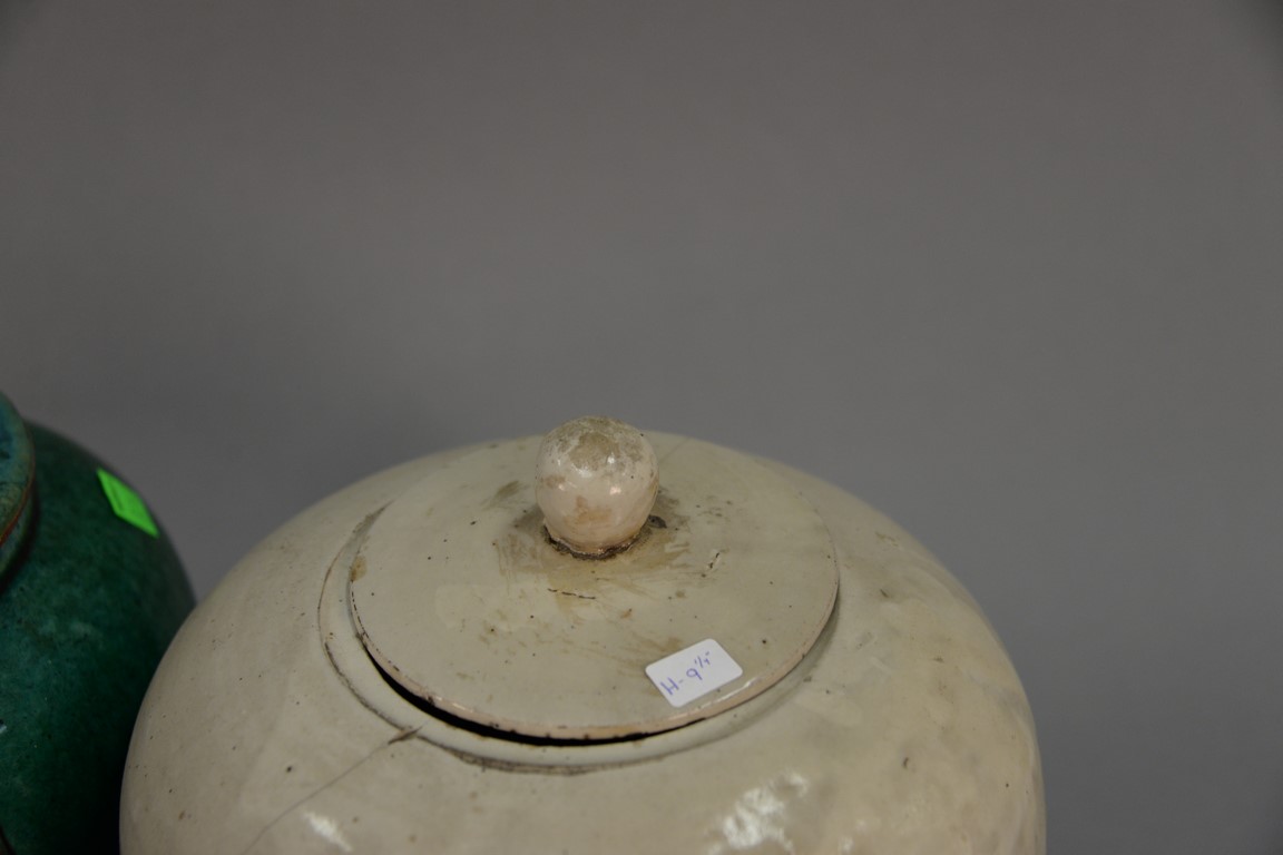 Lot 137: Four piece lot to include a pair of Chinese covered jars both as isps, a green glaze jar, and a plaque. plaque: 12 x 12.
