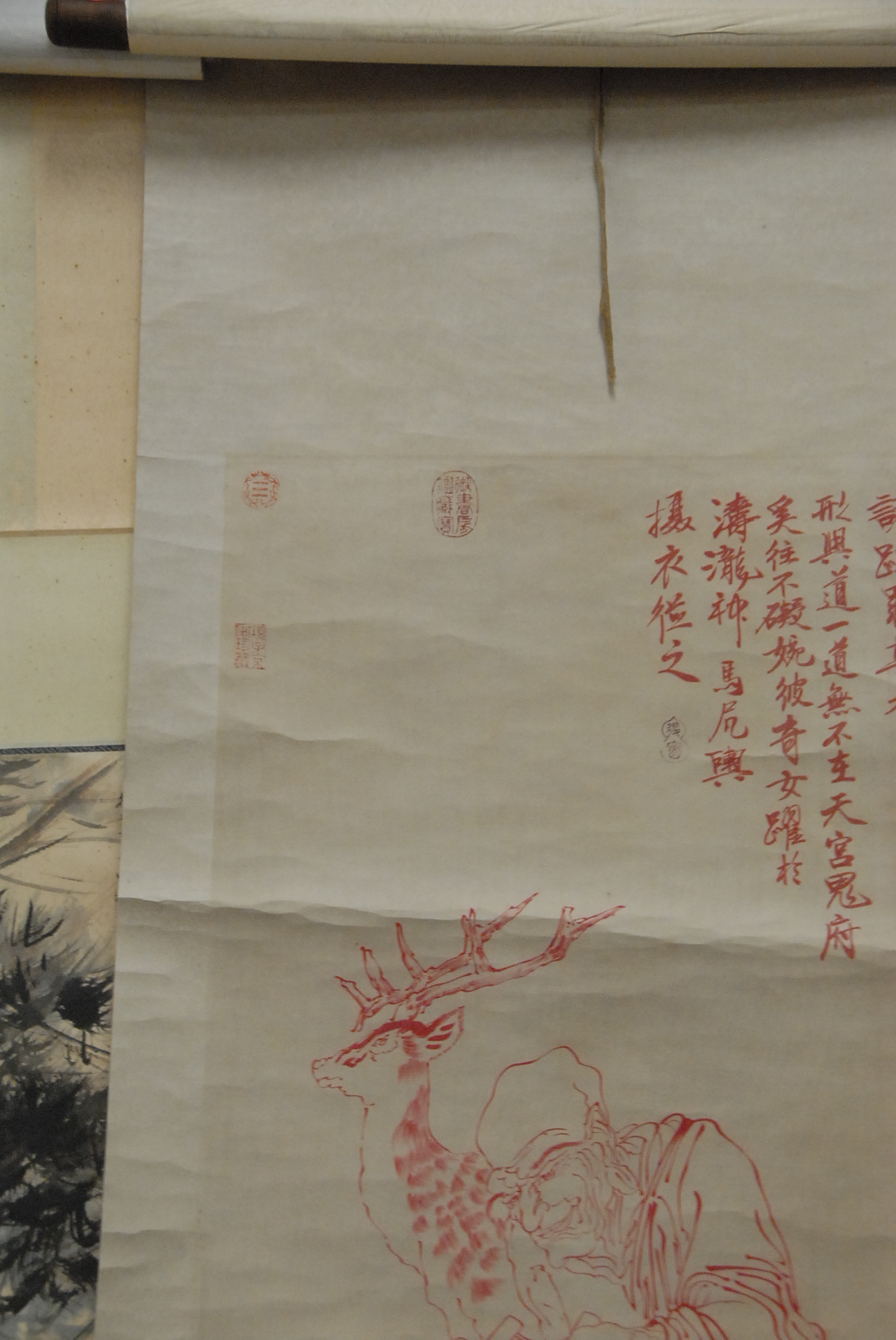 Group of three oriental scrolls , red watercolor with scholar and deer a red drawing of a group of scholars and a watercolor of a man by a tree.