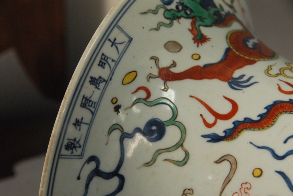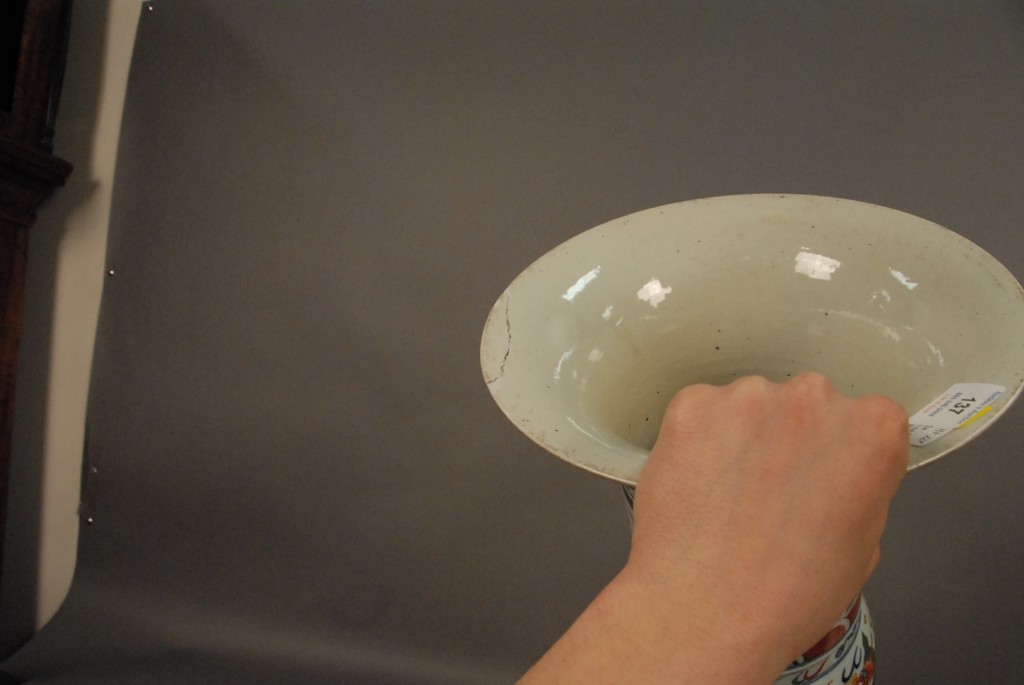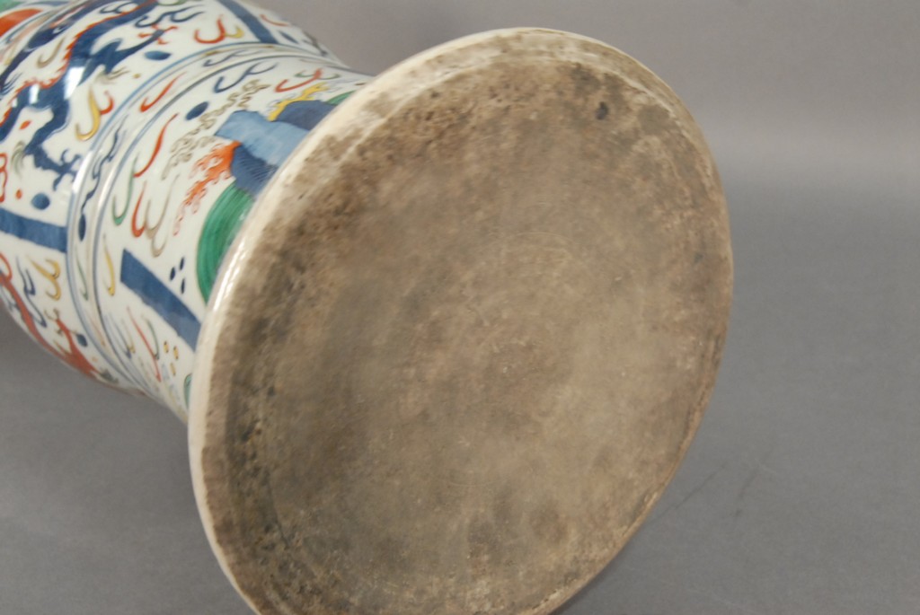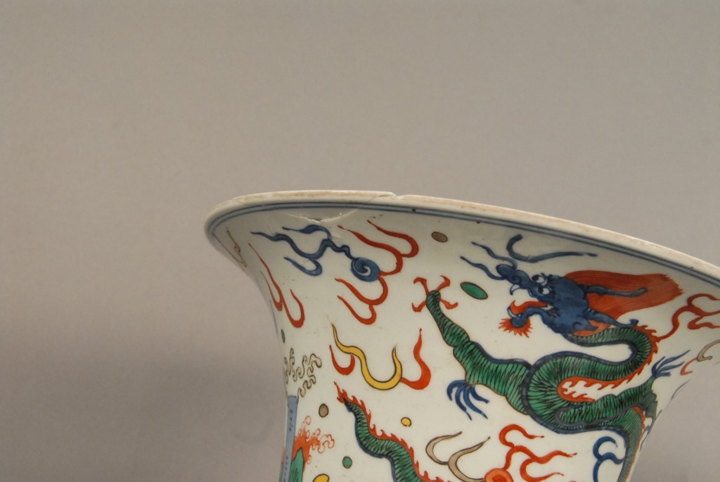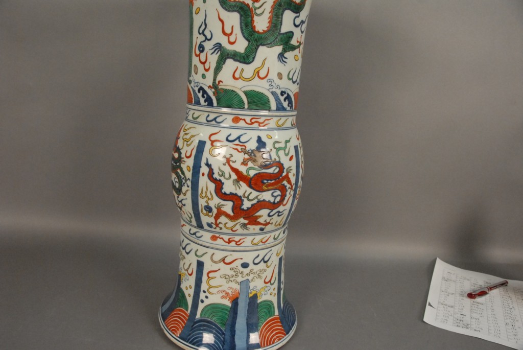 Lot 137: Large dragon beaker vase having green and red dragons with flaming clouds and flared rim, ht. 22 dia. 11.