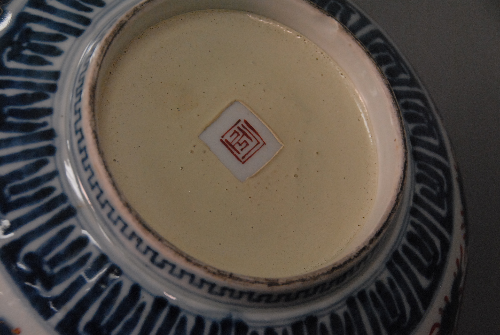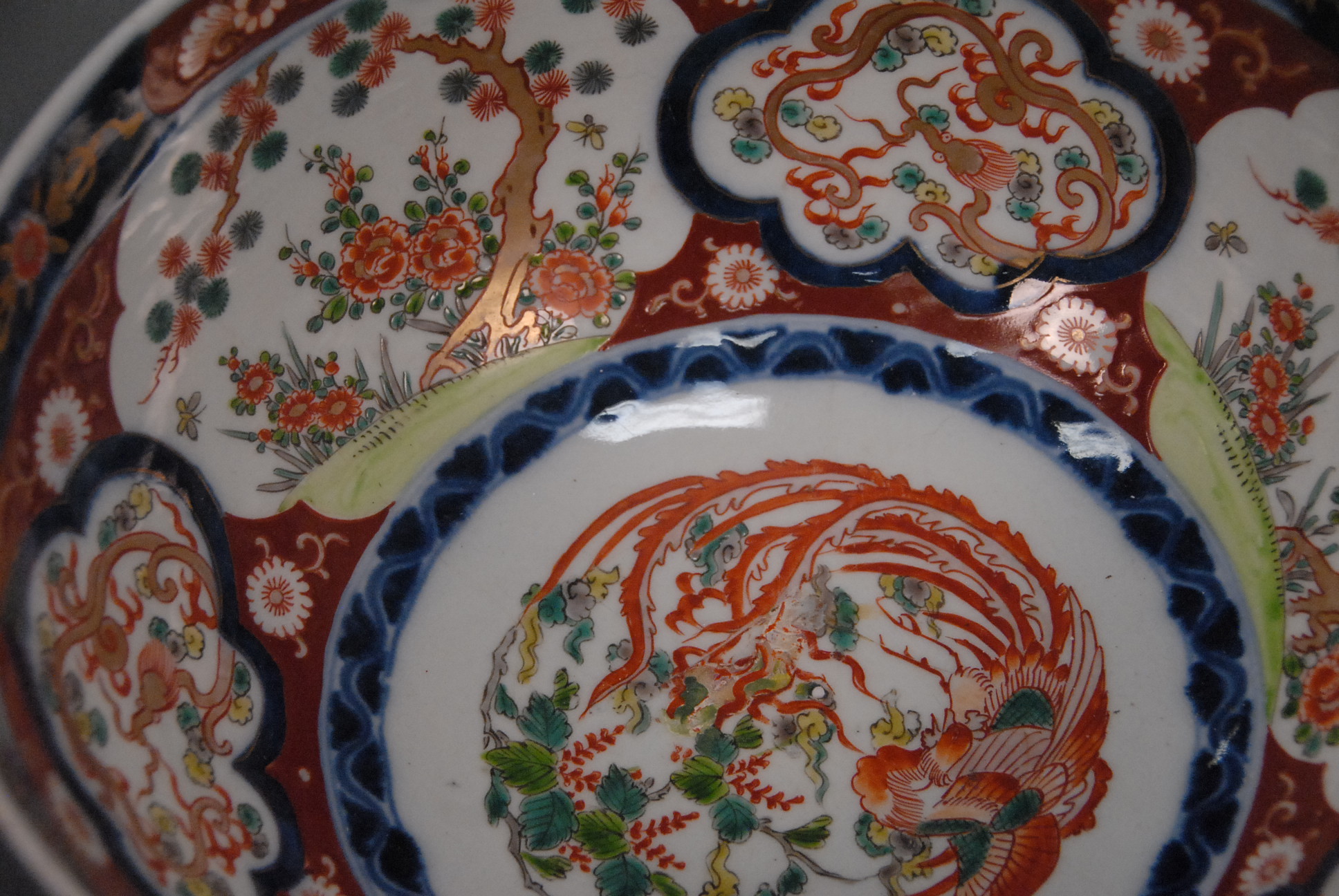 Lot 137: Large Imari bowl with phoenix and dragons as is, base broken and repaired dia. 12in. ht. 6in.