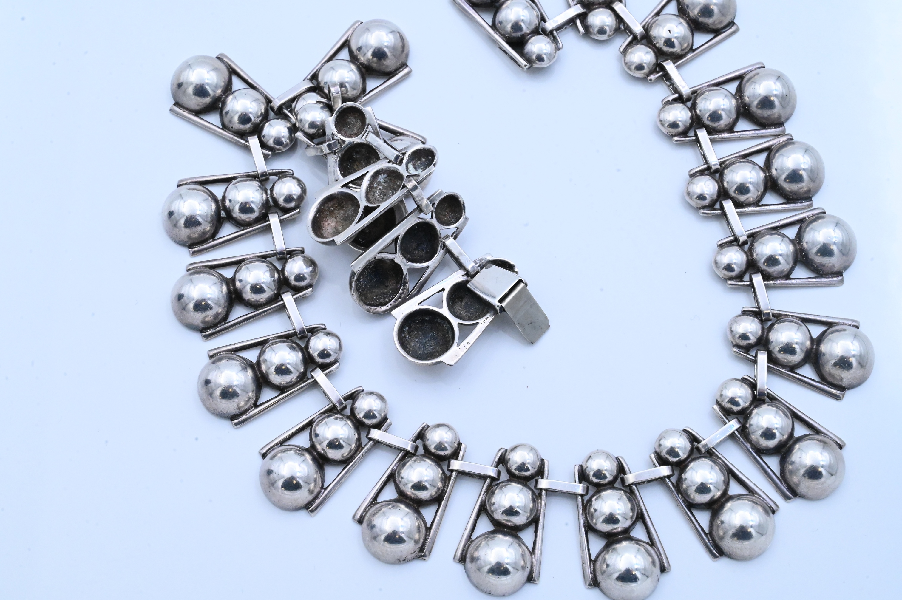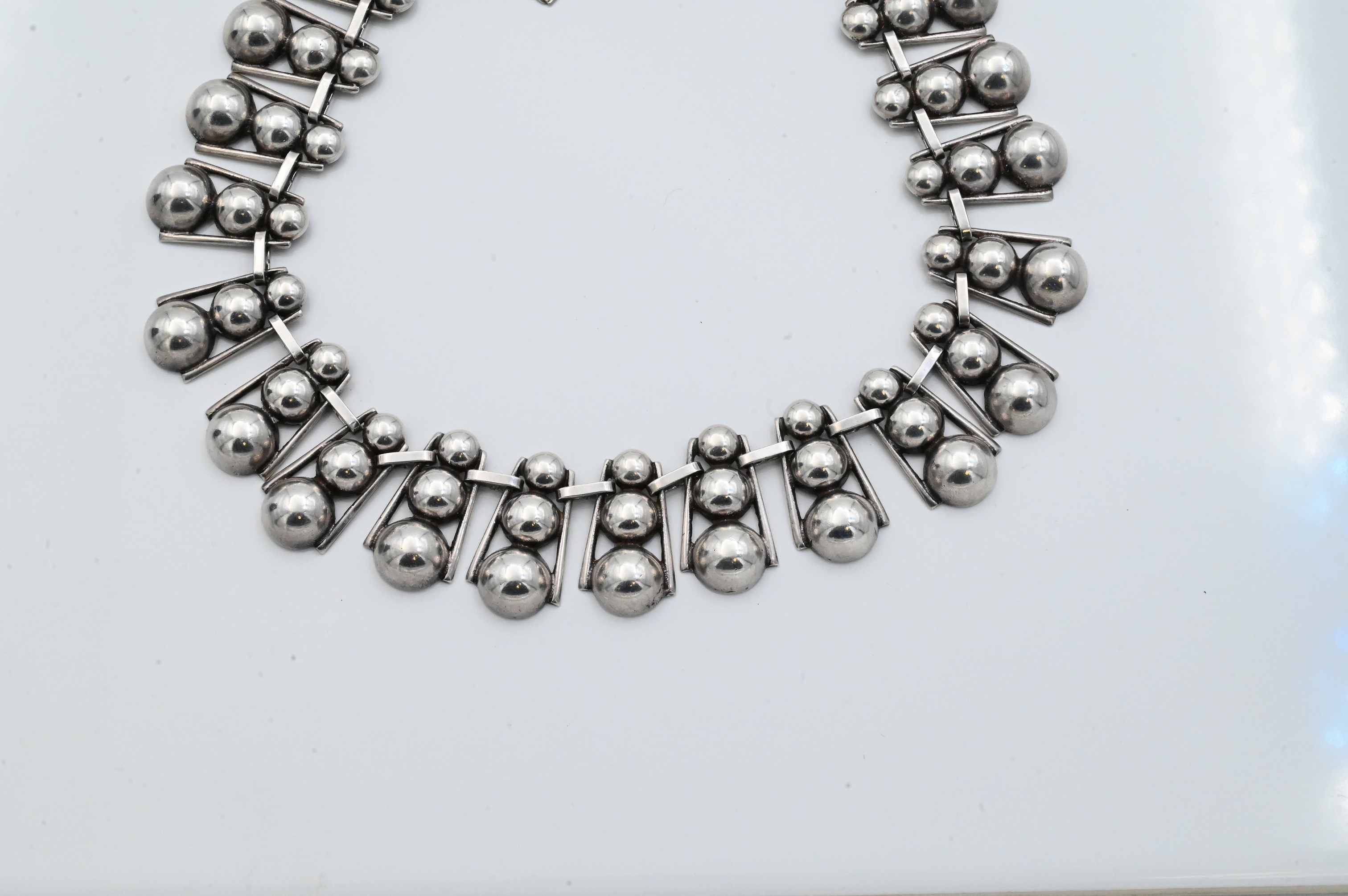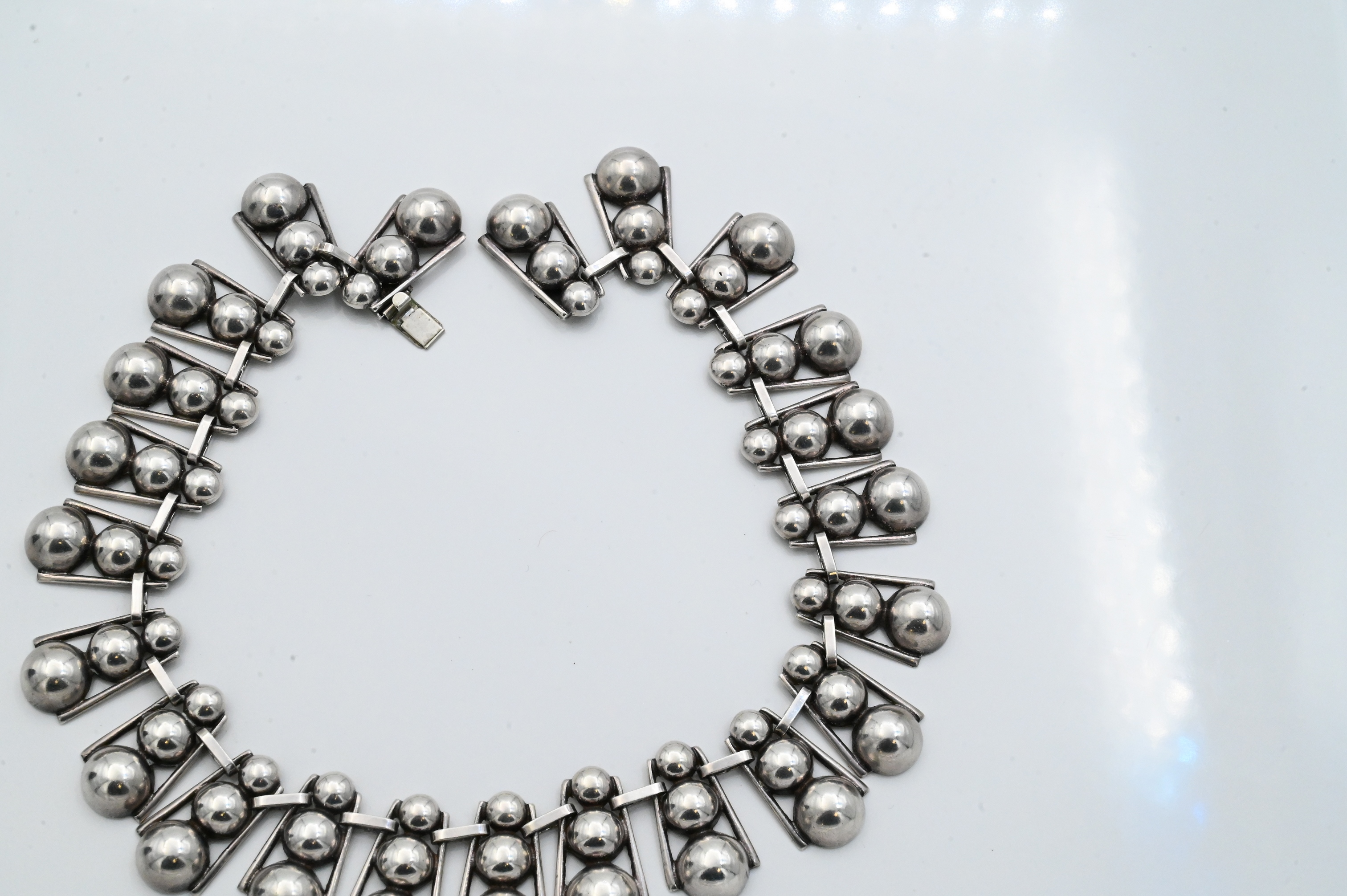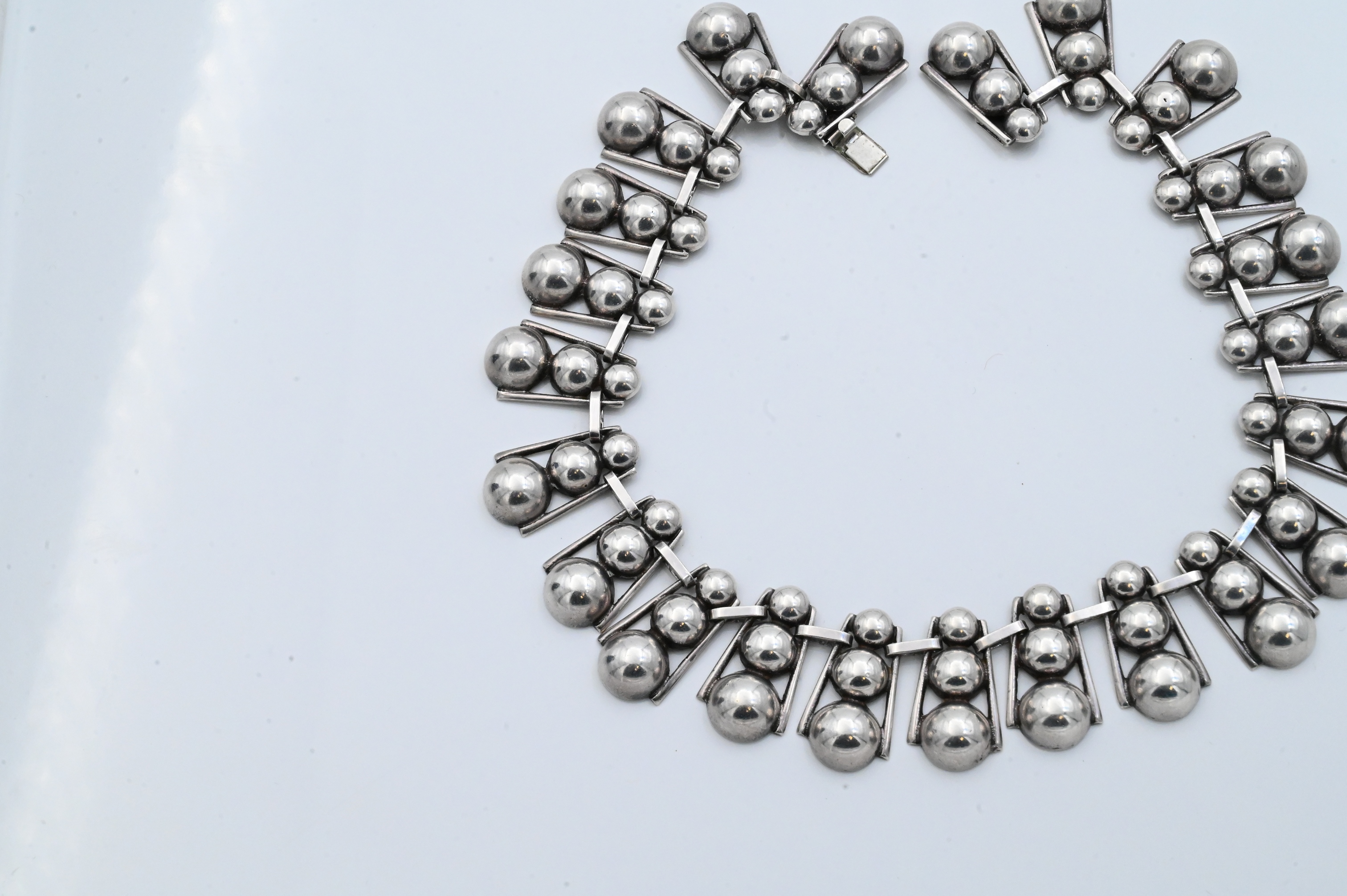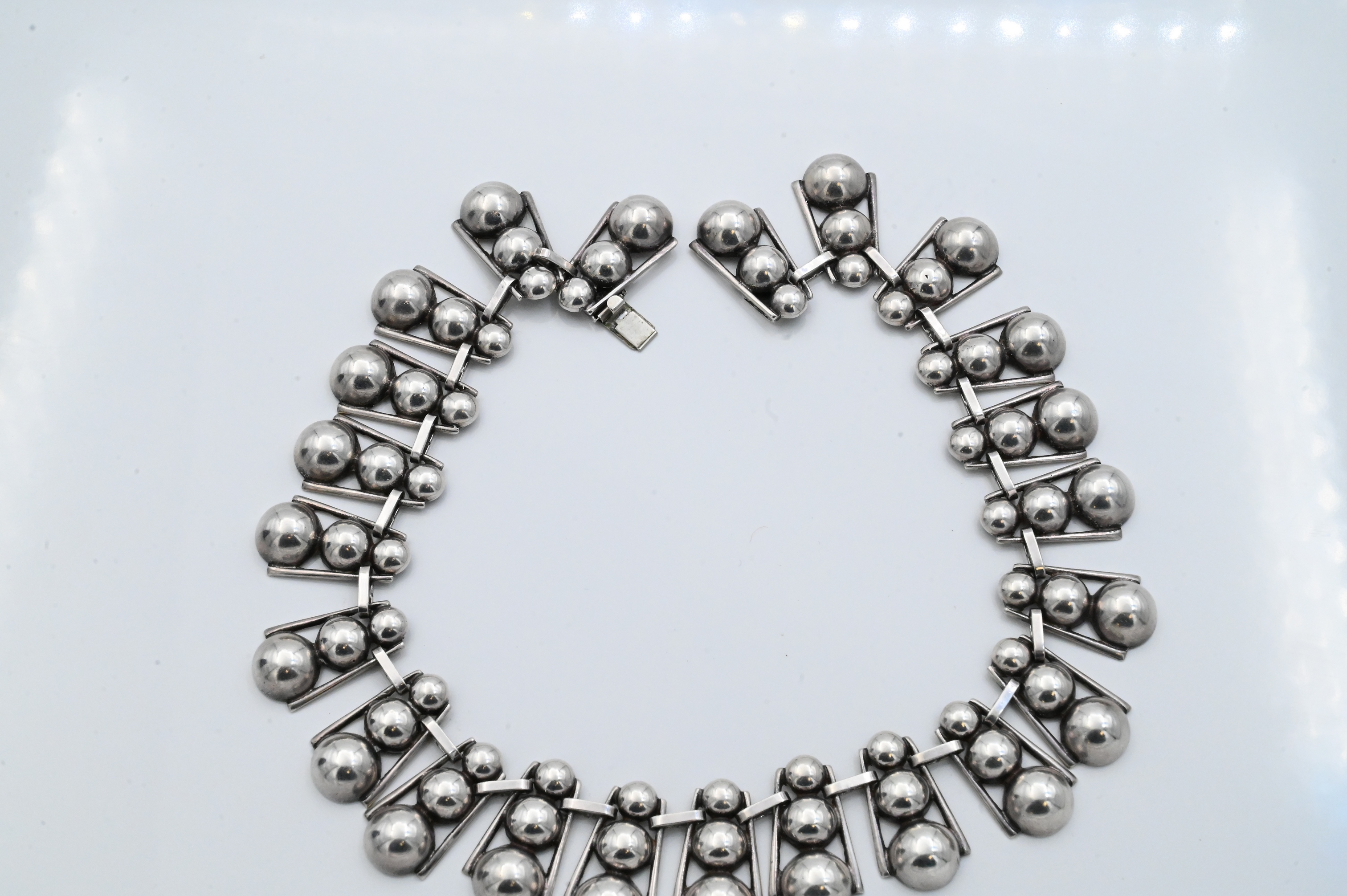 Composed of graduated double-bead links joined by angular connectors, marked Sterling on reverse.