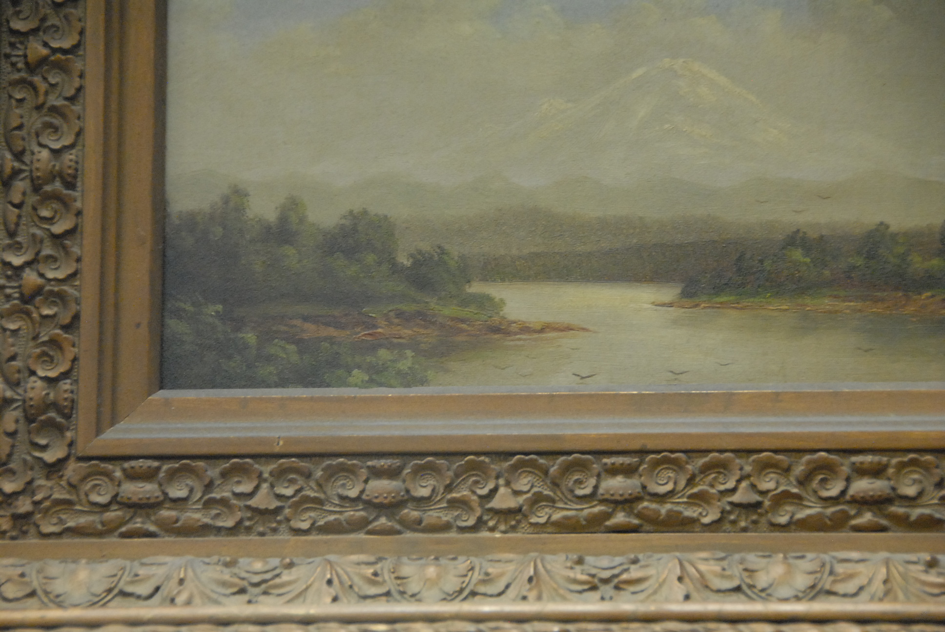 Oil on board landscape with lake in Victorian gold frame, unsigned, 6 1/2 x 12 1/2.