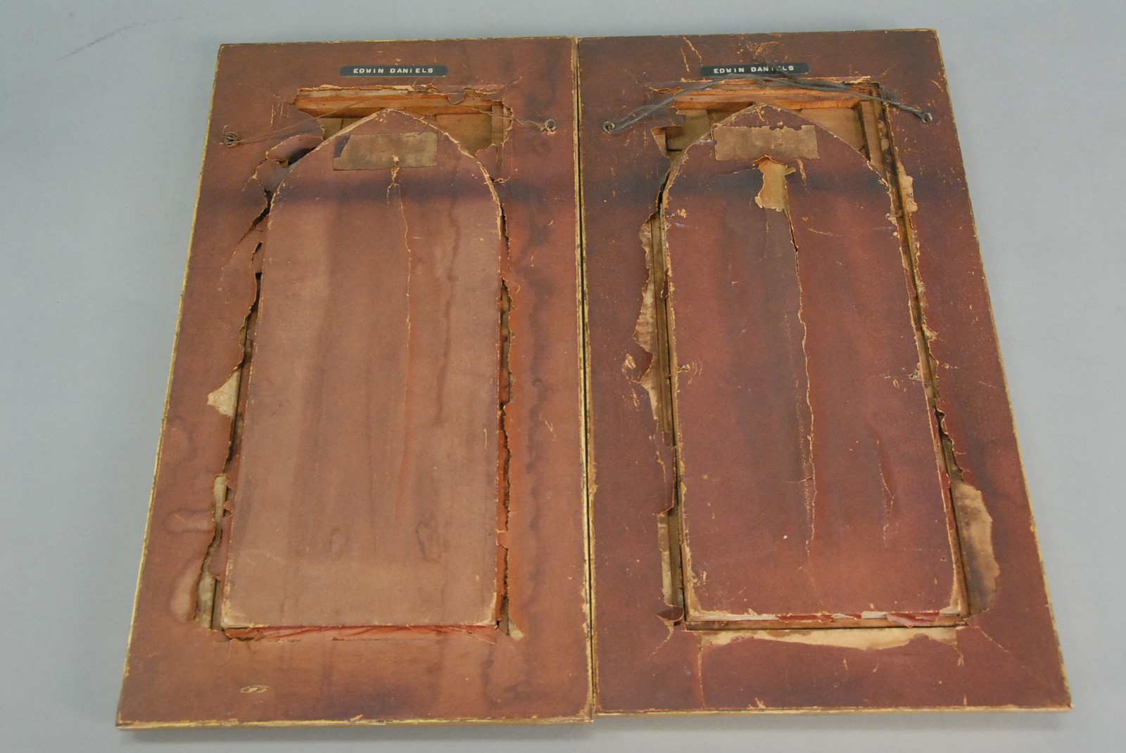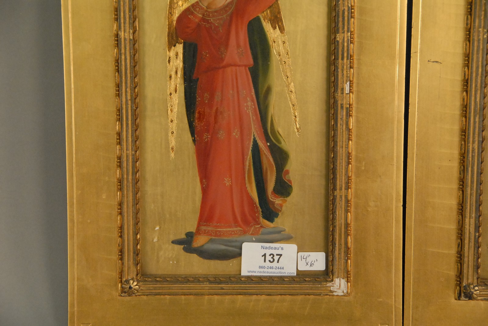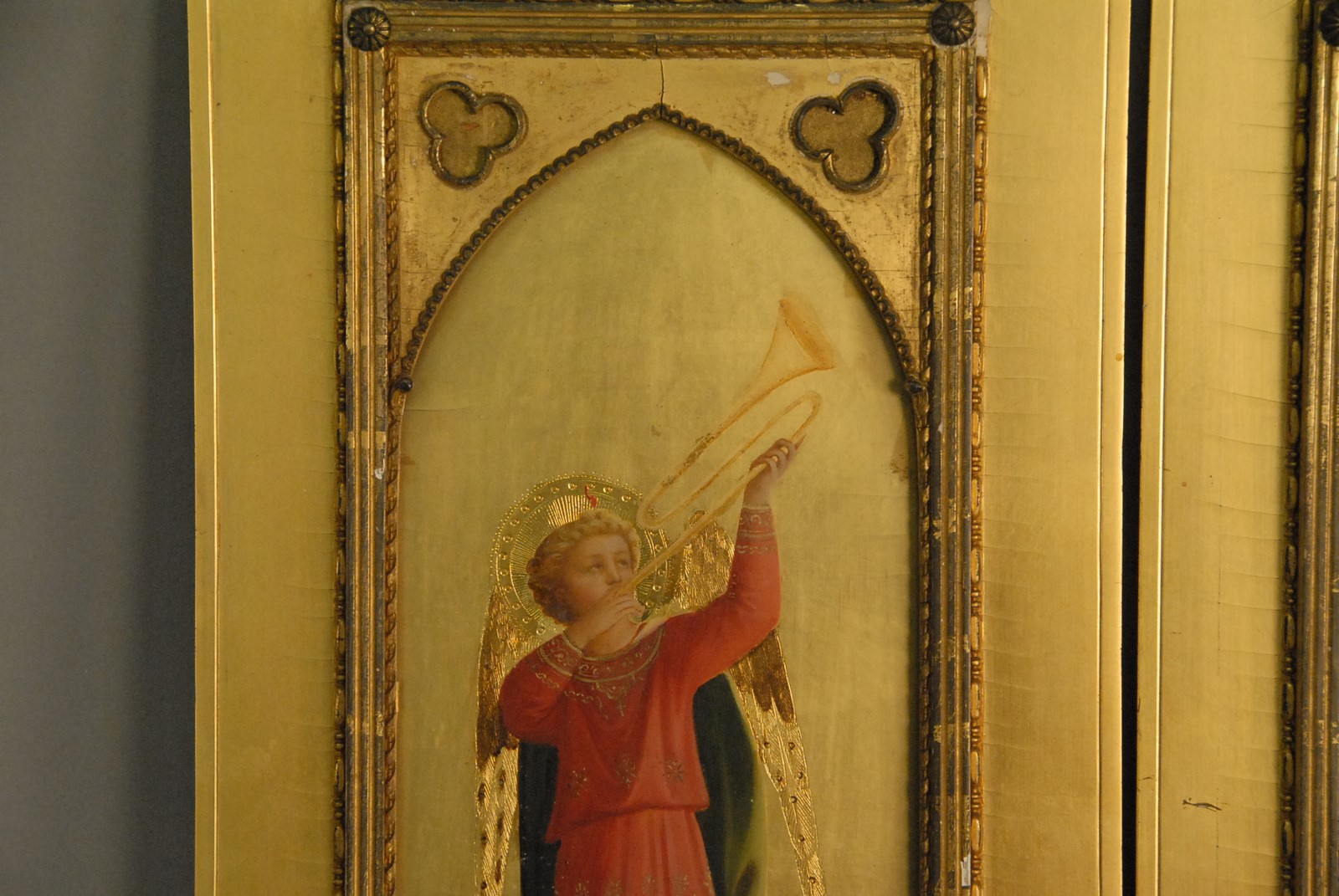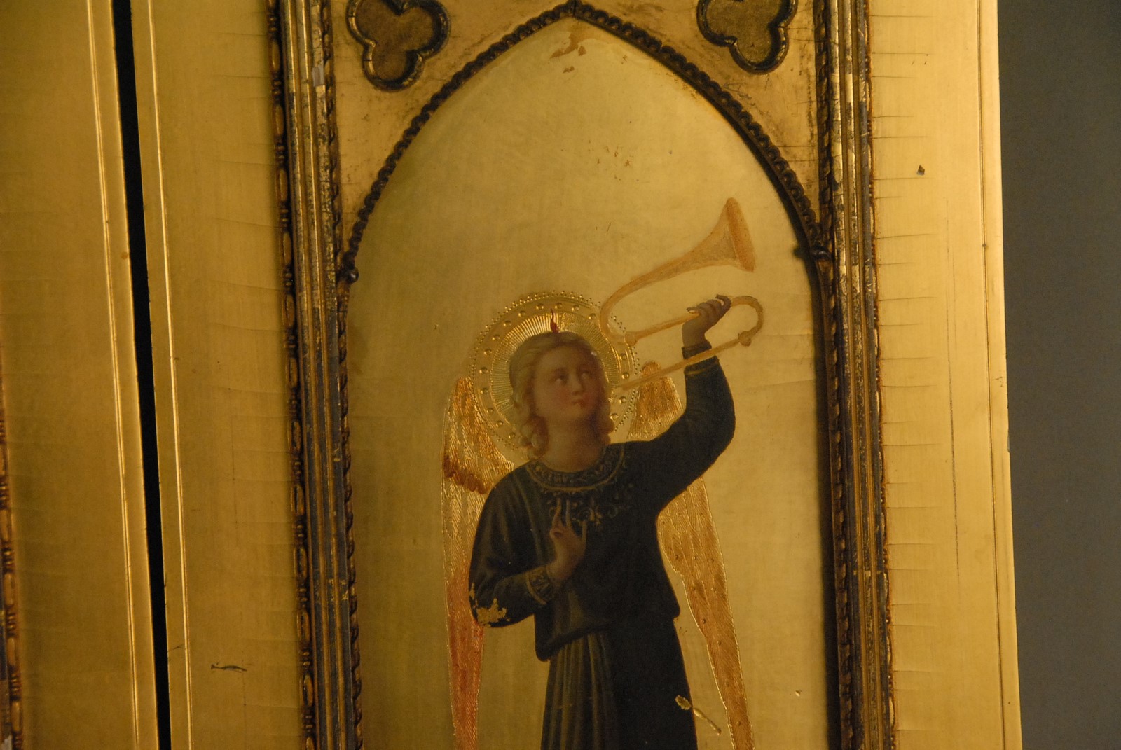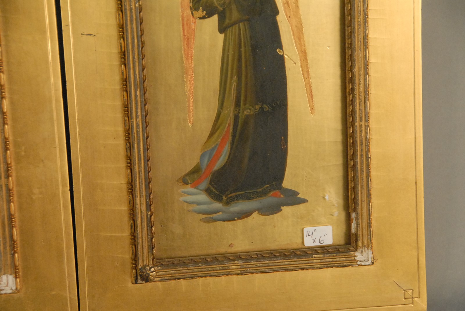 Pair of gilt wood plaques with polychrome painted angles playing trumpets. 14 x 6.
