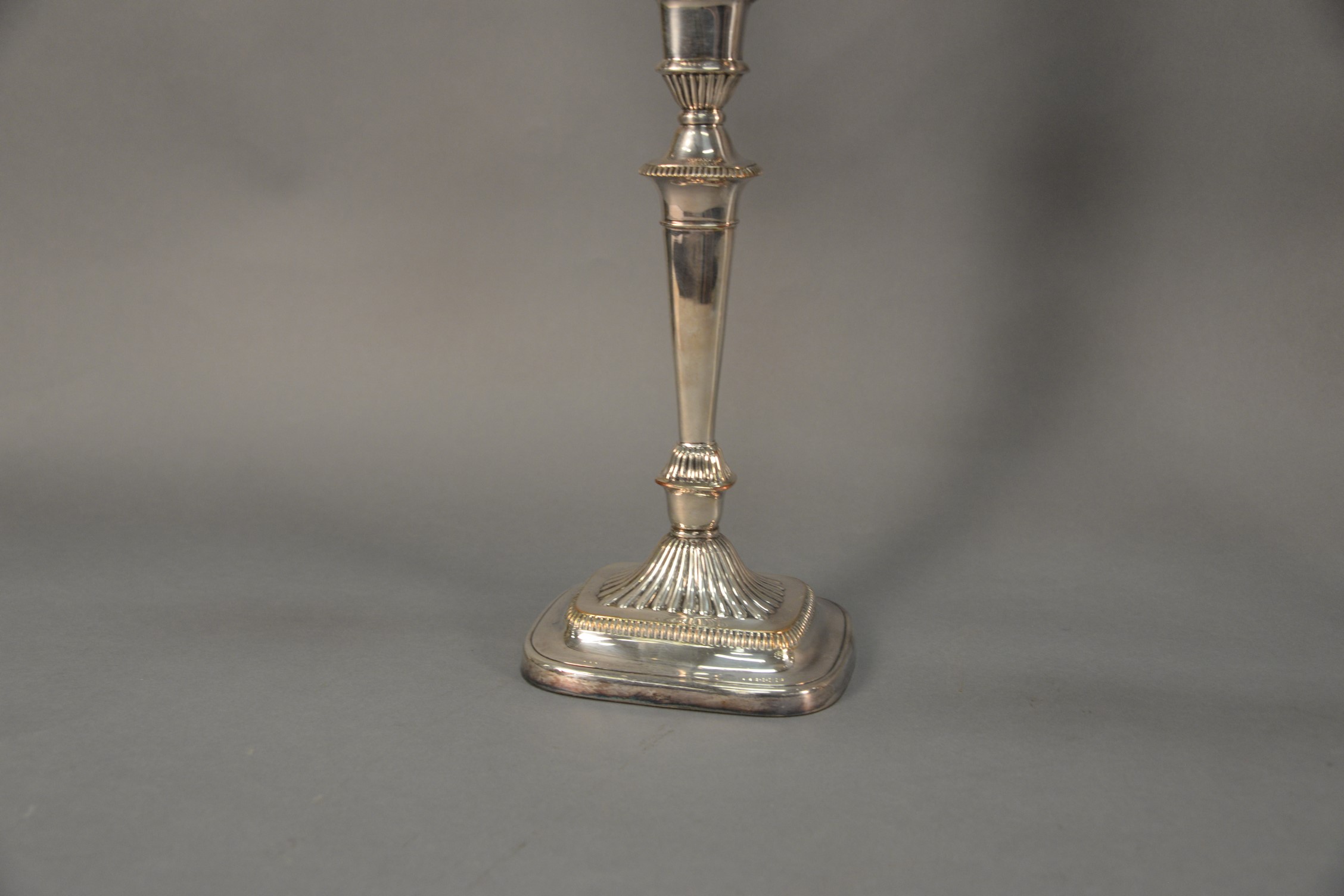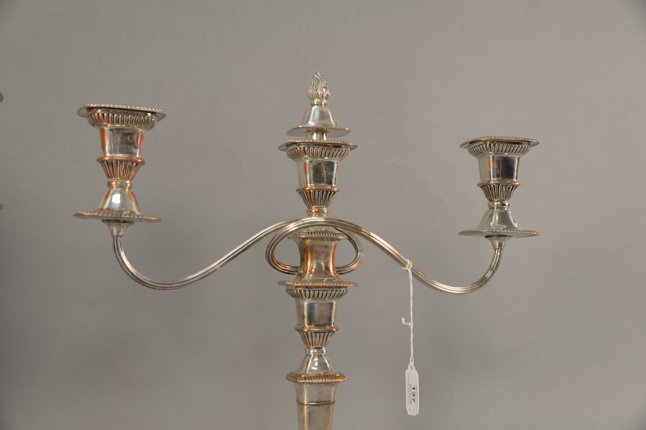 Lot 137: Pair of Sheffield silverplated candelabra having three lights on rectangular and gardrooned base. ht. 20 in. wd. 17 in.