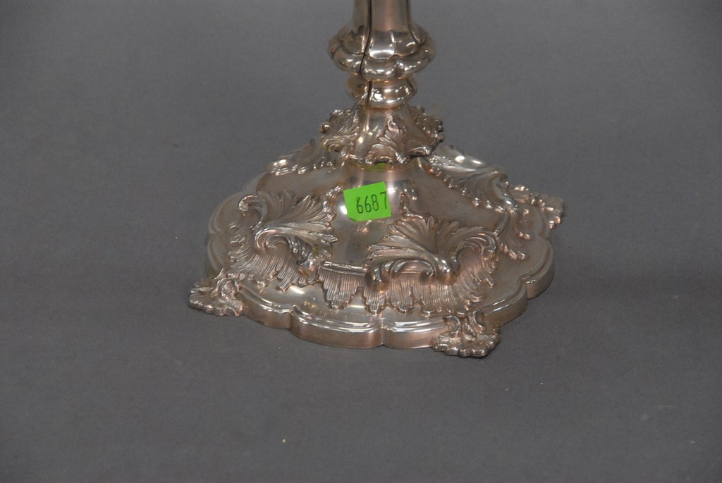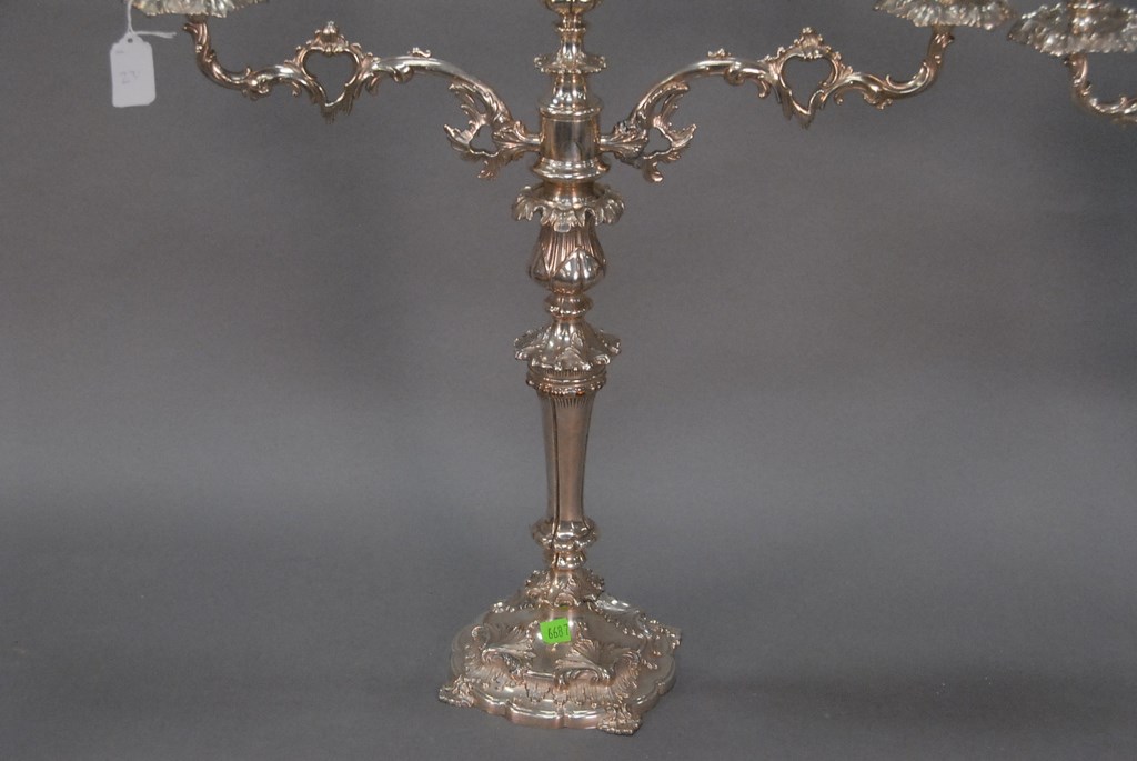 Lot 137: Pair of Sheffield silverplated candelabra Rococo style, each with three light on scalloped bases, 19th century slight crack in top…