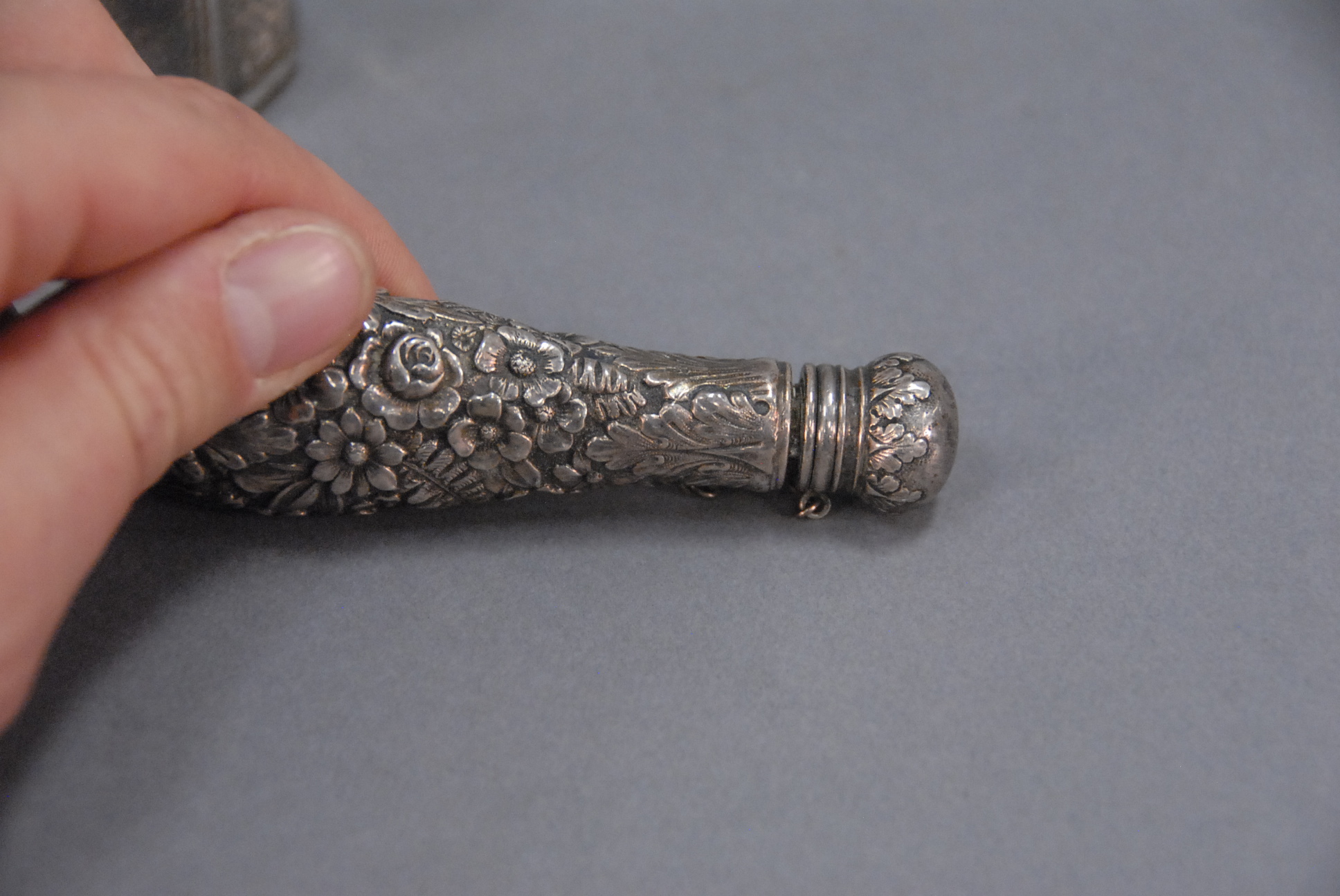 Lot 137: Three sterling silver pieces including Tiffany sterling perfume bottle, sterling card holder, and Jewish cup, 6.1 t oz.