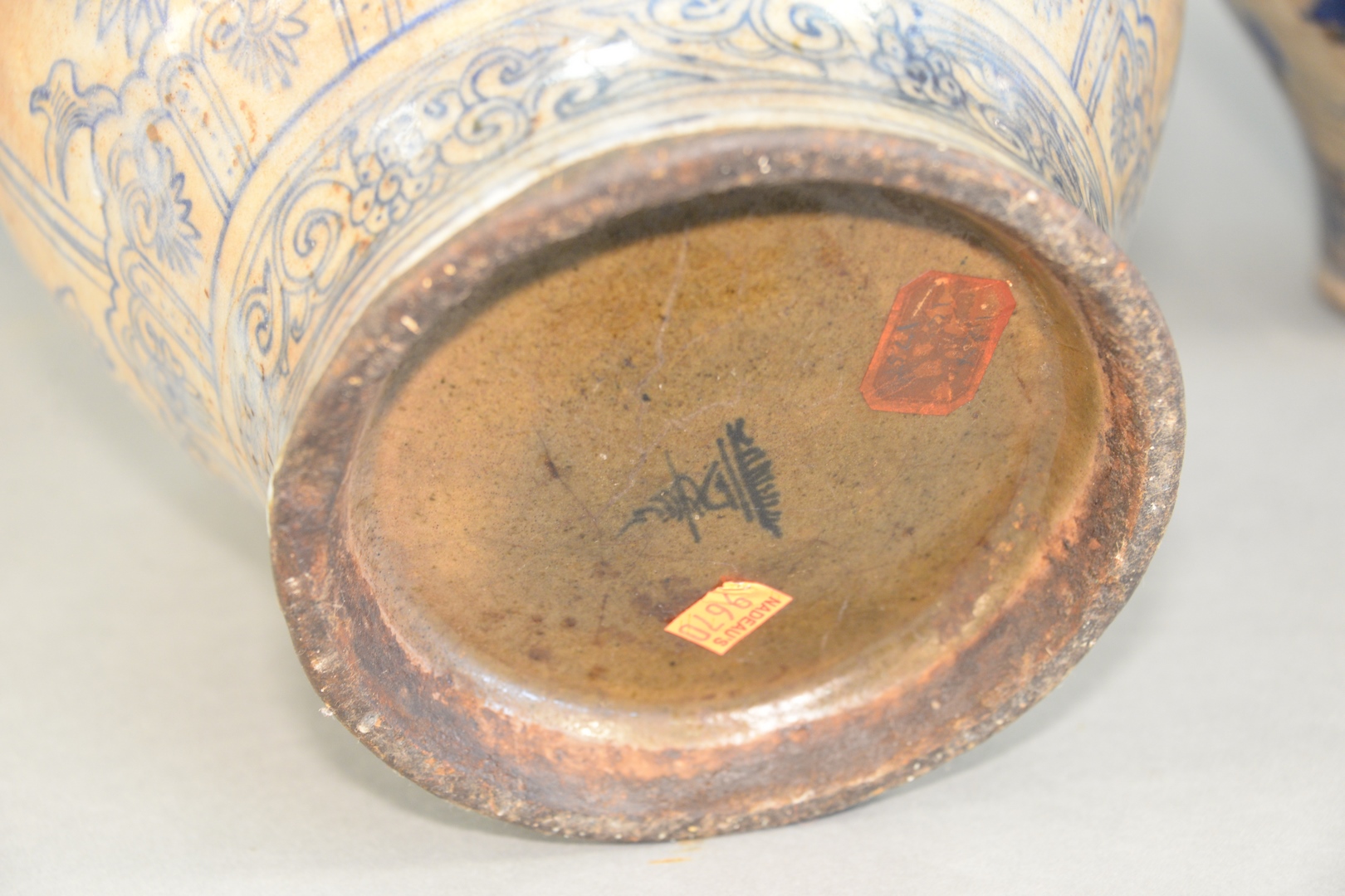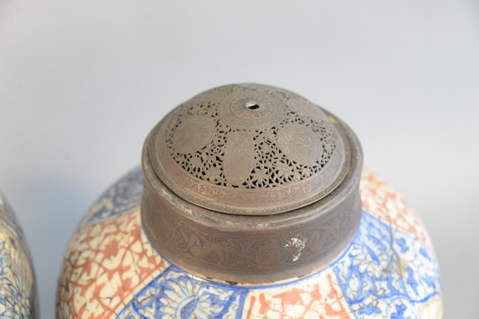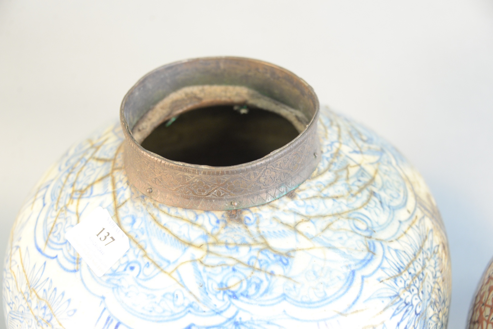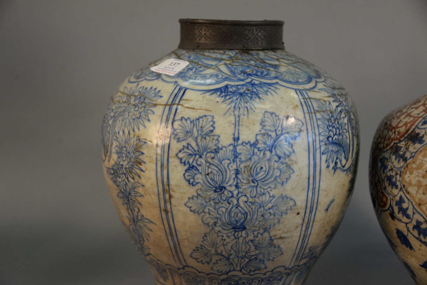 Lot 137: Two Early Jars in Persian Taste each fitted with metal collar, decorated with Asian motif height 12 1/2 inches and 13 1/2 inches Pro…