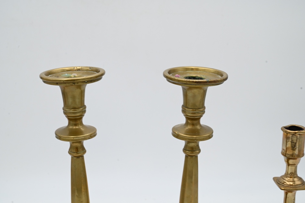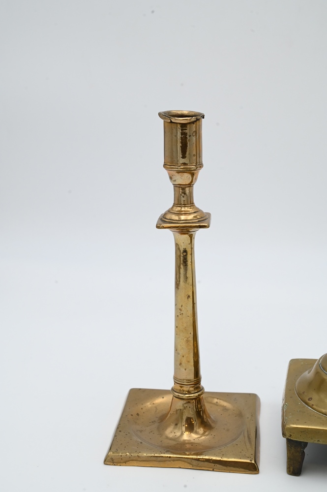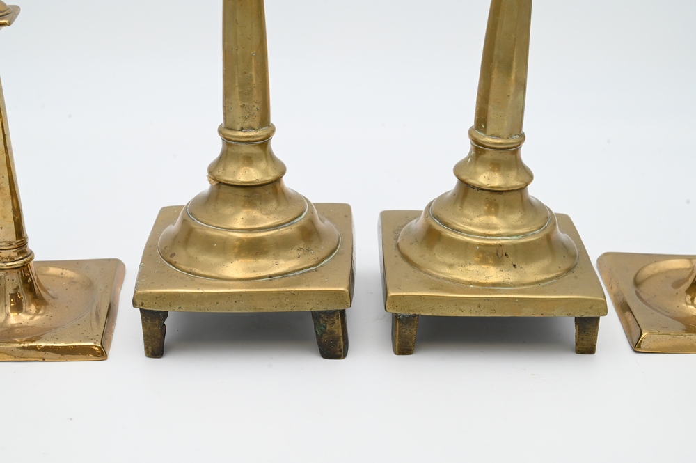 Lot 137: Two Pairs of Early Brass Candlesticks, having square bases on footed base, heights 9 1/2 and 12 inches.
