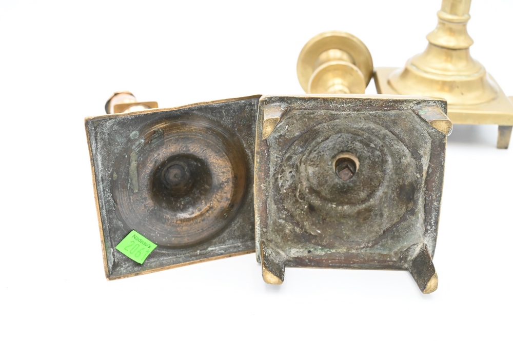 Two Pairs of Early Brass Candlesticks, having square bases on footed base, heights 9 1/2 and 12 inches.