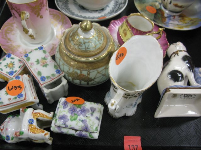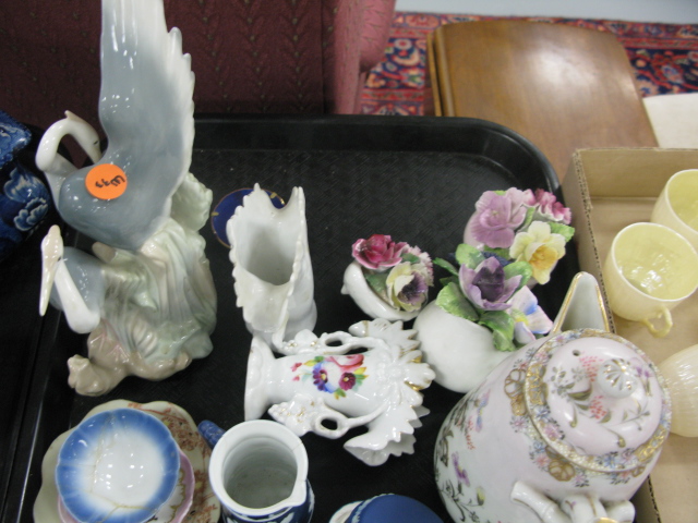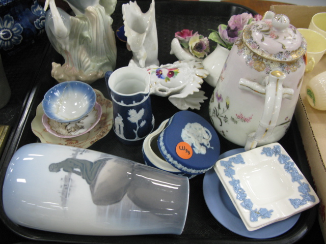 Two tray lots of porcelain and china to include cups, saucers, teapot, Wedgwood, figures etc