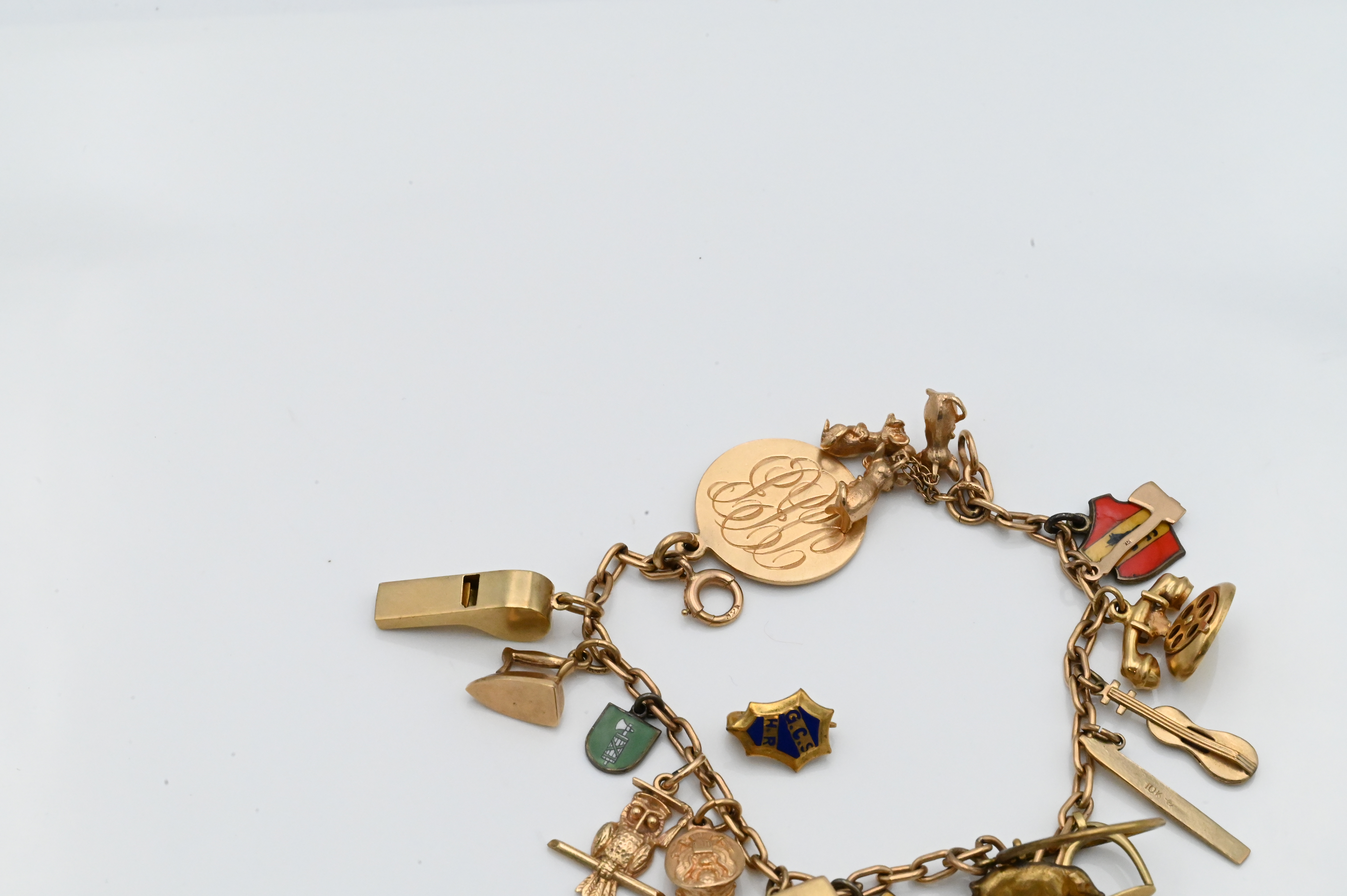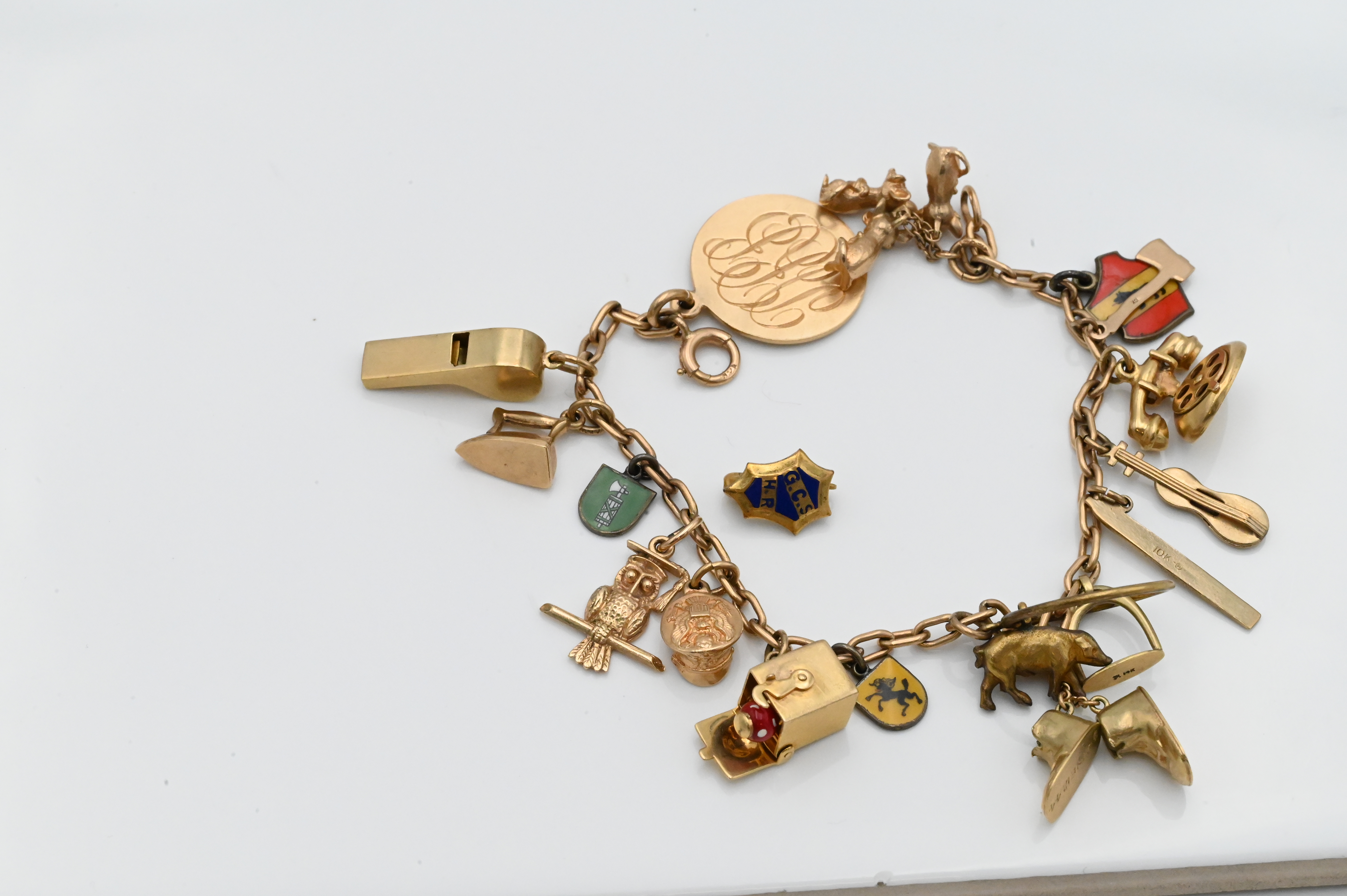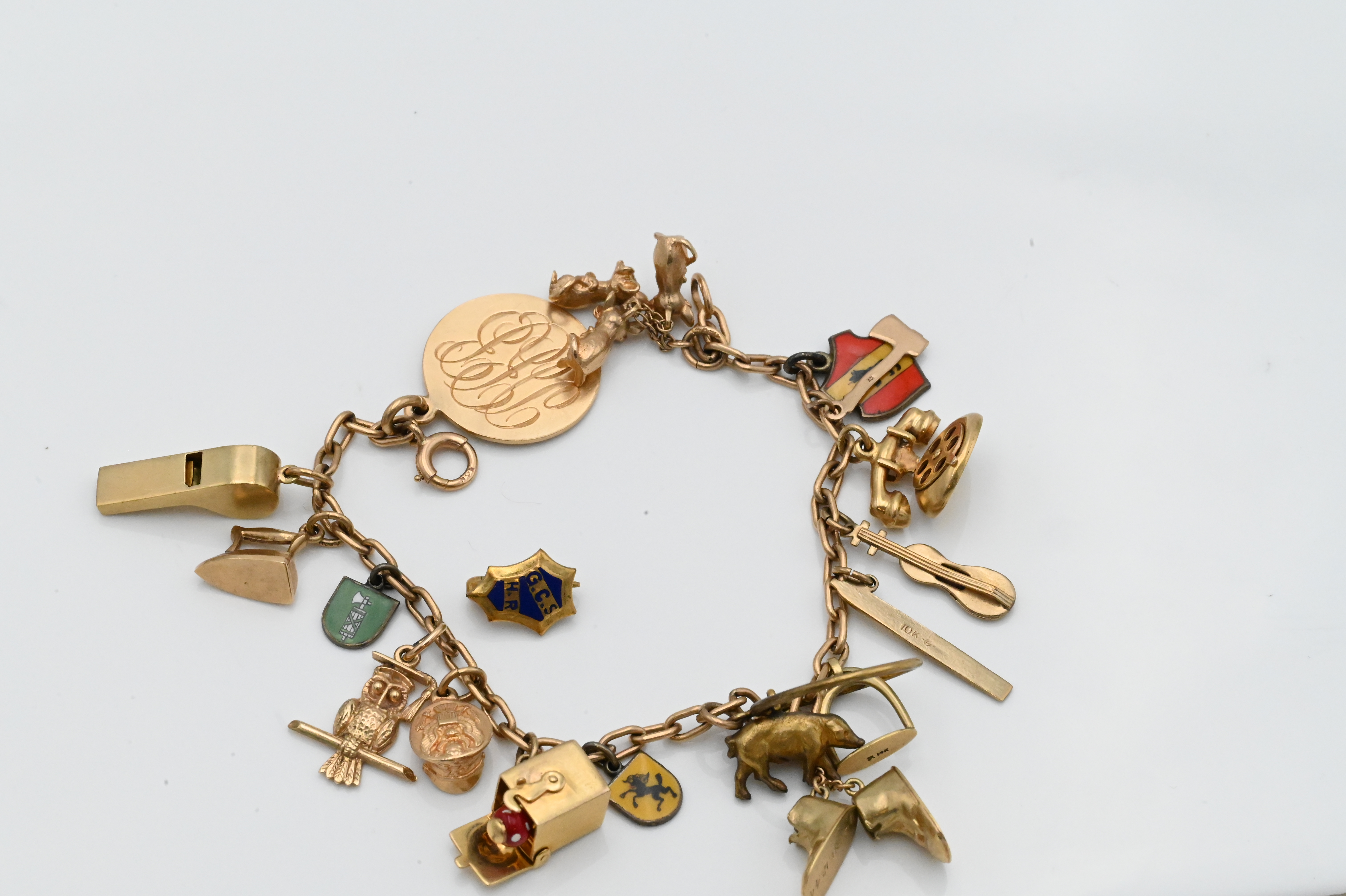 14 Karat Yellow Gold Bracelet, having mostly 14 karat gold charms, 29.2 grams.
