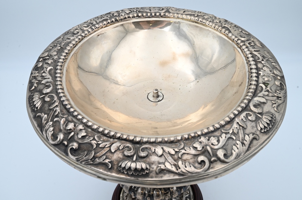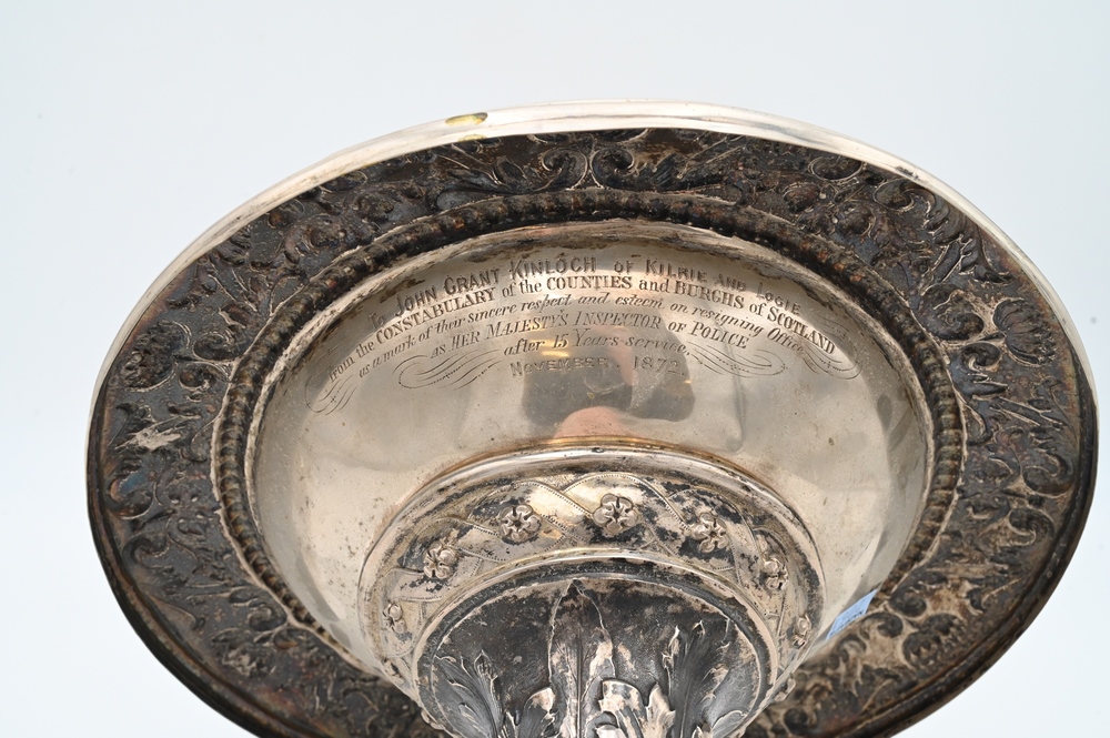 Lot 138: Continental Silver Compote, monogrammed To John Grant as her Majesty’s Inspector of Police 1872, handles missing, height 13 1/2 inches, net 49 t.oz. without base.