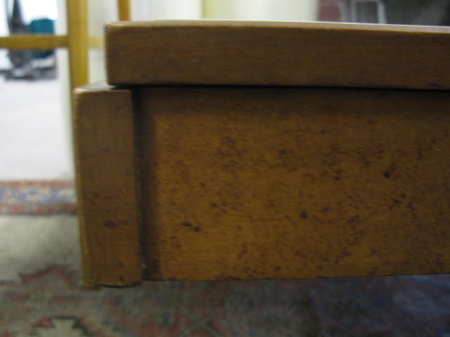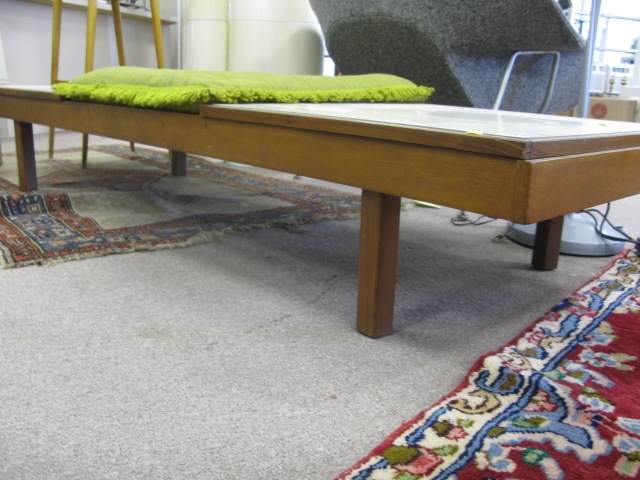 Danish modern coffee table/bench marked Brown & Saltman, CA with two formica white top ends