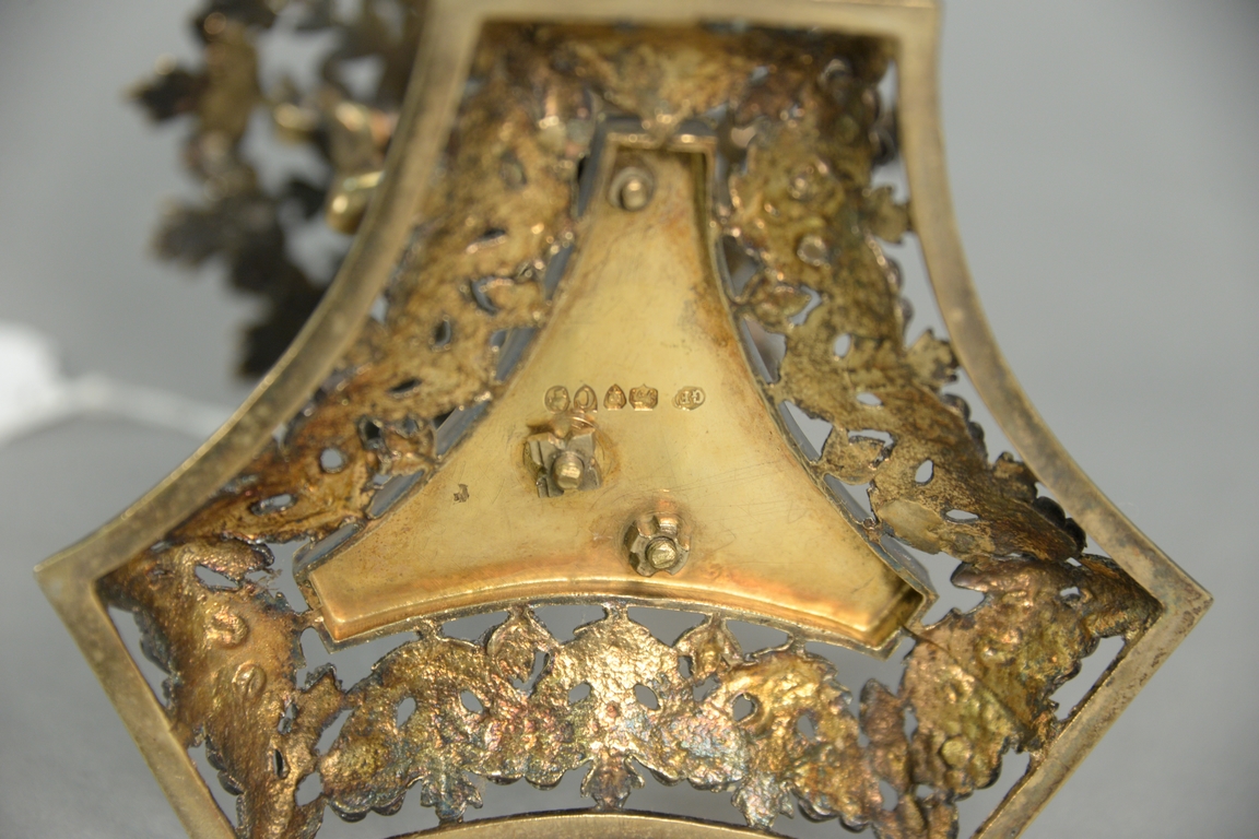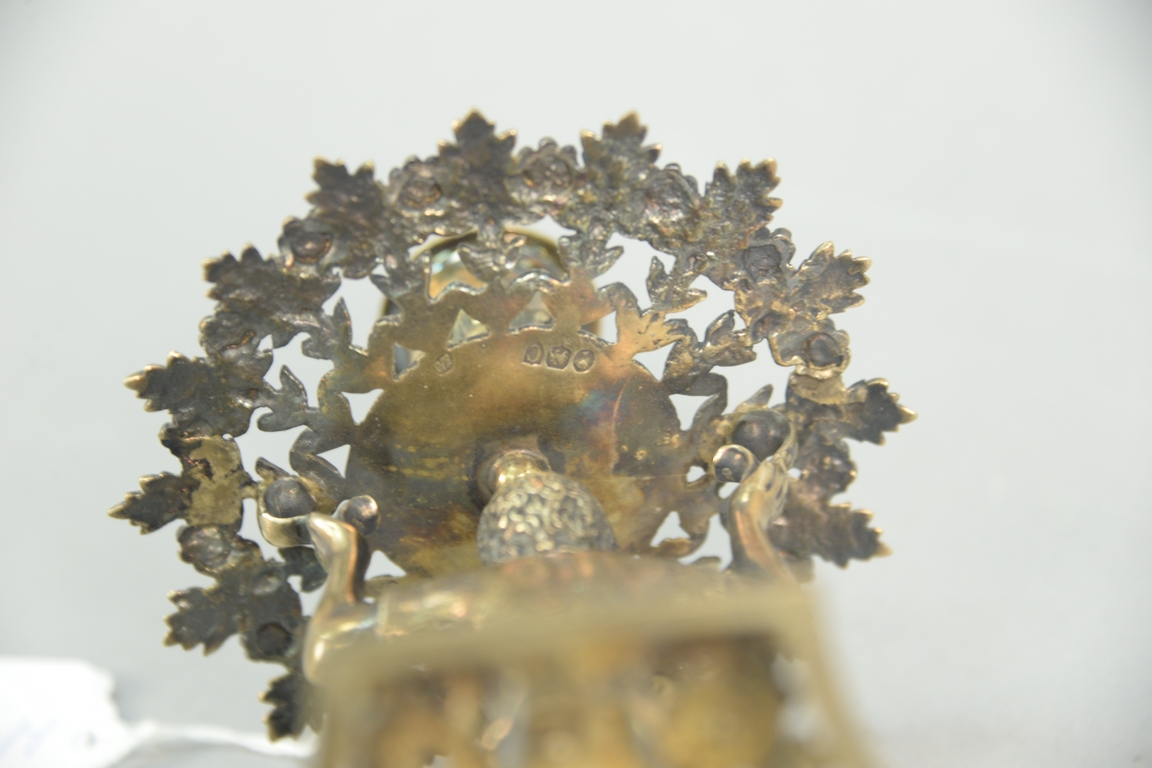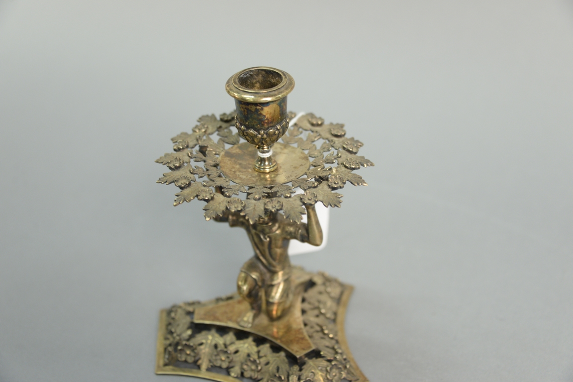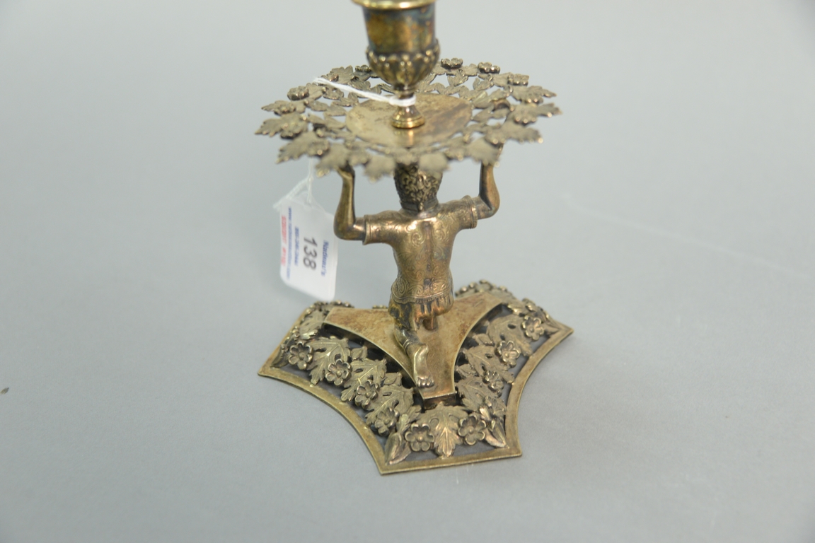 Lot 138: English silver candlestick with reticulated drop guard held by blackamoor kneeling figure on triangular reticulated base. ht. 6in. P…