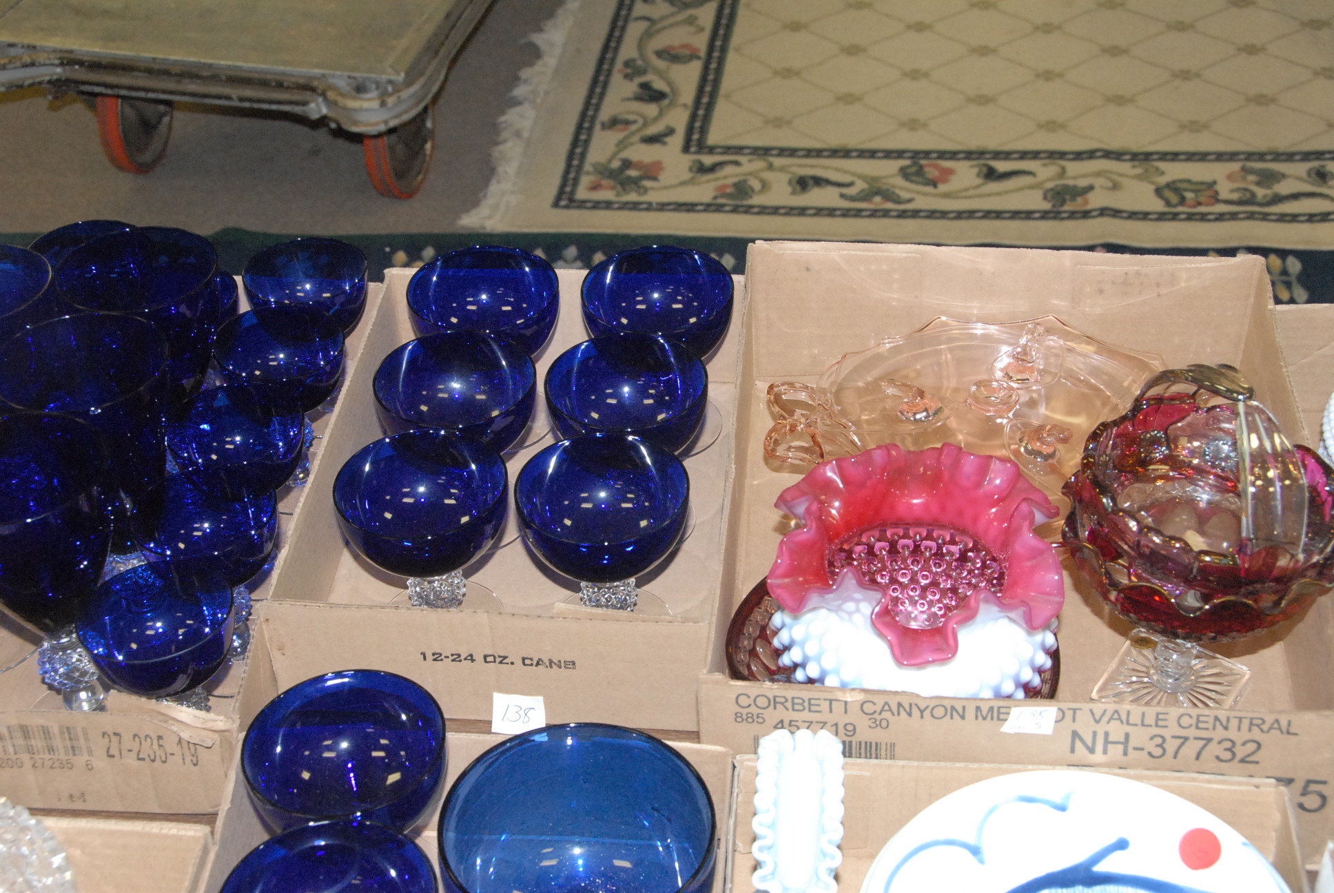 Five box lots including Fenton glass, depression glass, porcelain, and cobalt blue glass.