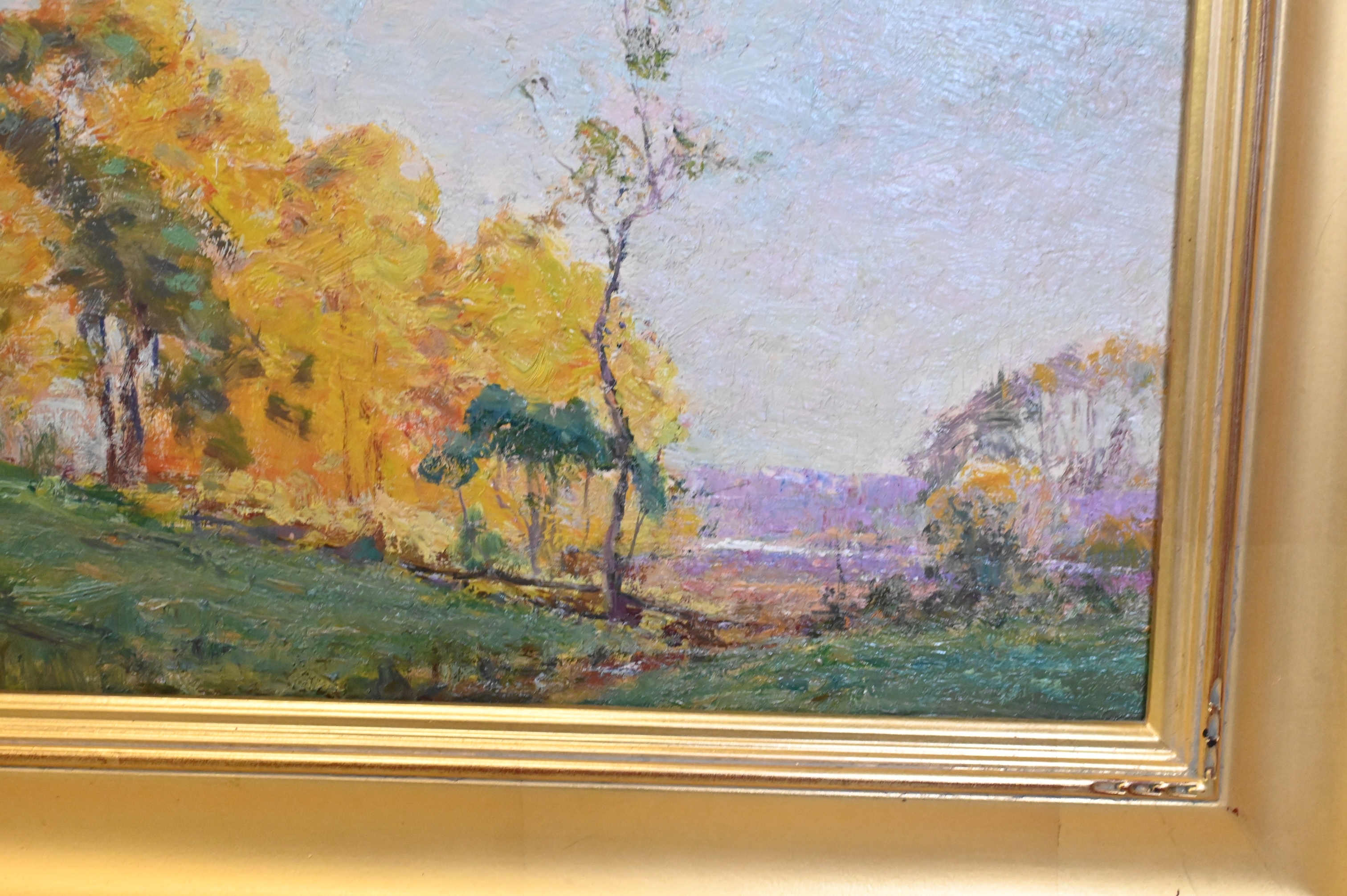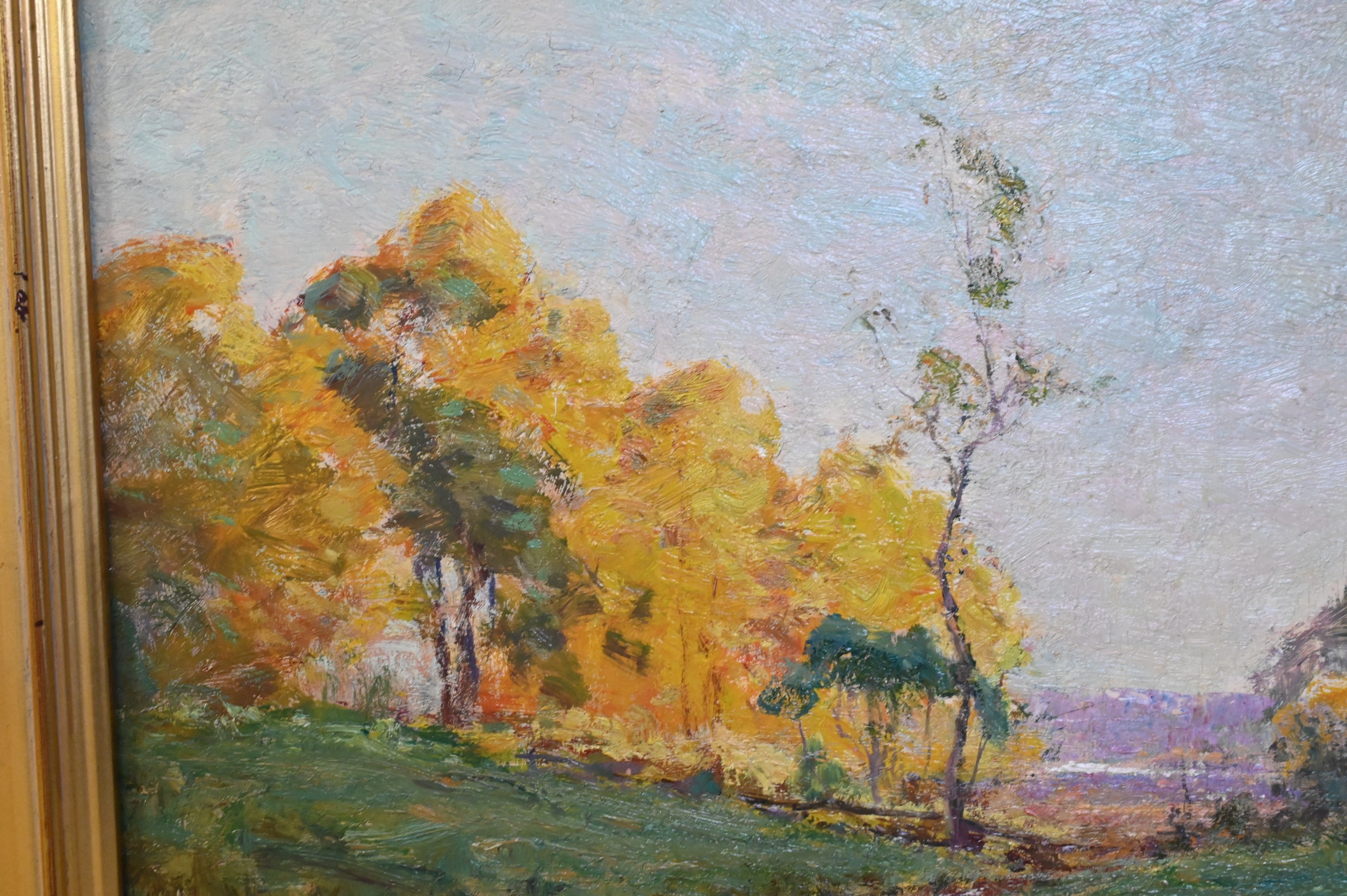 Oil on board depicting a stand of tulip trees in peak fall coloration, rendered with warm autumnal tones and confident, impressionistic brushwork.