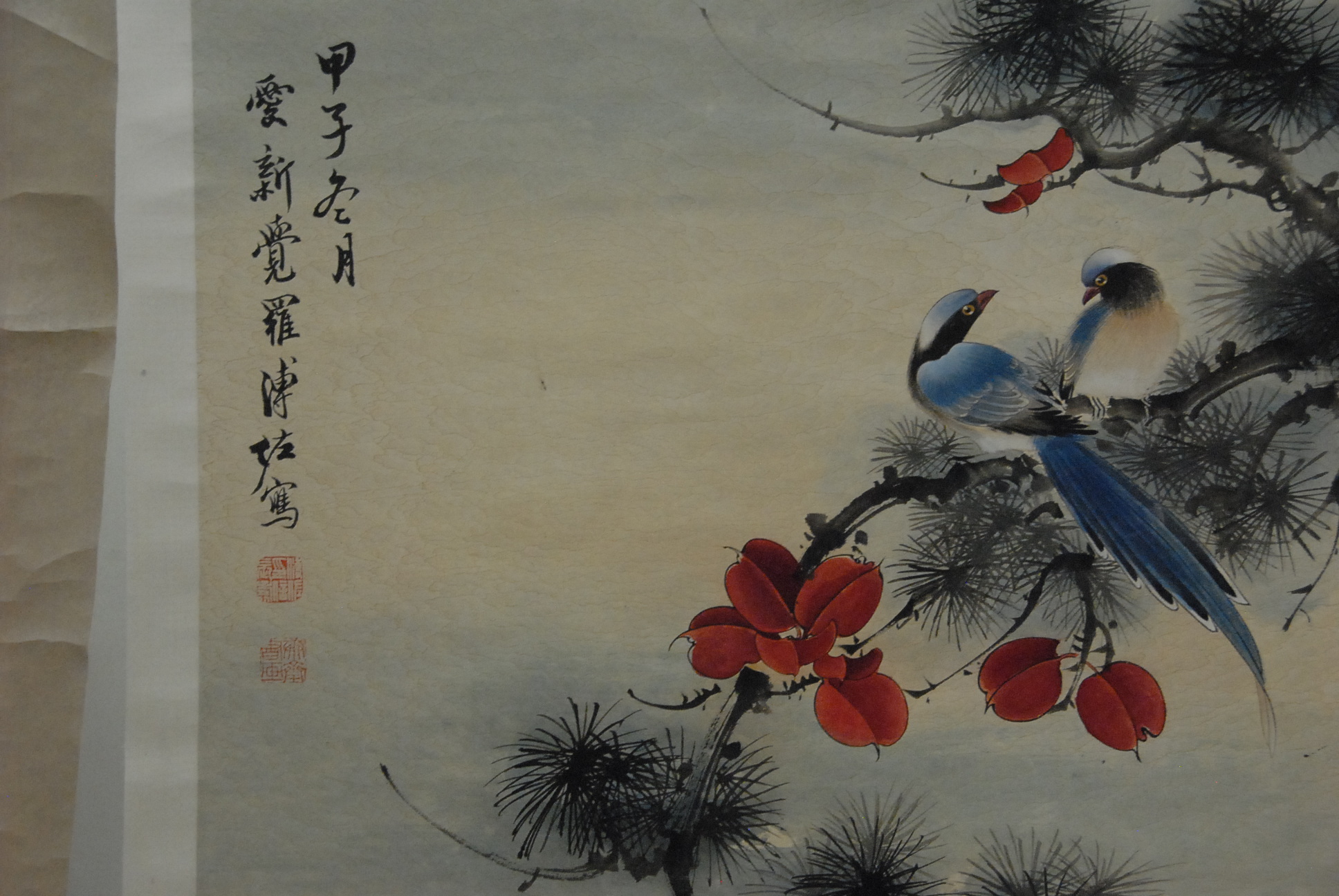 Group of four oriental scrolls to include a watercolor on paper of birds in a tree with flowers, watercolor on paper of a pine tree, watercolor on paper of two rabbits, and a double watercolor on paper, landscape both.
