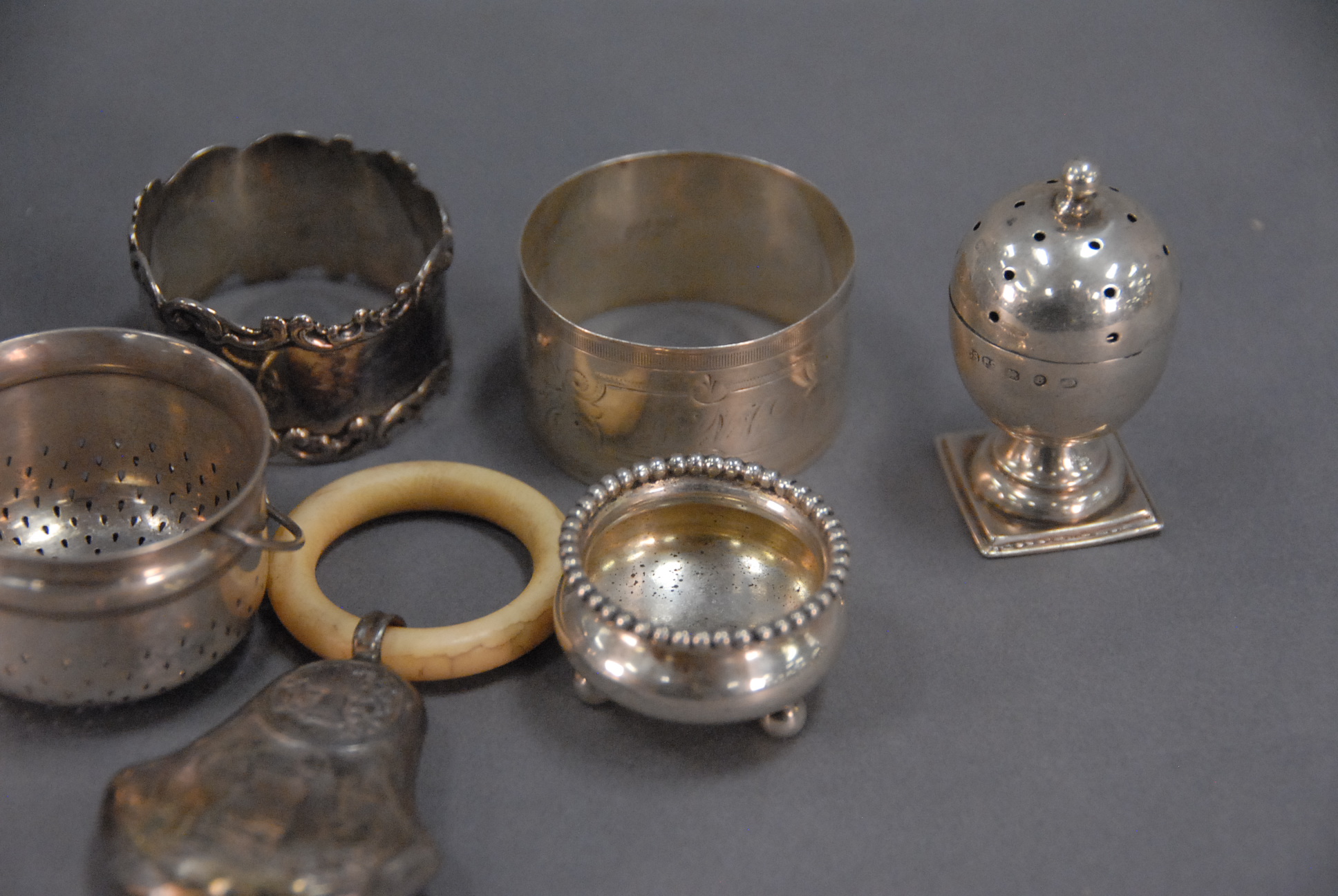Lot 138: Group of silver items to include a Victorian baby rattle with ivory ring, sterling revere style bowl, two napkin rings, two tea hold…