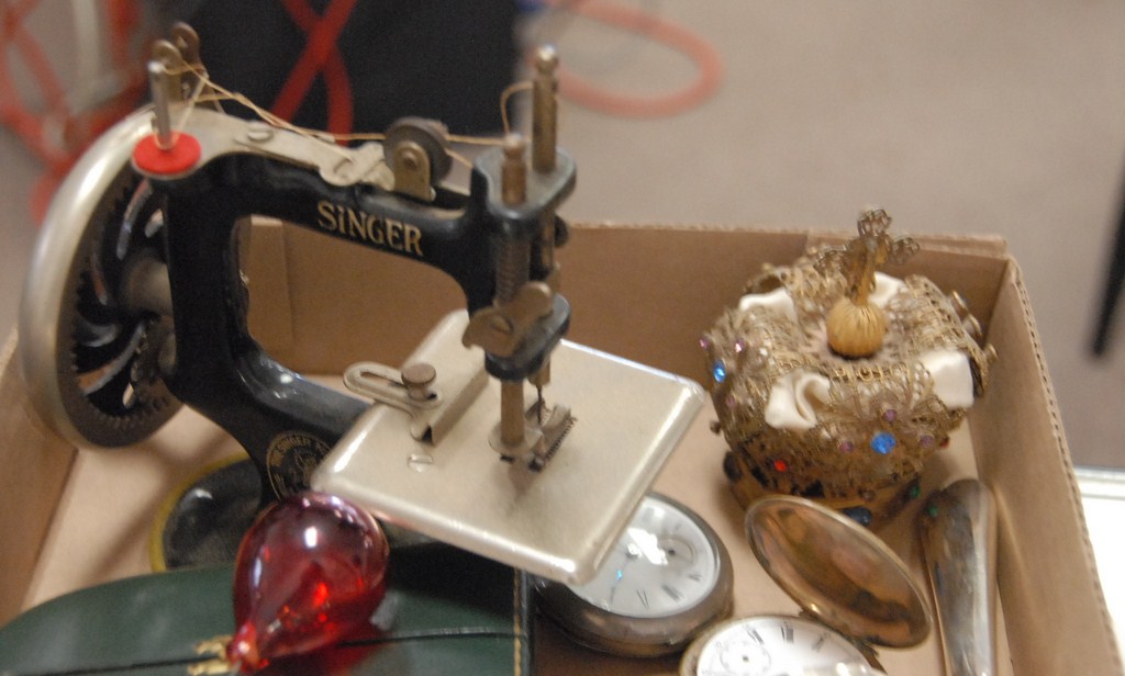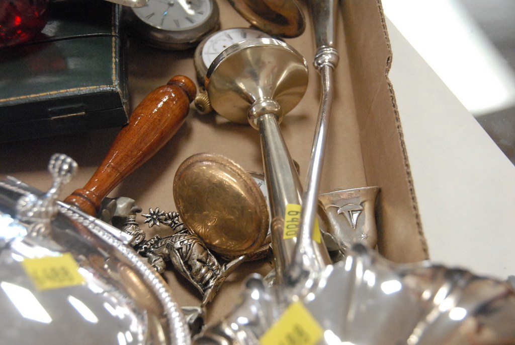 Group to include three pocket watches, small decorative crown, miniature sewing machine, group of Hudson Fine Pewter figures, and some misc. silverplate items. Provenance: Estate of Judy Gengras McDonough of West Hartford, CT.